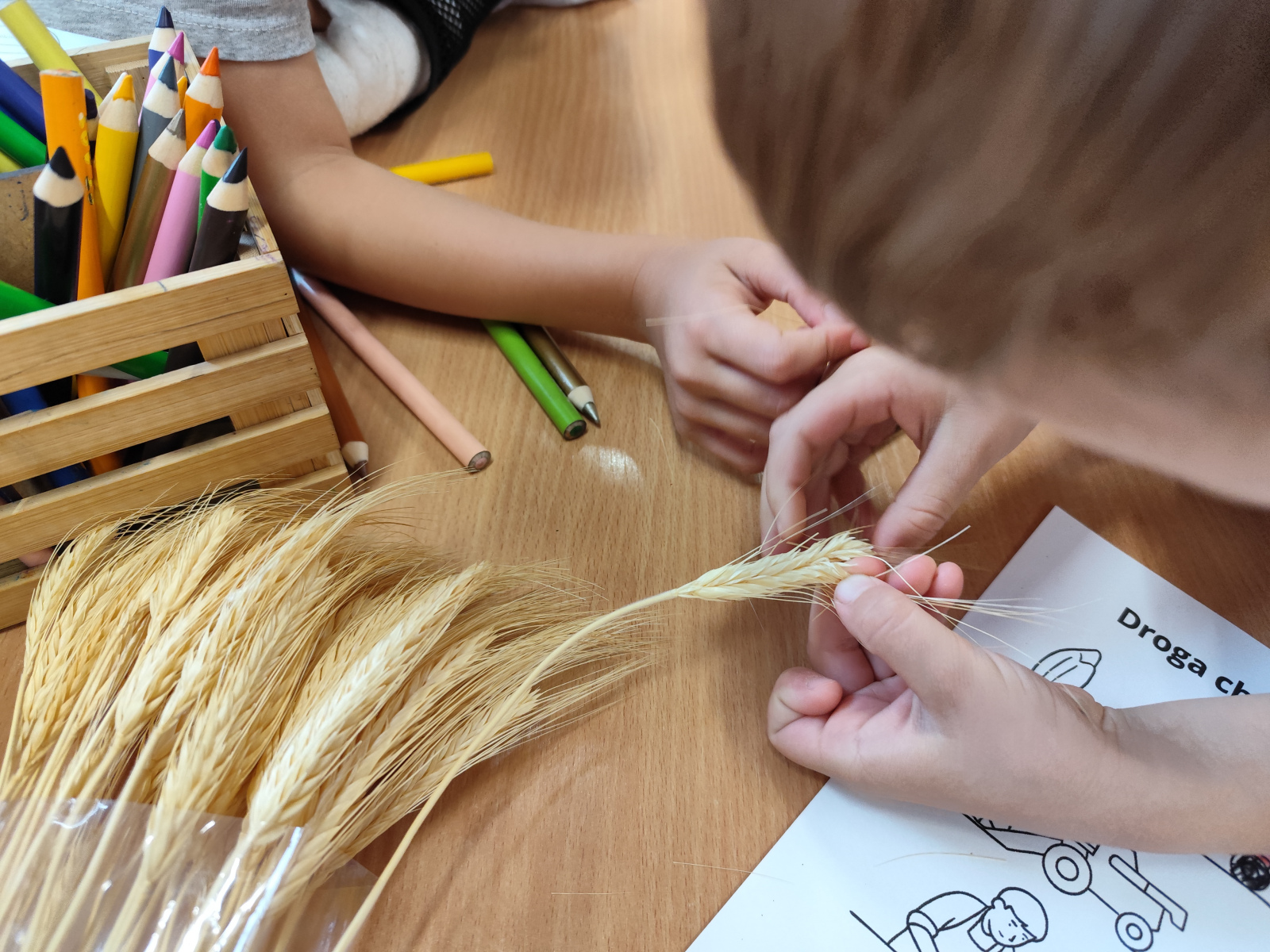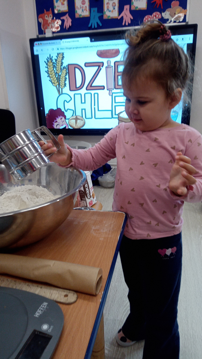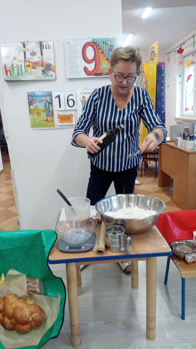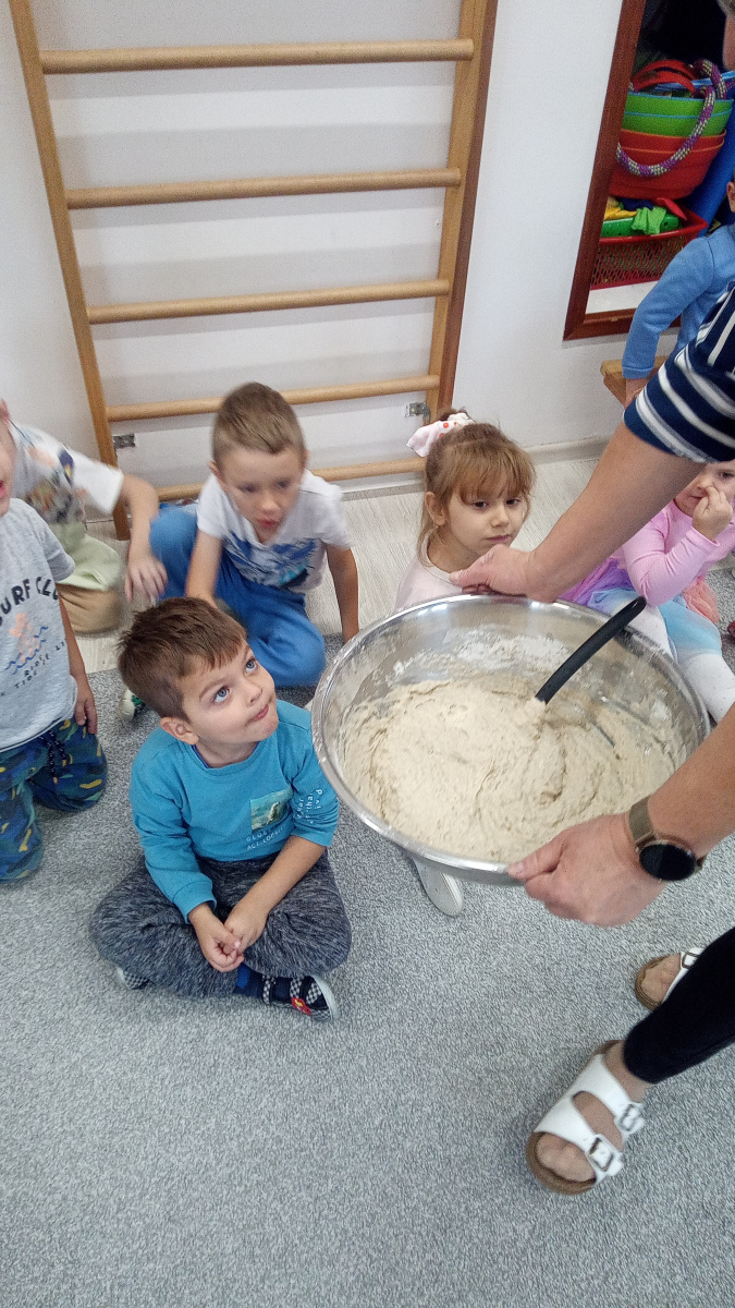 16 października w naszym przedszkolu zapachniało… chlebem! Z okazji Dnia Chleba rozmawialiśmy o tym, skąd pochodzi chleb, jak powstaje i dlaczego warto go szanować. Dzieci z wielkim zaangażowaniem oglądały różne rodzaje pieczywa, poznawały składniki potrzebne do wypieku oraz… same zamieniły się w małych piekarzy! Było wyrabianie ciasta, formowanie chleba i dużo radości! Nie zabrakło też wspólnej degustacji świeżo upieczonego chleba — smakował wyjątkowo, bo przygotowany własnoręcznie i z sercem. To był piękny, pachnący dzień pełen nauki i wspólnego świętowania.