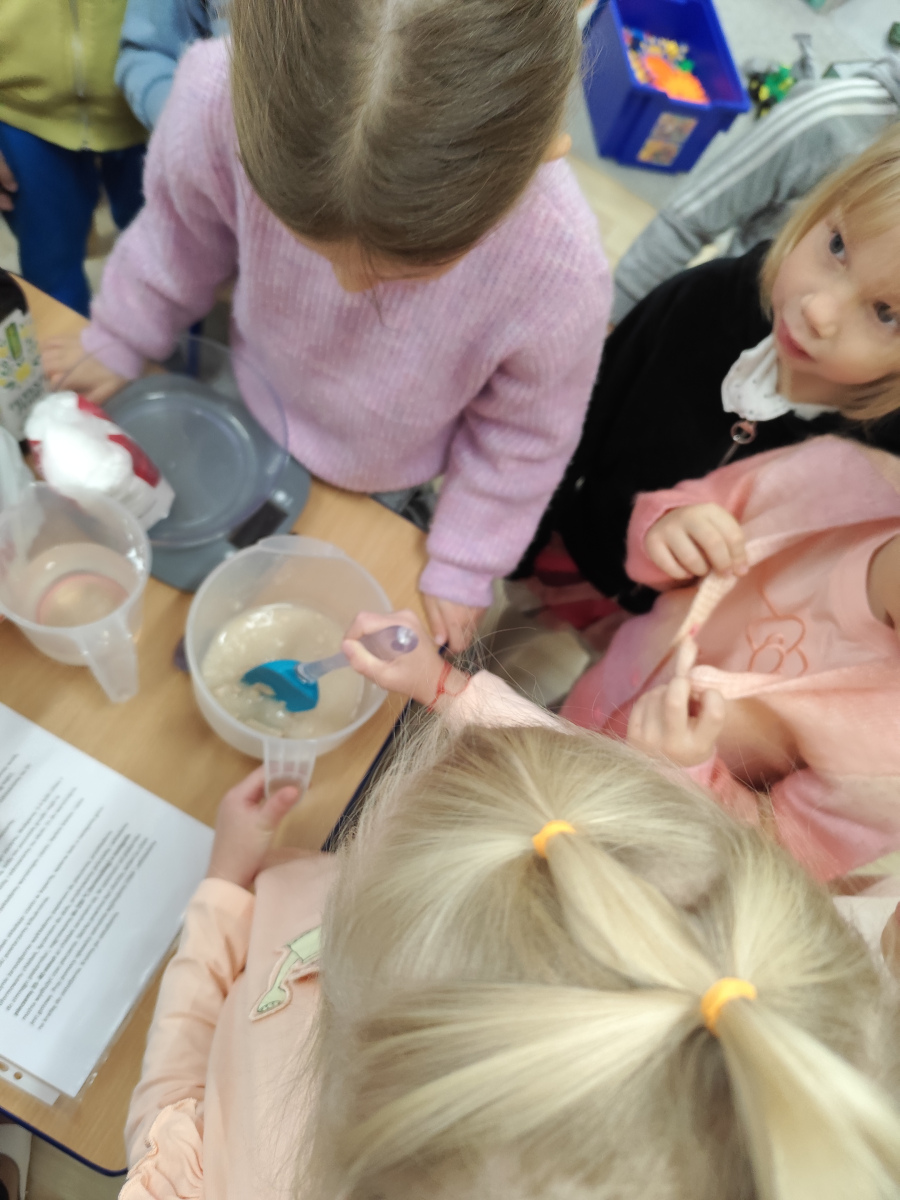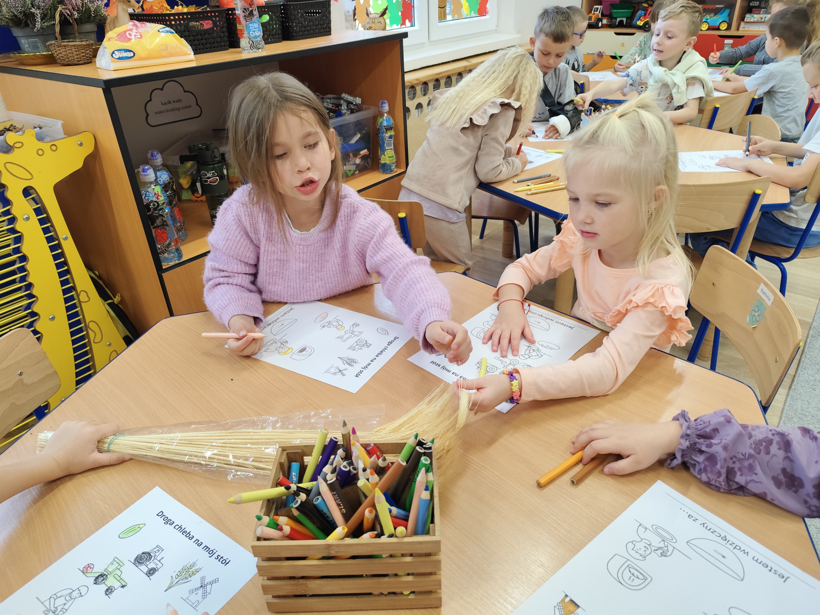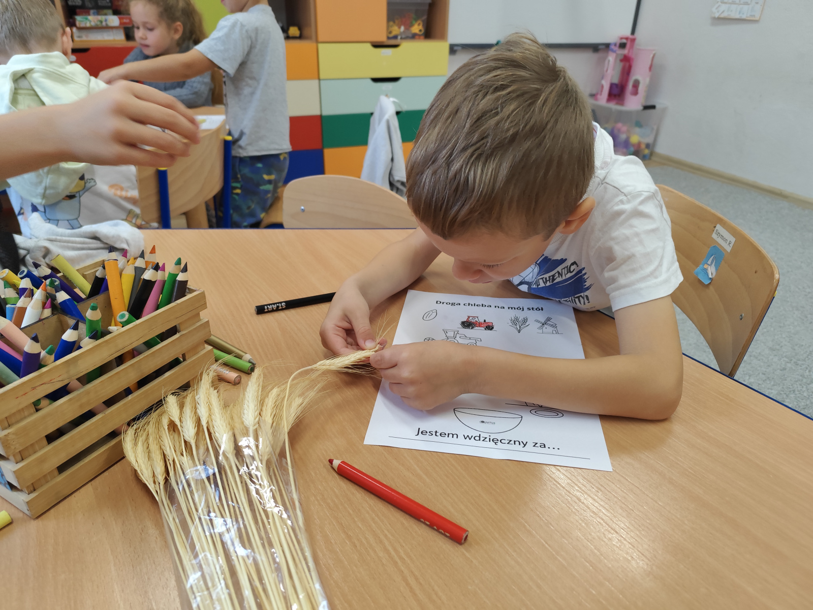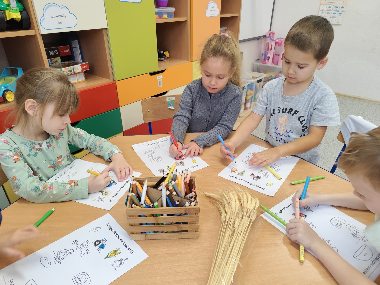 16 października w naszym przedszkolu zapachniało… chlebem! Z okazji Dnia Chleba rozmawialiśmy o tym, skąd pochodzi chleb, jak powstaje i dlaczego warto go szanować. Dzieci z wielkim zaangażowaniem oglądały różne rodzaje pieczywa, poznawały składniki potrzebne do wypieku oraz… same zamieniły się w małych piekarzy! Było wyrabianie ciasta, formowanie chleba i dużo radości! Nie zabrakło też wspólnej degustacji świeżo upieczonego chleba — smakował wyjątkowo, bo przygotowany własnoręcznie i z sercem. To był piękny, pachnący dzień pełen nauki i wspólnego świętowania.