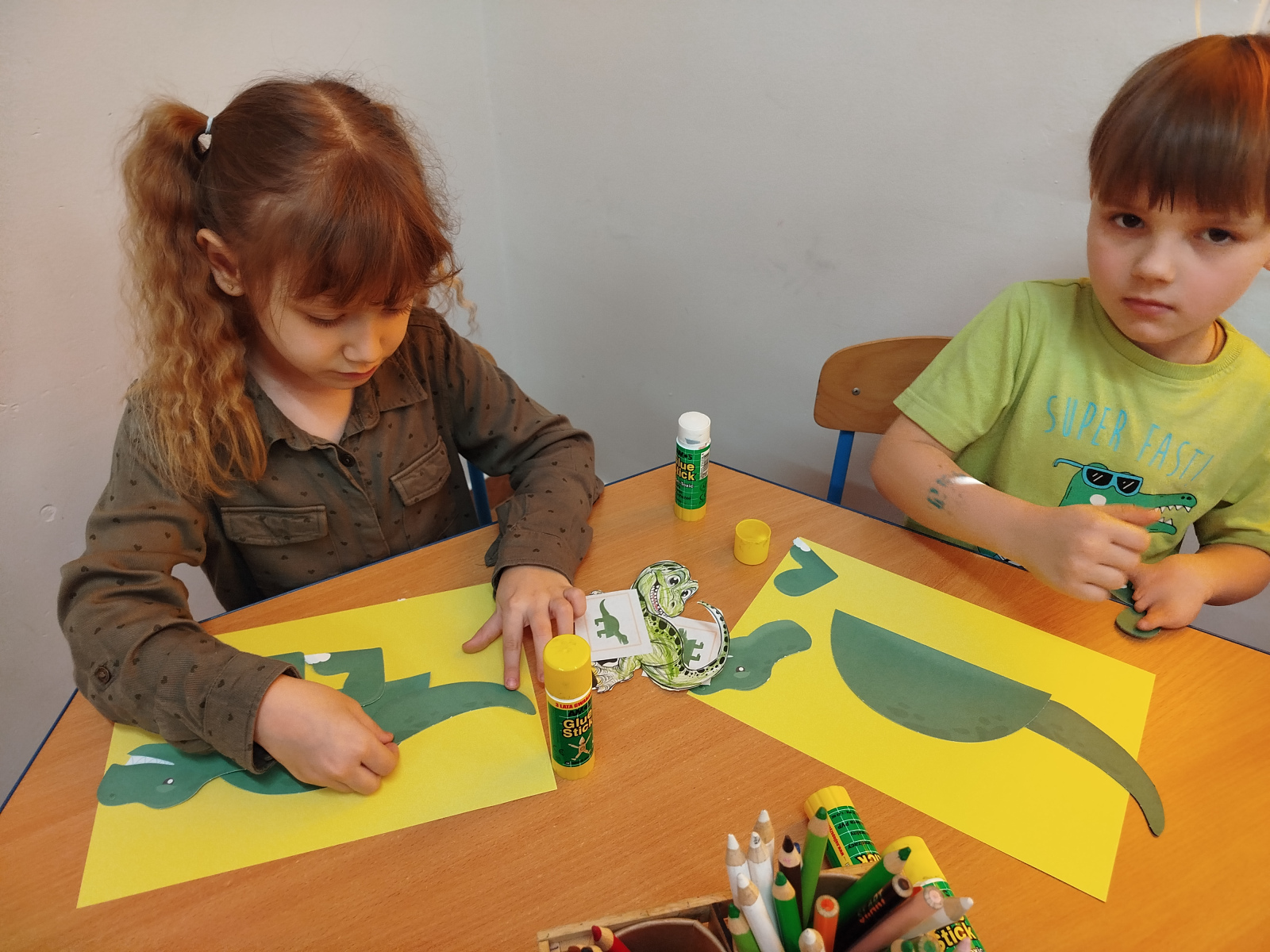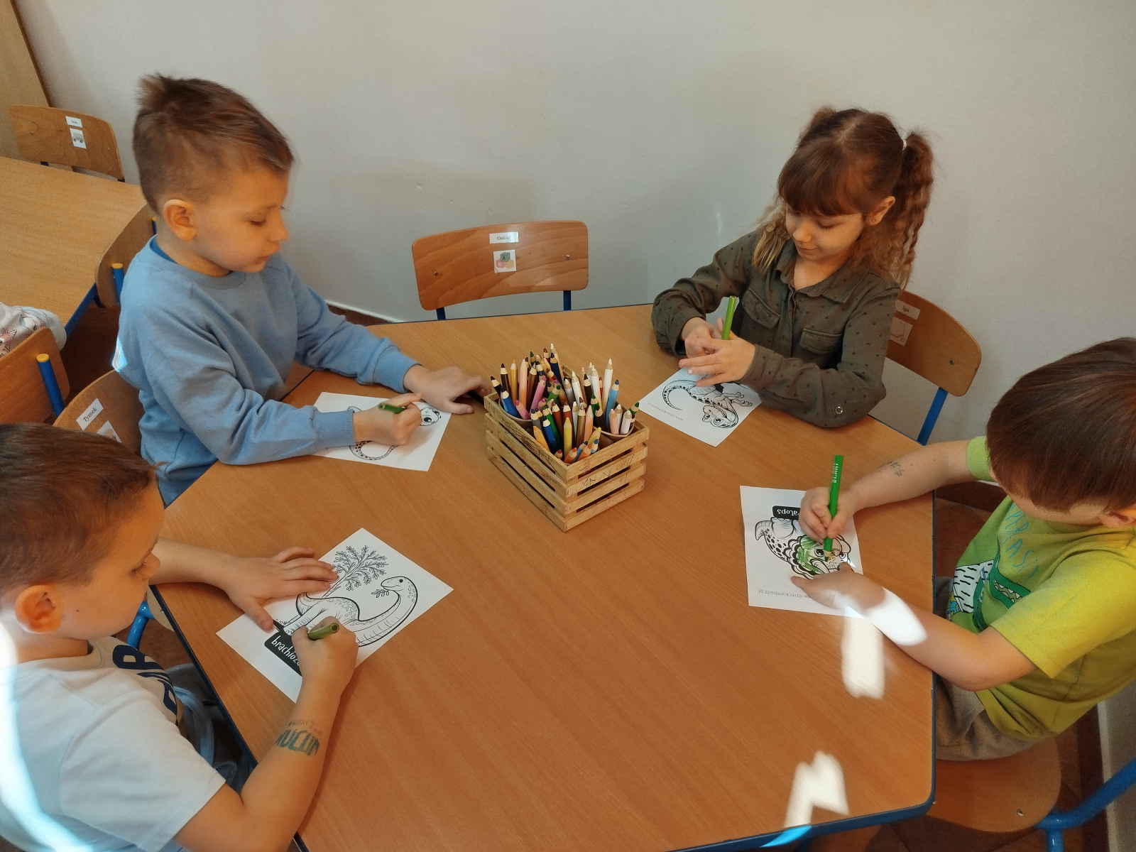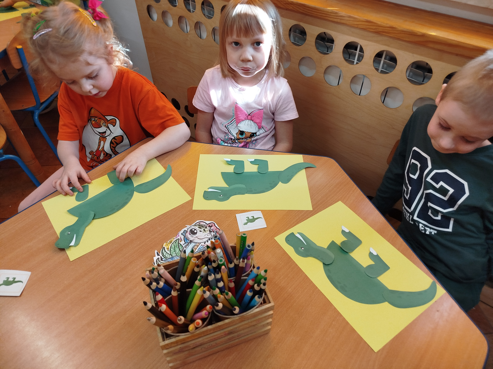 Dzieci z ogromnym entuzjazmem świętowały Dzień Dinozaura, bawiąc się wspólnie przy muzyce i naśladując ruchy swoich ulubionych dinozaurów – były groźne miny, donośne ryki i ciężkie, „dinozaurowe” kroki 🦕🎶.Nasi mali odkrywcy wcielili się również w rolę paleontologów – z wielkim zaangażowaniem poszukiwali „skamieniałości” i odkrywali prehistoryczne znaleziska 🦴🔎Nie zabrakło zabawy zmysłoplastycznej – dzieci z ciekawością „wykluwały” dinozaury z jaj, ćwicząc przy tym małą motorykę i rozwijając swoje zmysły 🥚🦖Z wielkim zainteresowaniem oglądały także książeczki o dinozaurach w 3D, które pozwoliły im jeszcze lepiej poznać świat prehistorycznych stworzeń 📚✨Powstały również piękne plakaty „Świat dinozaurów”, pełne kolorowych, niezwykłych okazów 🖍️🎨 A na koniec przedszkolaki układały dinozaurowe puzzle z obrazka, ćwicząc spostrzegawczość i współpracę 🧩🦕To był dzień pełen radości, śmiechu i fascynujących odkryć! 🌟Dziękujemy naszym małym badaczom za wspólną podróż do świata dinozaurów! 🦕💚