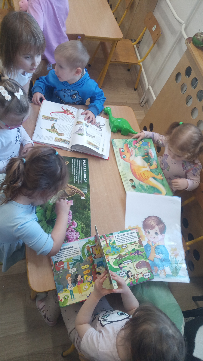 Dzieci z ogromnym entuzjazmem świętowały Dzień Dinozaura, bawiąc się wspólnie przy muzyce i naśladując ruchy swoich ulubionych dinozaurów – były groźne miny, donośne ryki i ciężkie, „dinozaurowe” kroki 🦕🎶.Nasi mali odkrywcy wcielili się również w rolę paleontologów – z wielkim zaangażowaniem poszukiwali „skamieniałości” i odkrywali prehistoryczne znaleziska 🦴🔎Nie zabrakło zabawy zmysłoplastycznej – dzieci z ciekawością „wykluwały” dinozaury z jaj, ćwicząc przy tym małą motorykę i rozwijając swoje zmysły 🥚🦖Z wielkim zainteresowaniem oglądały także książeczki o dinozaurach w 3D, które pozwoliły im jeszcze lepiej poznać świat prehistorycznych stworzeń 📚✨Powstały również piękne plakaty „Świat dinozaurów”, pełne kolorowych, niezwykłych okazów 🖍️🎨 A na koniec przedszkolaki układały dinozaurowe puzzle z obrazka, ćwicząc spostrzegawczość i współpracę 🧩🦕To był dzień pełen radości, śmiechu i fascynujących odkryć! 🌟Dziękujemy naszym małym badaczom za wspólną podróż do świata dinozaurów! 🦕💚