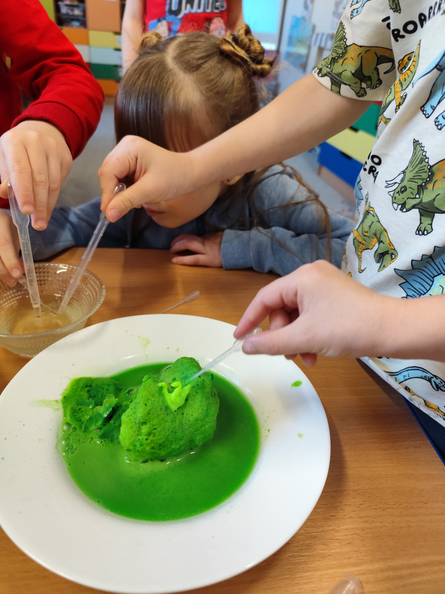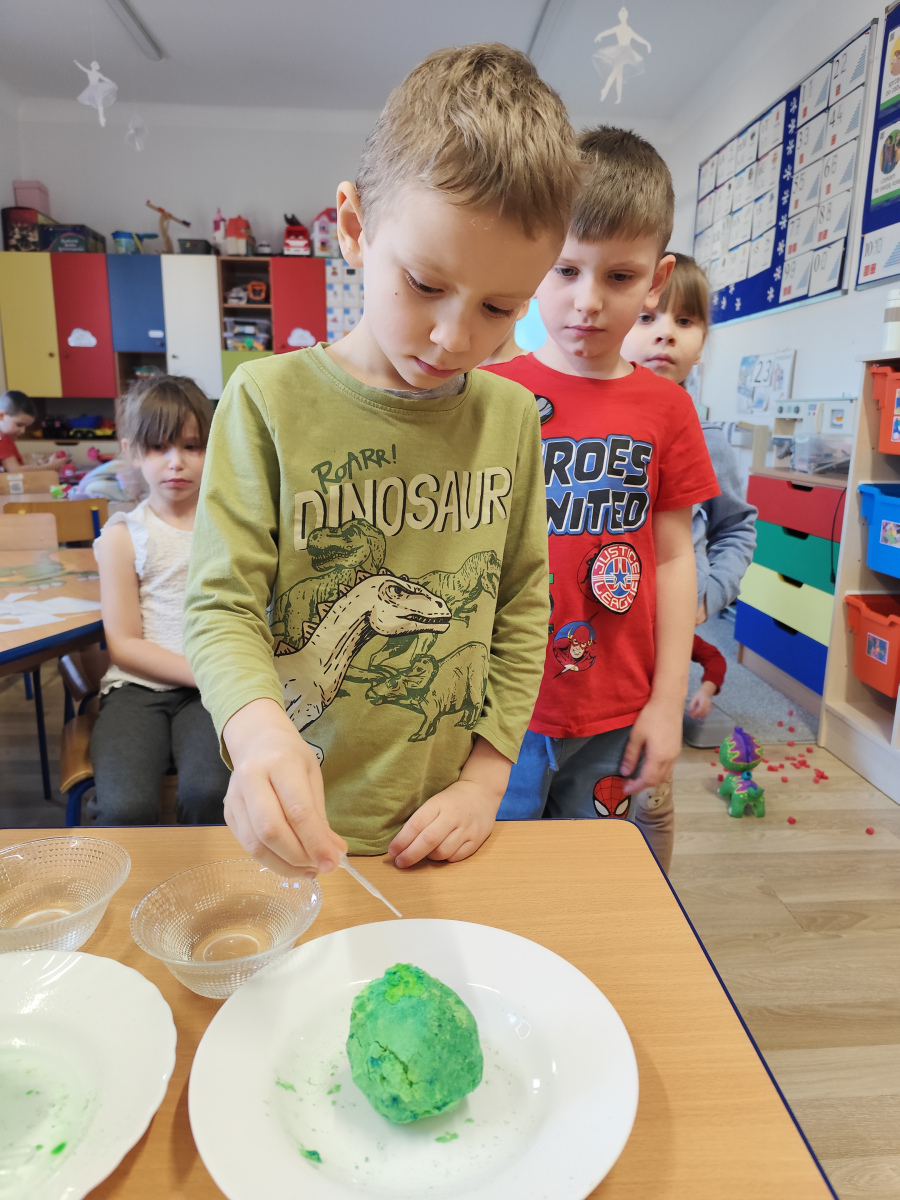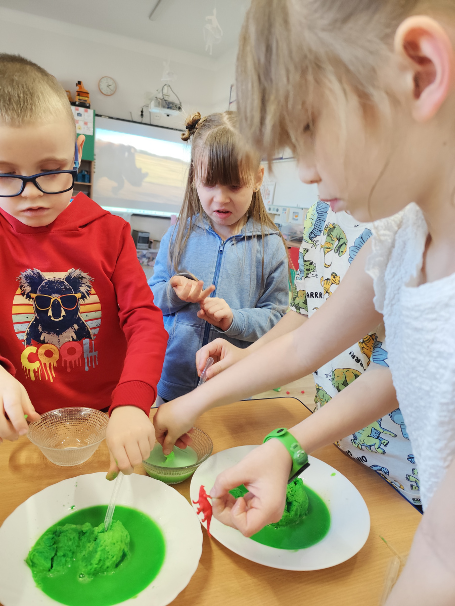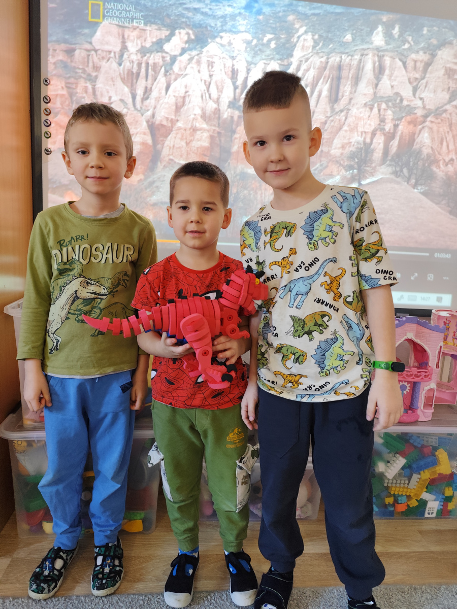 Dzieci z ogromnym entuzjazmem świętowały Dzień Dinozaura, bawiąc się wspólnie przy muzyce i naśladując ruchy swoich ulubionych dinozaurów – były groźne miny, donośne ryki i ciężkie, „dinozaurowe” kroki 🦕🎶.Nasi mali odkrywcy wcielili się również w rolę paleontologów – z wielkim zaangażowaniem poszukiwali „skamieniałości” i odkrywali prehistoryczne znaleziska 🦴🔎Nie zabrakło zabawy zmysłoplastycznej – dzieci z ciekawością „wykluwały” dinozaury z jaj, ćwicząc przy tym małą motorykę i rozwijając swoje zmysły 🥚🦖Z wielkim zainteresowaniem oglądały także książeczki o dinozaurach w 3D, które pozwoliły im jeszcze lepiej poznać świat prehistorycznych stworzeń 📚✨Powstały również piękne plakaty „Świat dinozaurów”, pełne kolorowych, niezwykłych okazów 🖍️🎨 A na koniec przedszkolaki układały dinozaurowe puzzle z obrazka, ćwicząc spostrzegawczość i współpracę 🧩🦕To był dzień pełen radości, śmiechu i fascynujących odkryć! 🌟Dziękujemy naszym małym badaczom za wspólną podróż do świata dinozaurów! 🦕💚