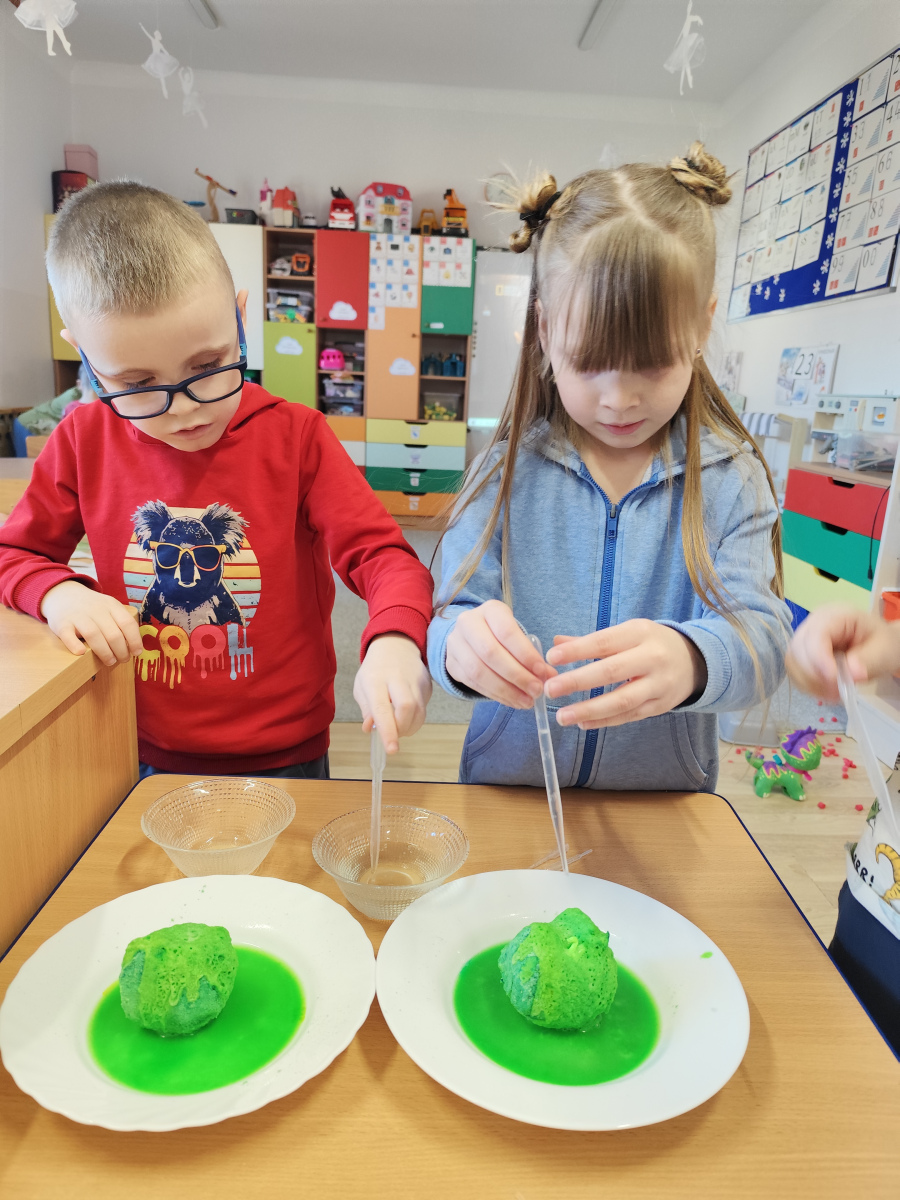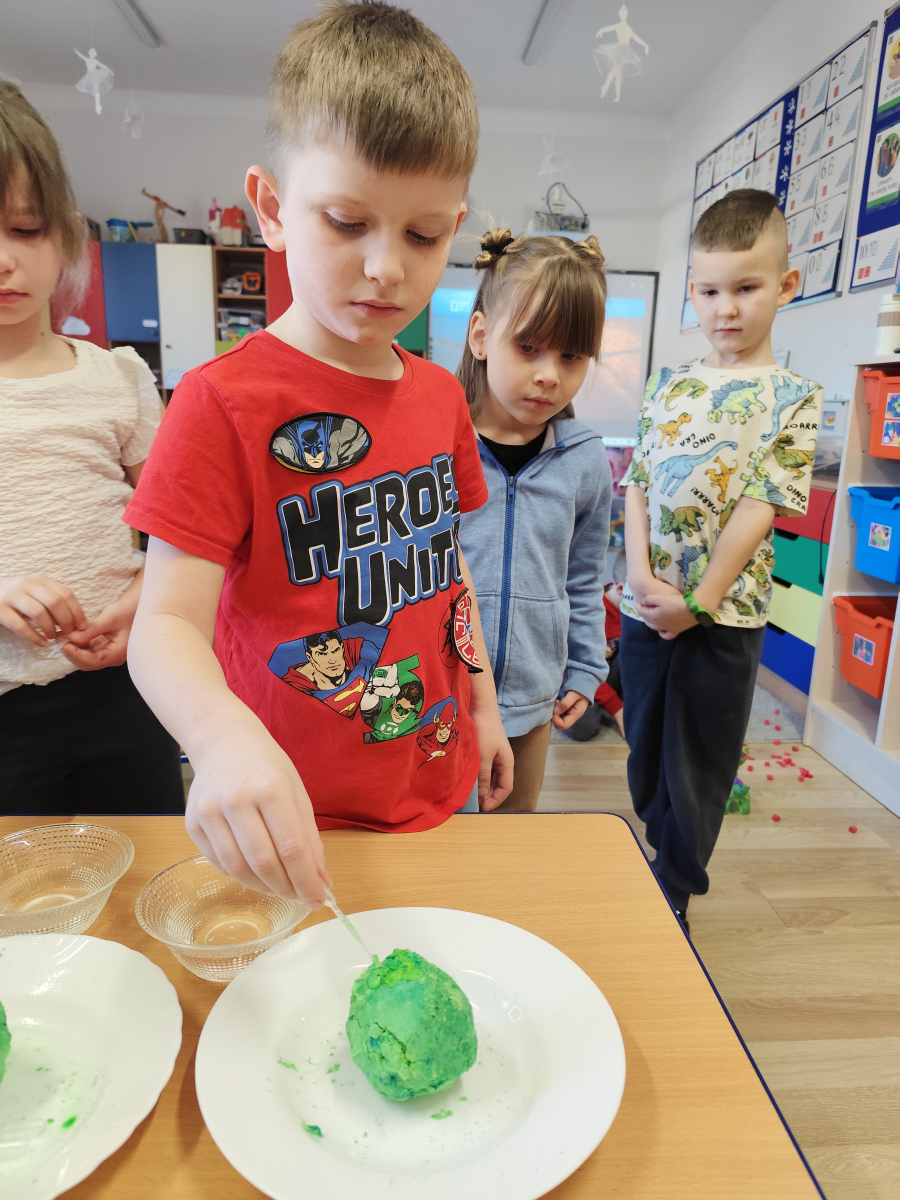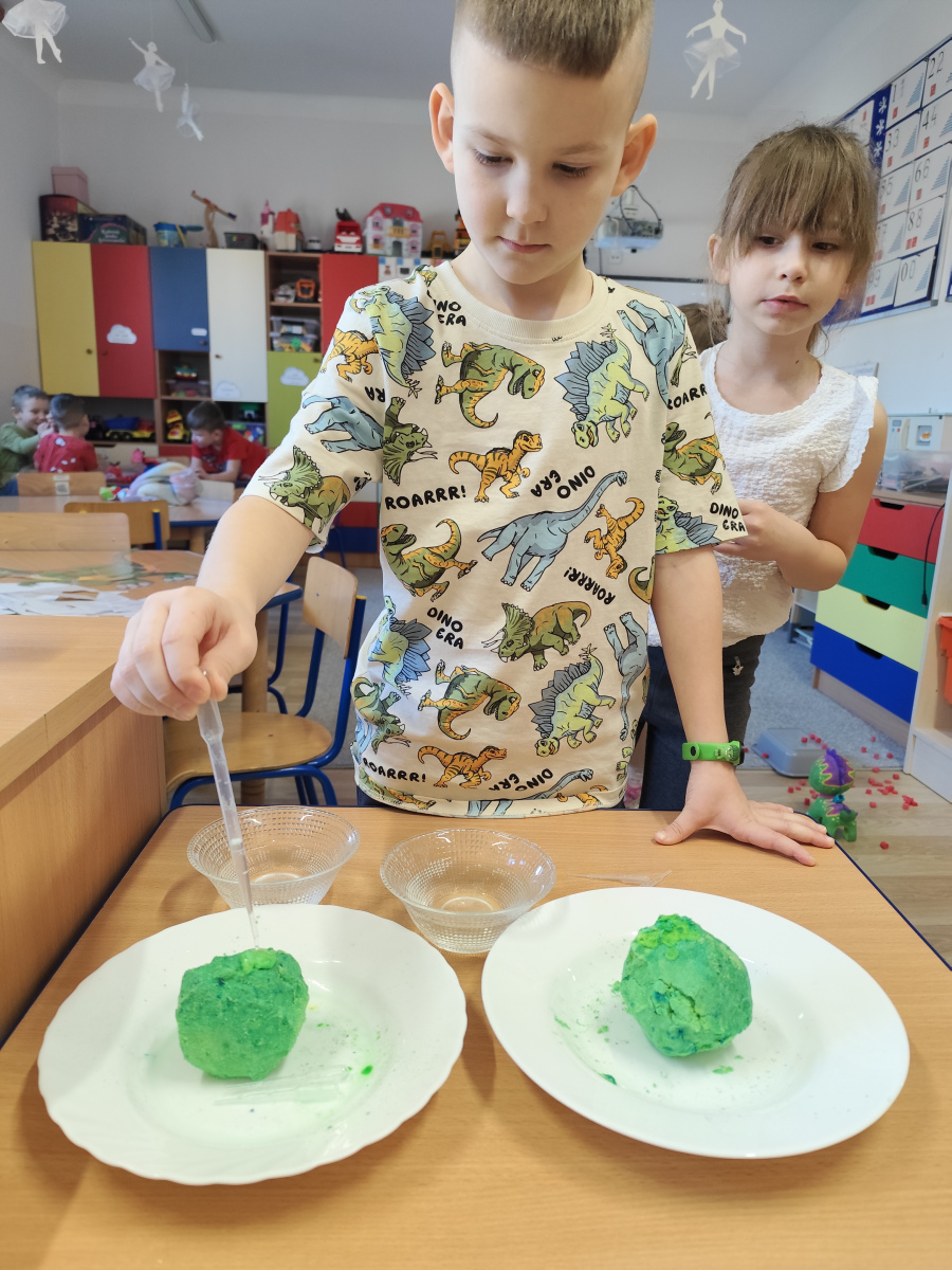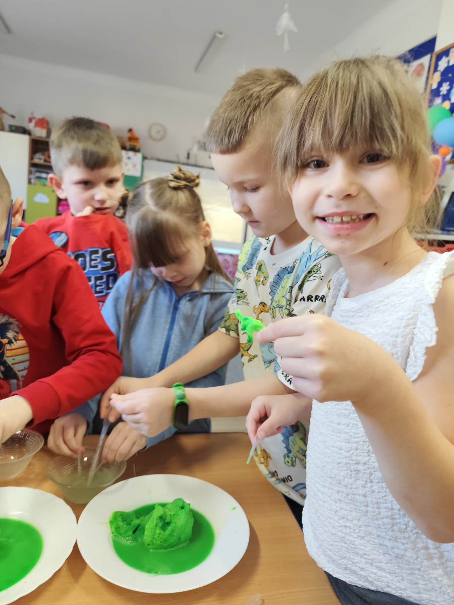 Dzieci z ogromnym entuzjazmem świętowały Dzień Dinozaura, bawiąc się wspólnie przy muzyce i naśladując ruchy swoich ulubionych dinozaurów – były groźne miny, donośne ryki i ciężkie, „dinozaurowe” kroki 🦕🎶.Nasi mali odkrywcy wcielili się również w rolę paleontologów – z wielkim zaangażowaniem poszukiwali „skamieniałości” i odkrywali prehistoryczne znaleziska 🦴🔎Nie zabrakło zabawy zmysłoplastycznej – dzieci z ciekawością „wykluwały” dinozaury z jaj, ćwicząc przy tym małą motorykę i rozwijając swoje zmysły 🥚🦖Z wielkim zainteresowaniem oglądały także książeczki o dinozaurach w 3D, które pozwoliły im jeszcze lepiej poznać świat prehistorycznych stworzeń 📚✨Powstały również piękne plakaty „Świat dinozaurów”, pełne kolorowych, niezwykłych okazów 🖍️🎨 A na koniec przedszkolaki układały dinozaurowe puzzle z obrazka, ćwicząc spostrzegawczość i współpracę 🧩🦕To był dzień pełen radości, śmiechu i fascynujących odkryć! 🌟Dziękujemy naszym małym badaczom za wspólną podróż do świata dinozaurów! 🦕💚