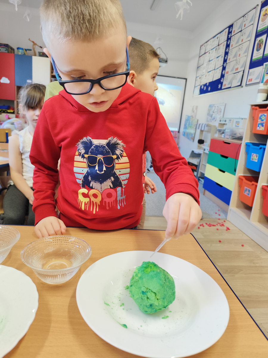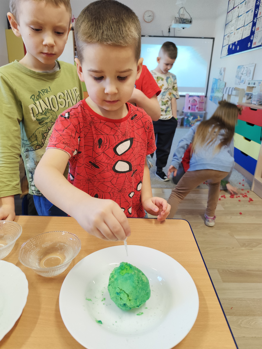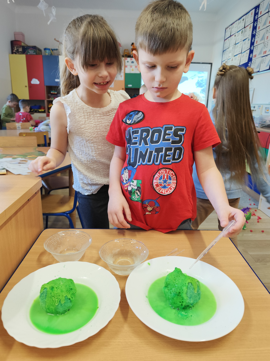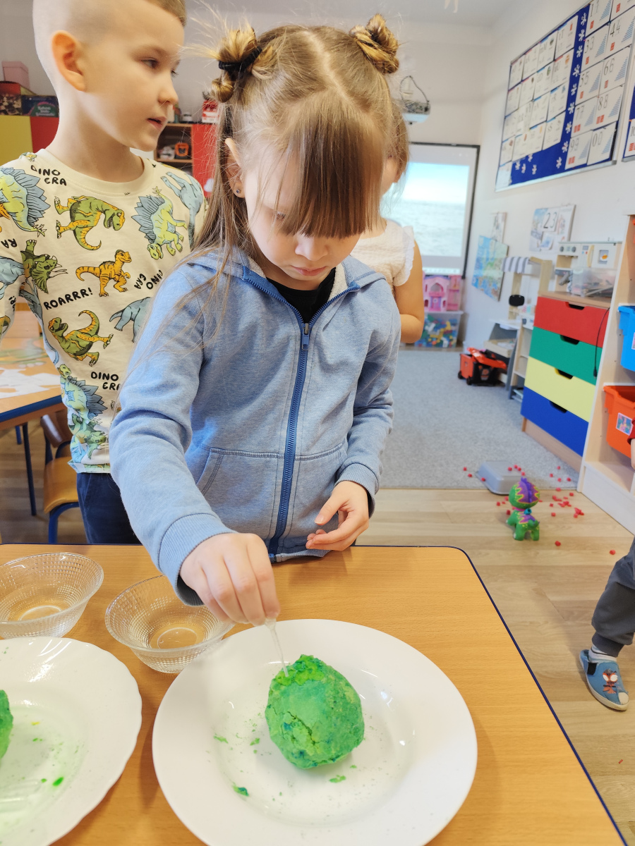 Dzieci z ogromnym entuzjazmem świętowały Dzień Dinozaura, bawiąc się wspólnie przy muzyce i naśladując ruchy swoich ulubionych dinozaurów – były groźne miny, donośne ryki i ciężkie, „dinozaurowe” kroki 🦕🎶.Nasi mali odkrywcy wcielili się również w rolę paleontologów – z wielkim zaangażowaniem poszukiwali „skamieniałości” i odkrywali prehistoryczne znaleziska 🦴🔎Nie zabrakło zabawy zmysłoplastycznej – dzieci z ciekawością „wykluwały” dinozaury z jaj, ćwicząc przy tym małą motorykę i rozwijając swoje zmysły 🥚🦖Z wielkim zainteresowaniem oglądały także książeczki o dinozaurach w 3D, które pozwoliły im jeszcze lepiej poznać świat prehistorycznych stworzeń 📚✨Powstały również piękne plakaty „Świat dinozaurów”, pełne kolorowych, niezwykłych okazów 🖍️🎨 A na koniec przedszkolaki układały dinozaurowe puzzle z obrazka, ćwicząc spostrzegawczość i współpracę 🧩🦕To był dzień pełen radości, śmiechu i fascynujących odkryć! 🌟Dziękujemy naszym małym badaczom za wspólną podróż do świata dinozaurów! 🦕💚