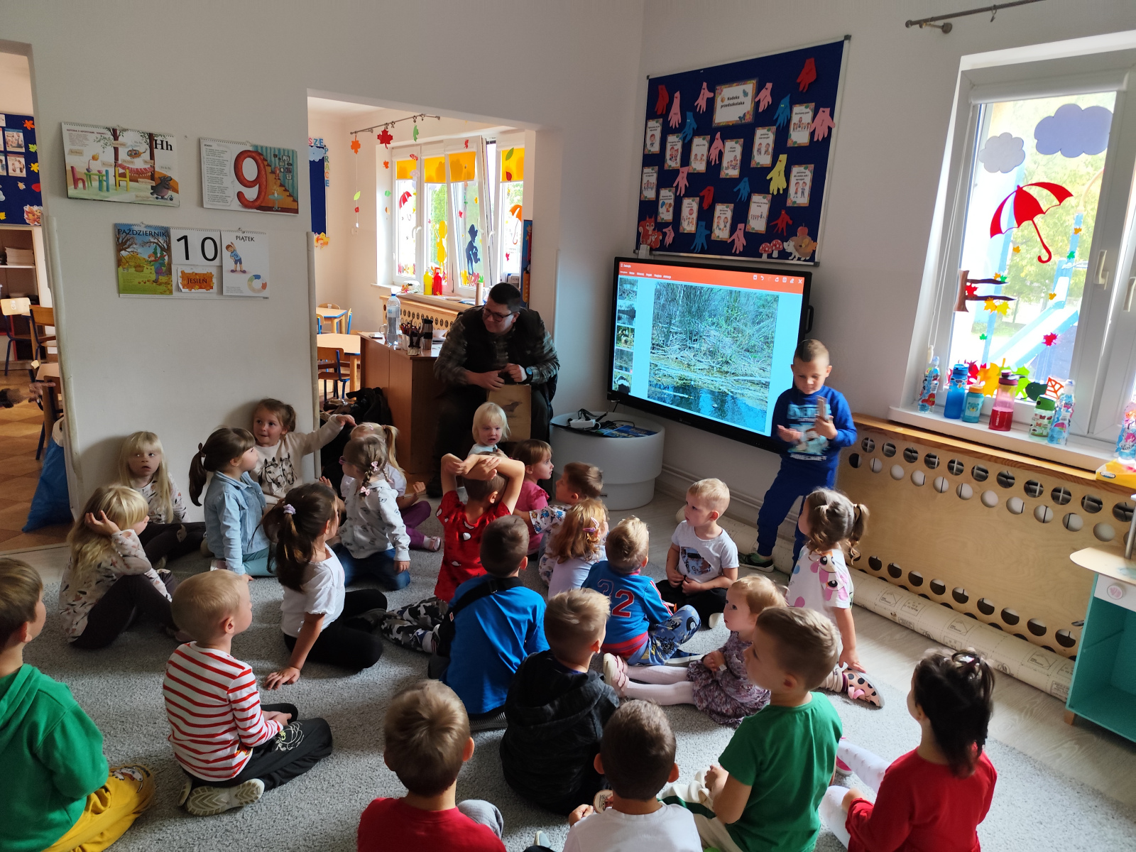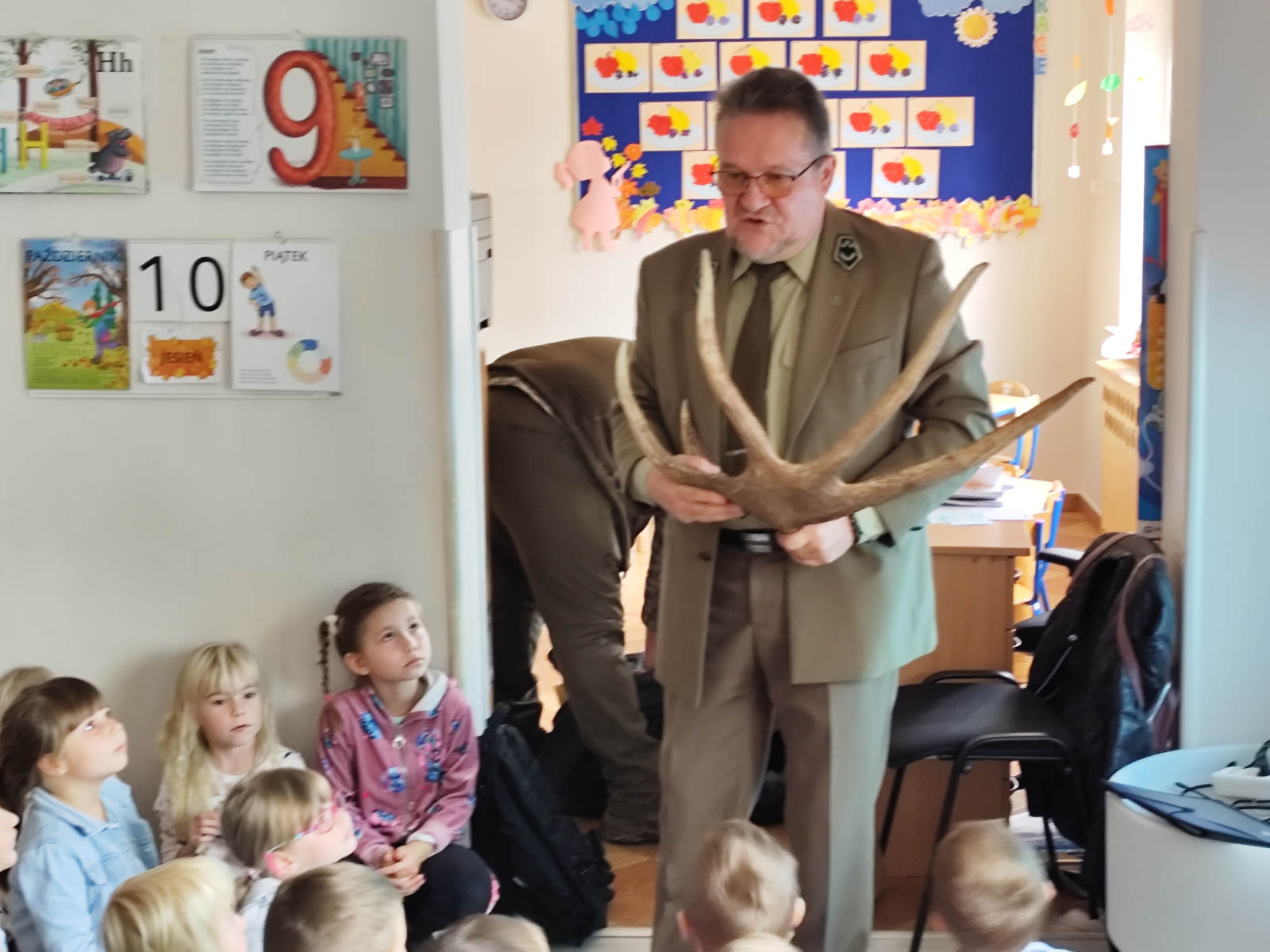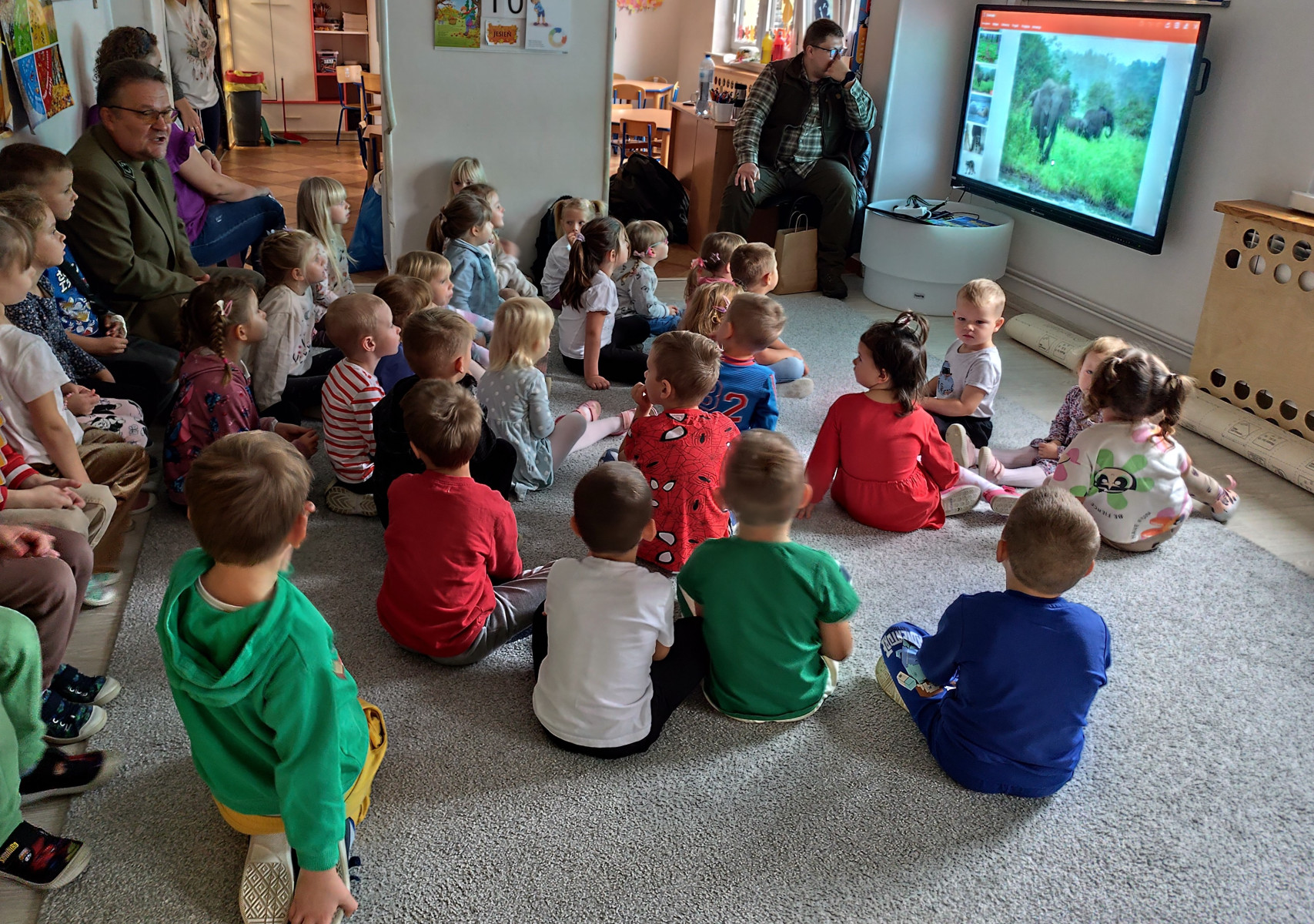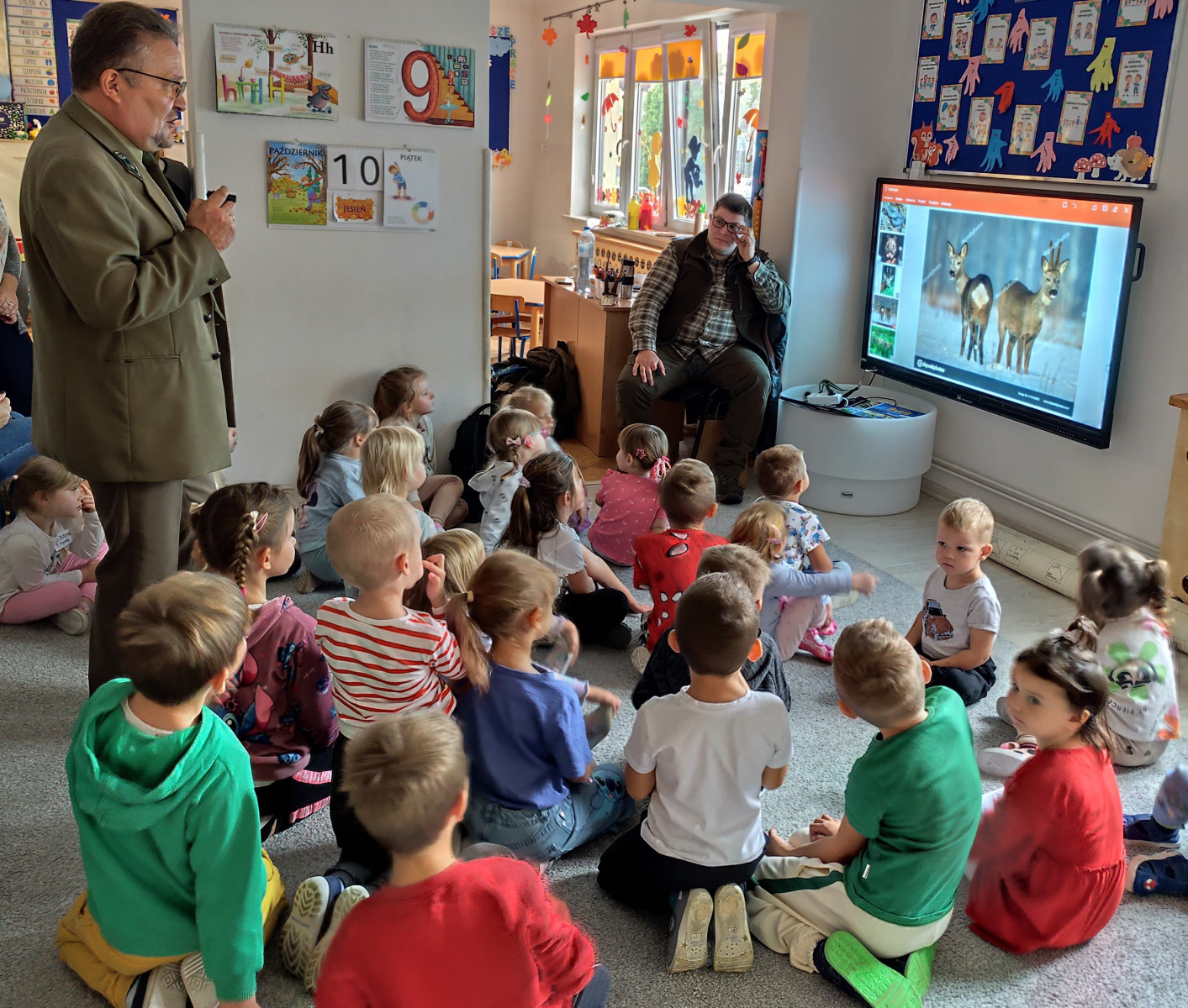10 października nasze przedszkolaki miały wyjątkowych gości – odwiedzili nas panowie Ryszard Stańczyk oraz Paweł Rutkowski leśniczy! W ramach obchodów Dnia Drzewa dzieci dowiedziały się, jak ważną rolę pełnią drzewa w przyrodzie, jak o nie dbać i dlaczego warto je chronić. Leśniczy opowiedział o swojej pracy, pokazał ciekawe eksponaty z lasu Nie zabrakło też zagadek przyrodniczych, które wywołały mnóstwo radości i śmiechu! Dziękujemy naszym gościom za fascynujące spotkanie i już nie możemy się doczekać kolejnych leśnych przygód!