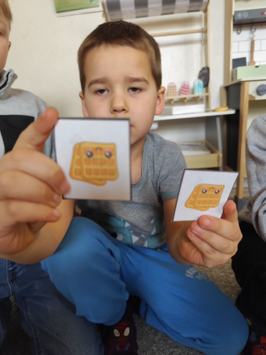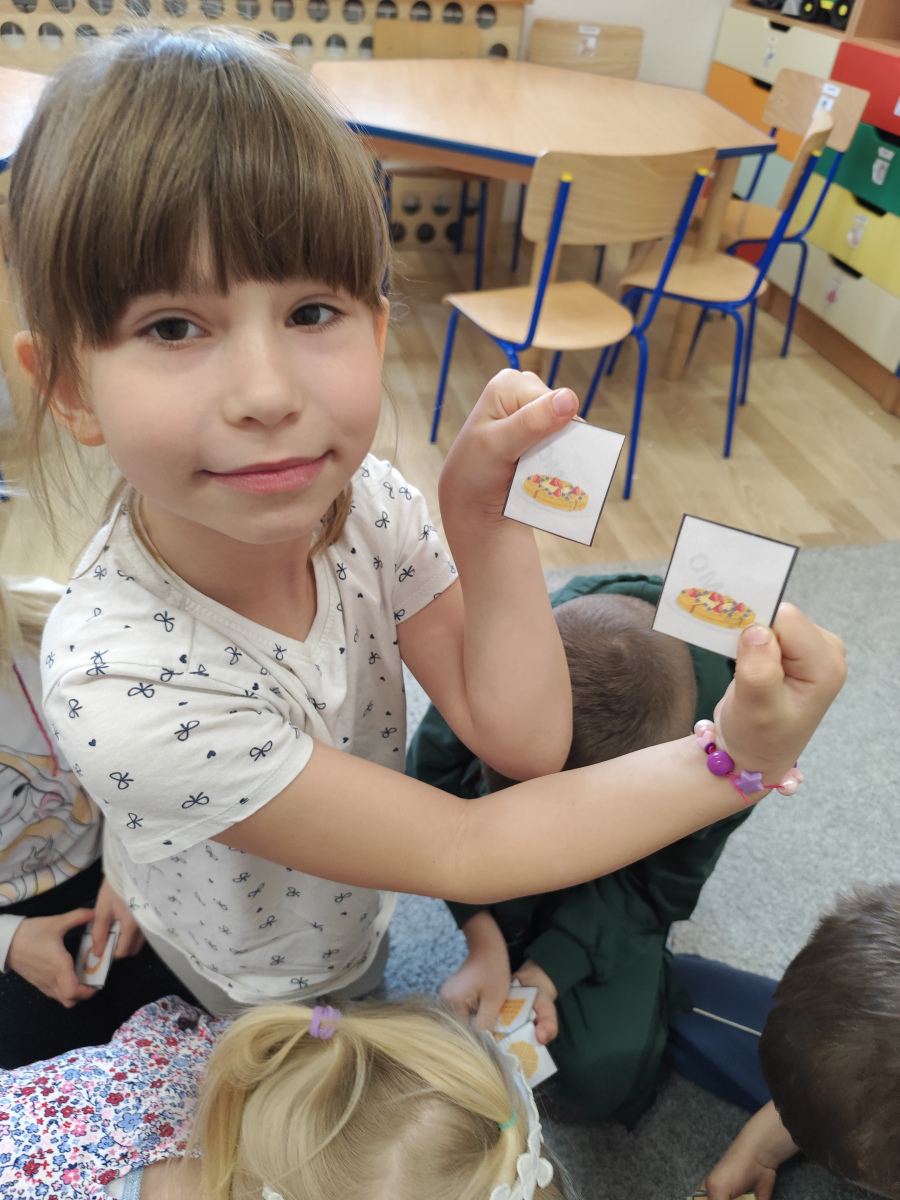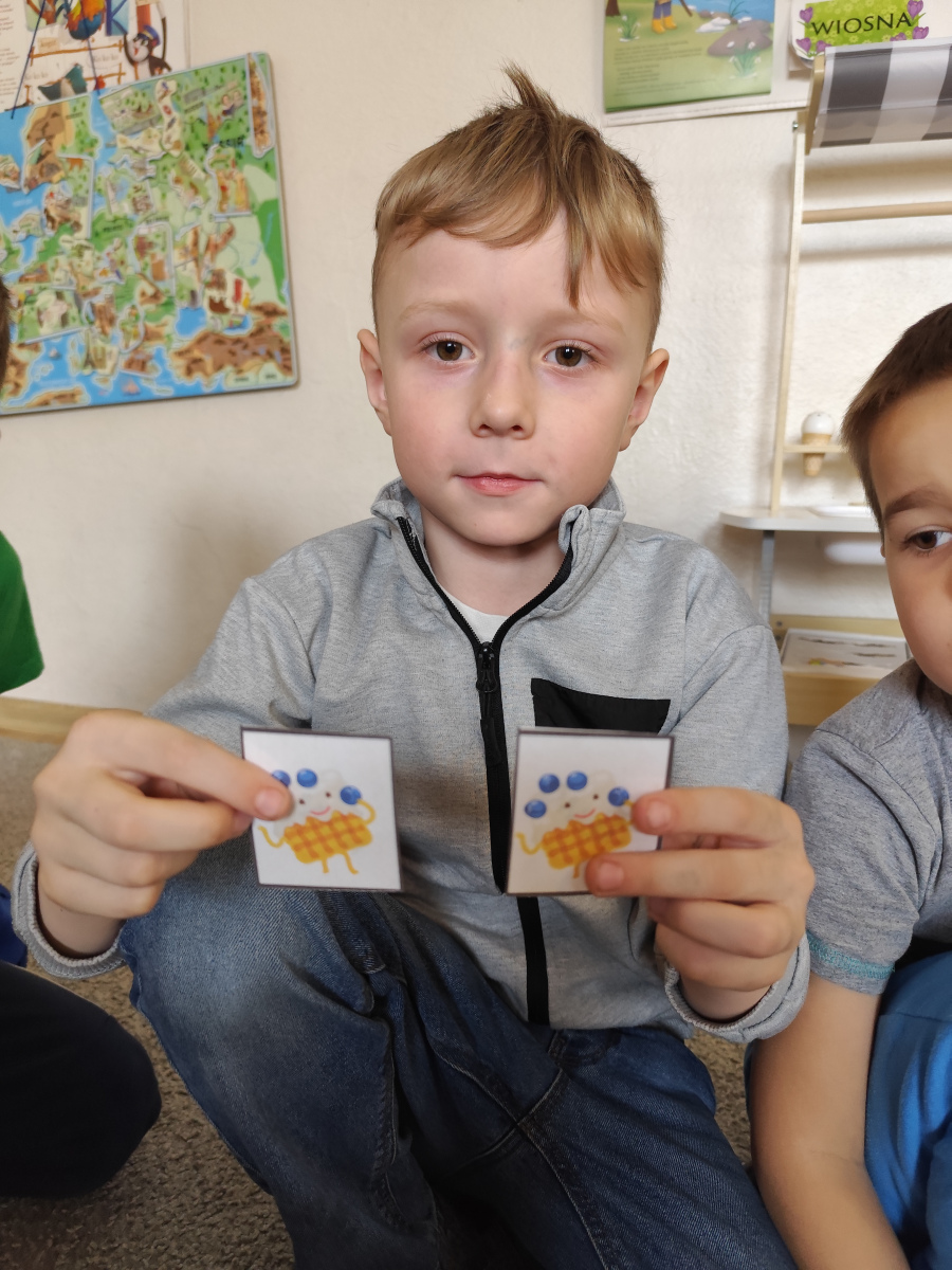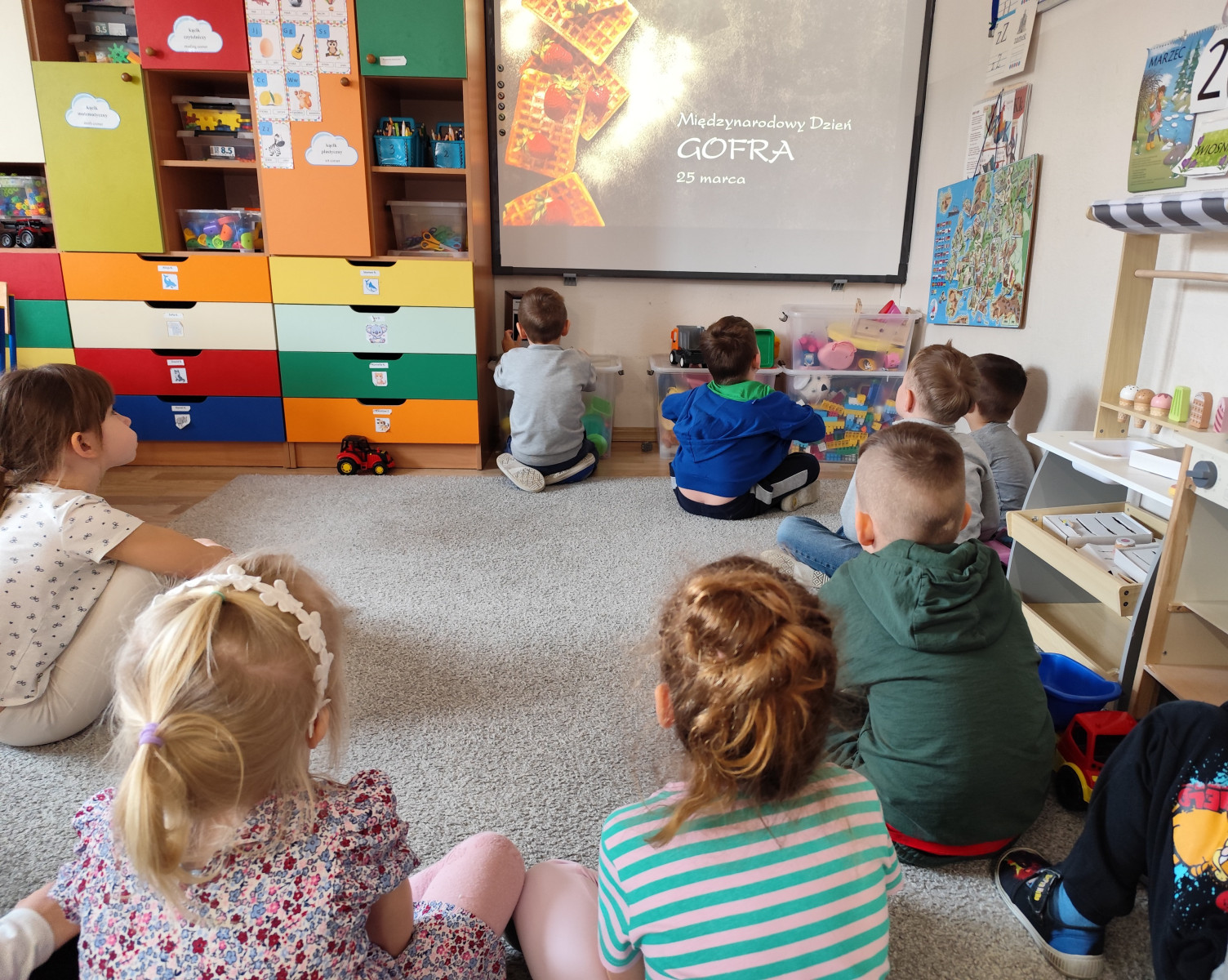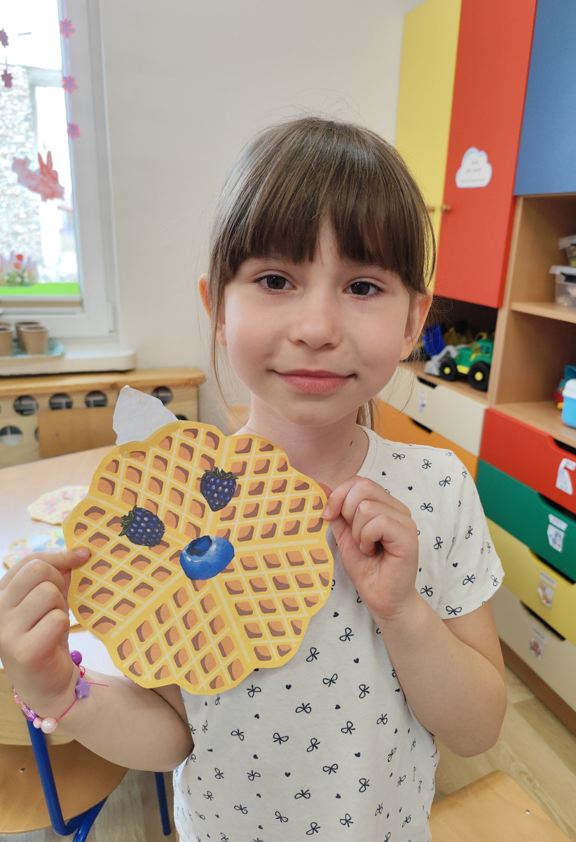 Przedszkolaki: poznawały składniki potrzebne do przygotowania gofra, bawiły się w gofrowe memory, liczyły gofry, tworzyły własne prace plastyczne o gofrowej tematyce, a także grały w zabawę „Ja mam, kto ma?” i na koniec próbowały gofry z dżemem i cukrem pudrem. 😋Było mnóstwo śmiechu, radości i kreatywnej zabawy – dzieci uczyły się przez doświadczenie i zabawę! 💛