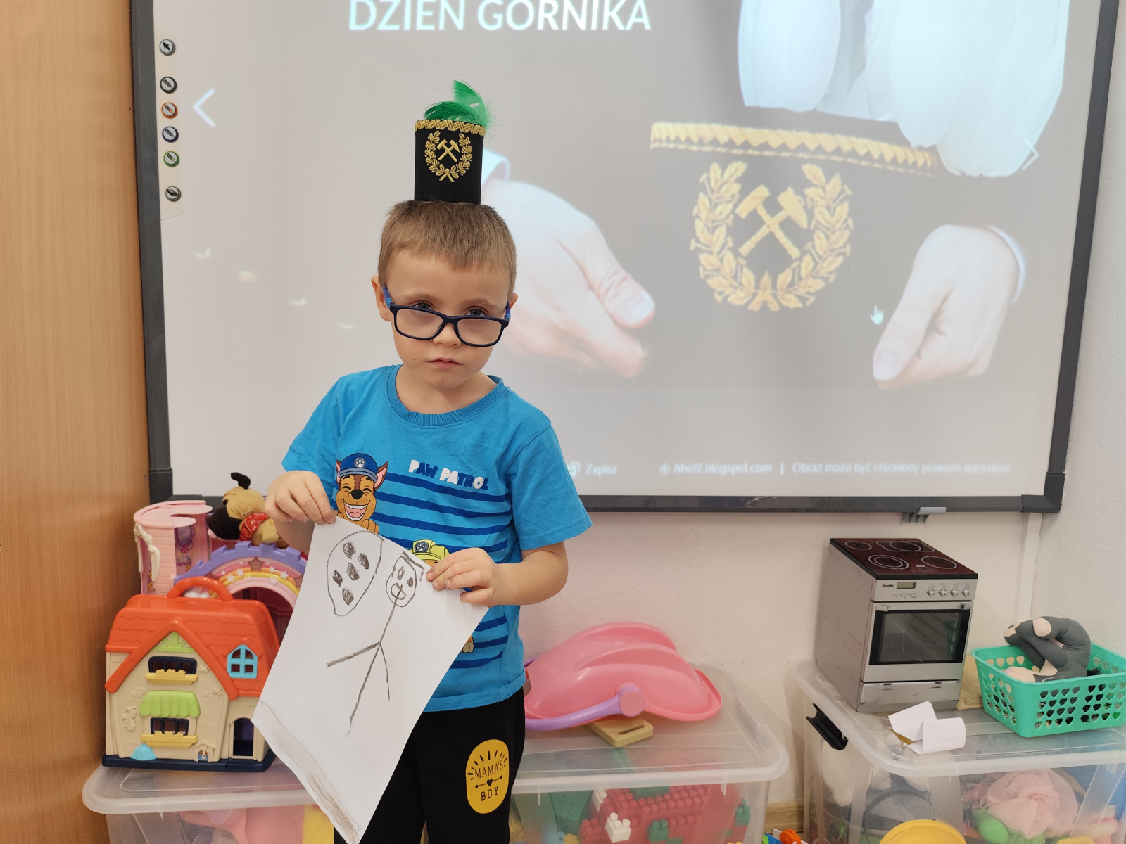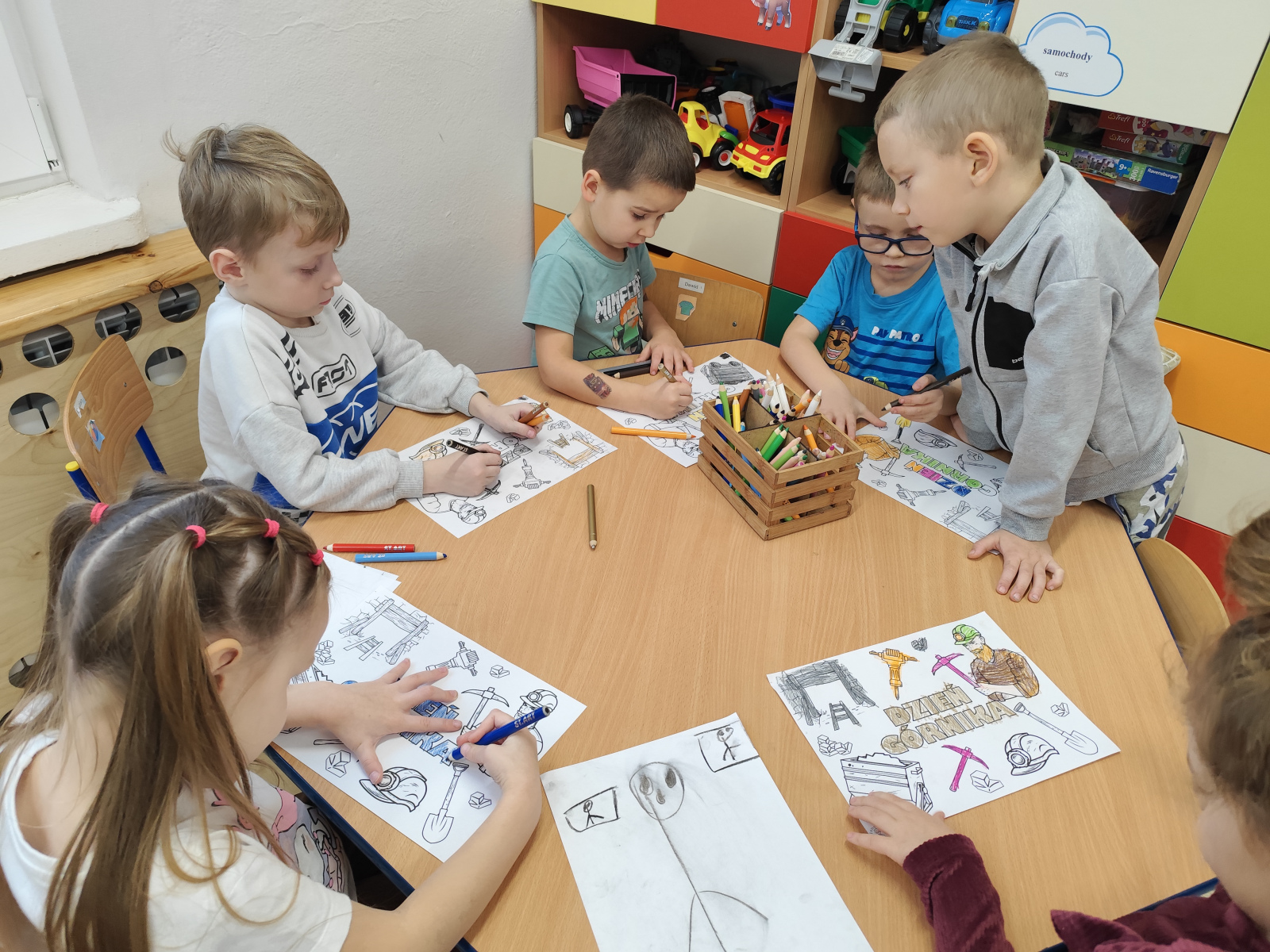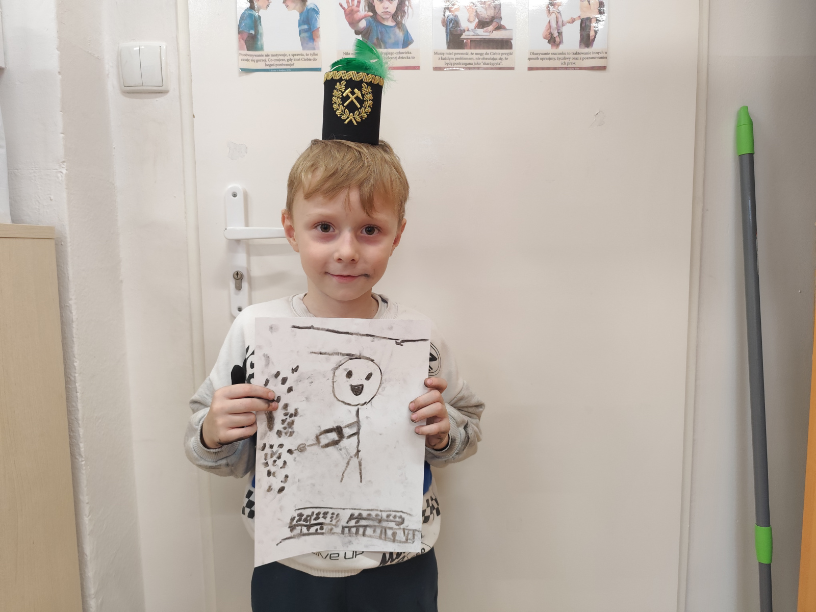 W grupie Biedronek dzieci rozmawiały o tym, jak wygląda codzienna praca górnika, z jakich narzędzi korzysta i dlaczego jego praca jest tak ważna. Następnie przedszkolaki wykonały górnicze opaski – każdy projekt był wyjątkowy, a mali twórcy z dumą prezentowali swoje dzieła przez resztę dnia. W sali zrobiło się naprawdę „świątecznie górniczo”! Grupy Pszczółek i Sówek zanurzyły się w bardziej artystyczne doświadczenia – dzieci malowały prawdziwym węglem! Poznały jego fakturę, kolor, zapach i właściwości, a przy okazji mogły przekonać się, jak wygląda materiał, z którym na co dzień spotykają się górnicy. Powstały piękne, wyjątkowe prace plastyczne, a małe rączki szybko stały się czarne od twórczego działania .Dzieci z ogromnym zainteresowaniem słuchały opowieści o górniczych tradycjach, mundurach, czapkach z pióropuszem i znaczeniu Barbórki. Ten dzień był pełen nowych doświadczeń, wiedzy i radości.