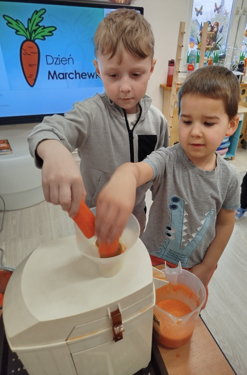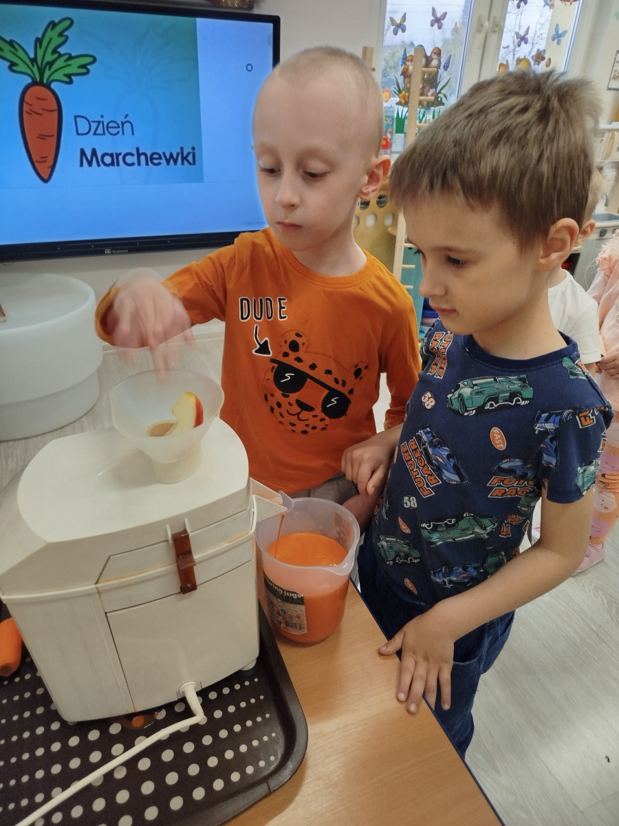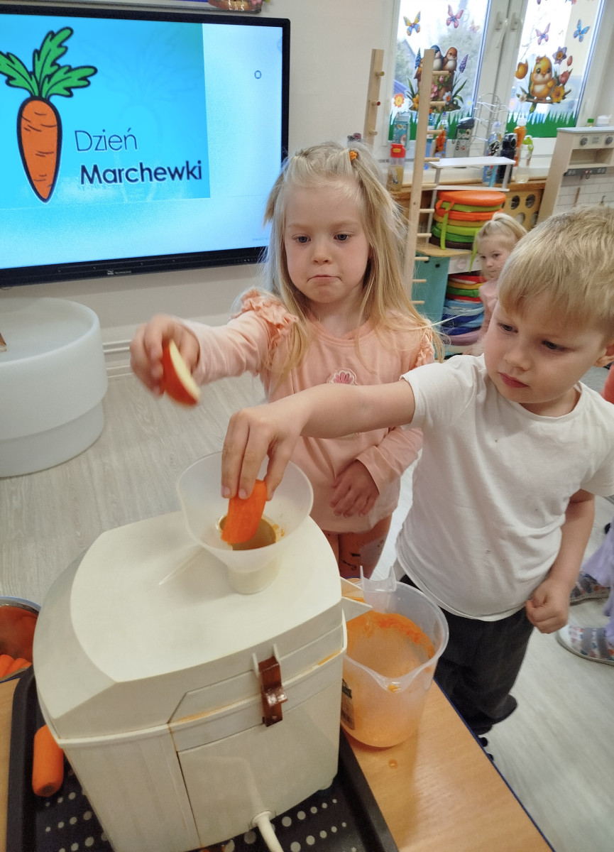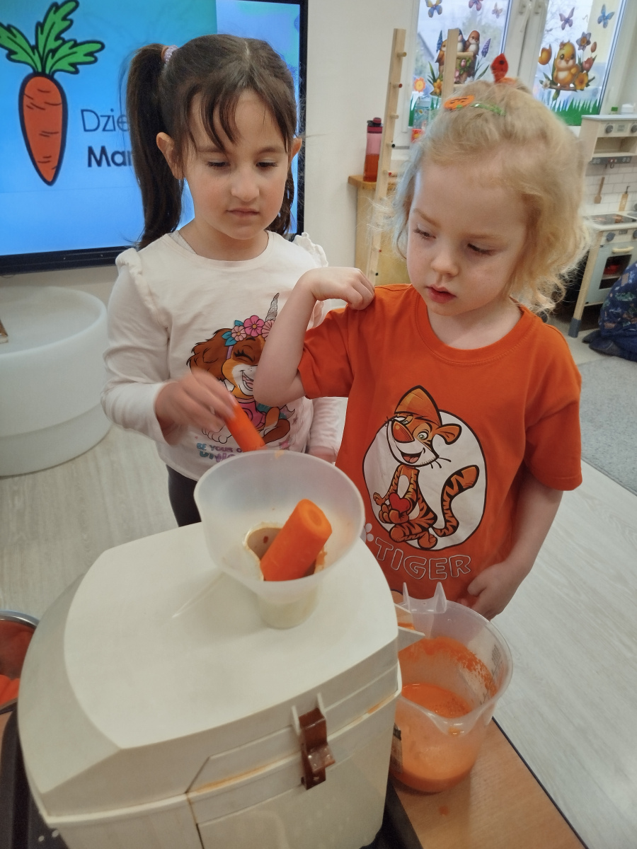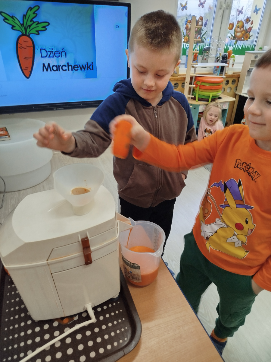 8 kwietnia nasze przedszkolaki obchodziły Dzień Marchewki, który miał na celu uświadomienie dzieciom walorów smakowych i wartości odżywczych jakie zawiera marchewka oraz zachęcenie dzieci do jedzenia tego warzywa. Dzieci w tym dniu przyszły do przedszkola ubrane na pomarańczowo. Przedszkolaki wspólnie robiły sok marchewkowo-jabłkowy, który bardzo dzieciom smakował. Na zajęciach rozwijały sprawność manualną wykonując prace plastyczne, utrwalały umiejętność przeliczania, poznały wartości odżywcze marchewki. Badały marchewkę zmysłem dotyku oraz je degustowały.