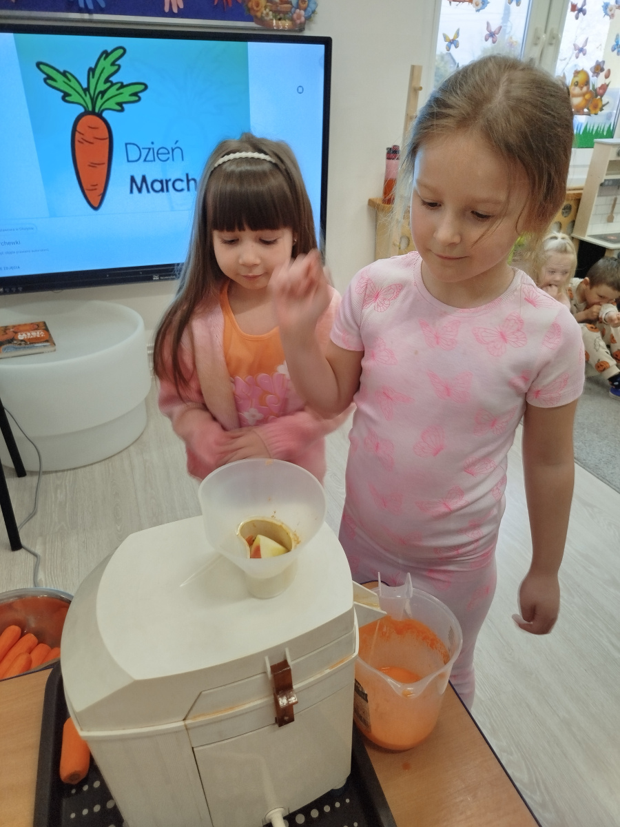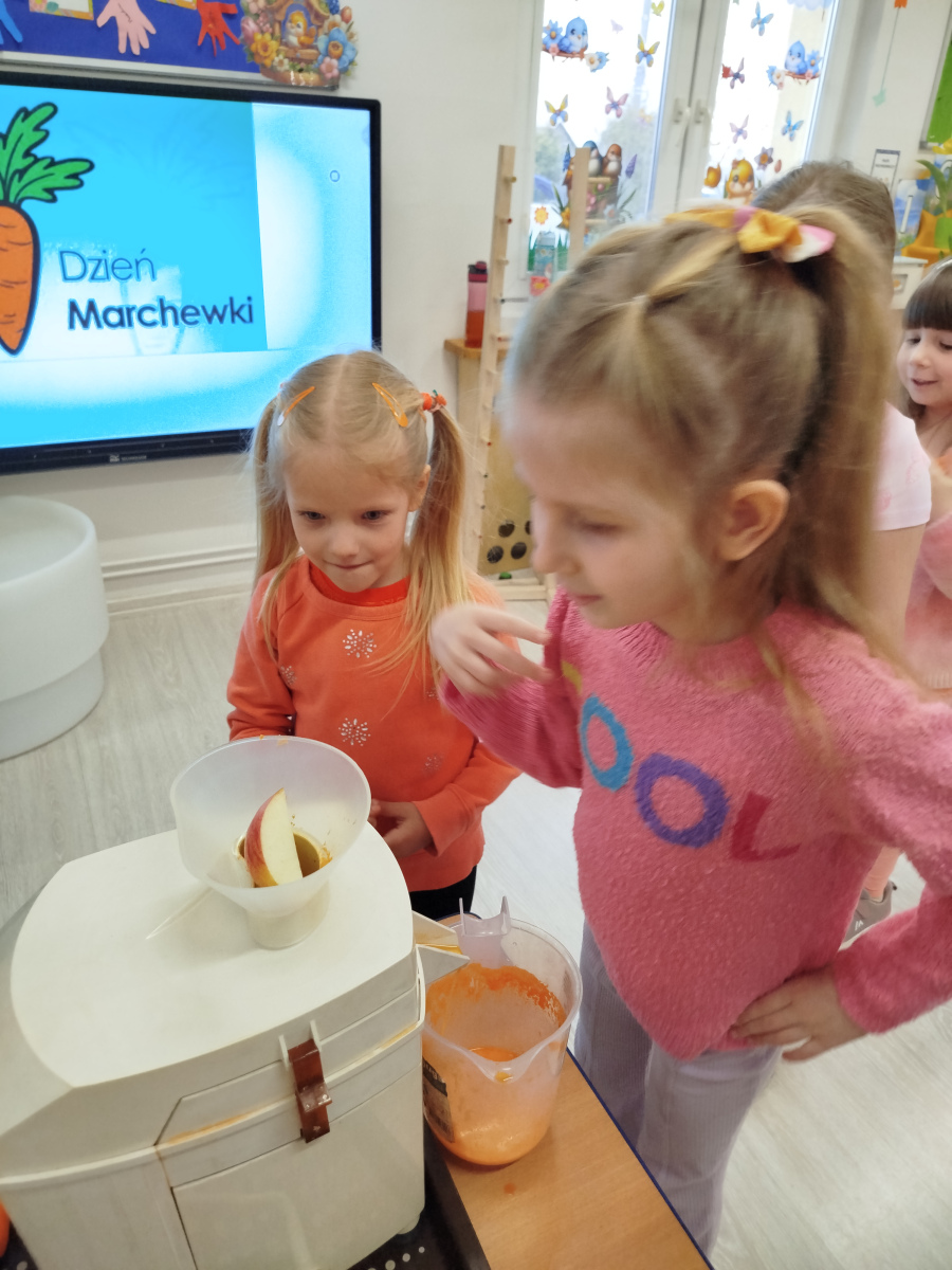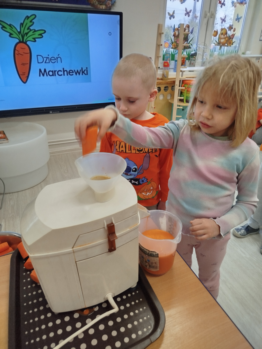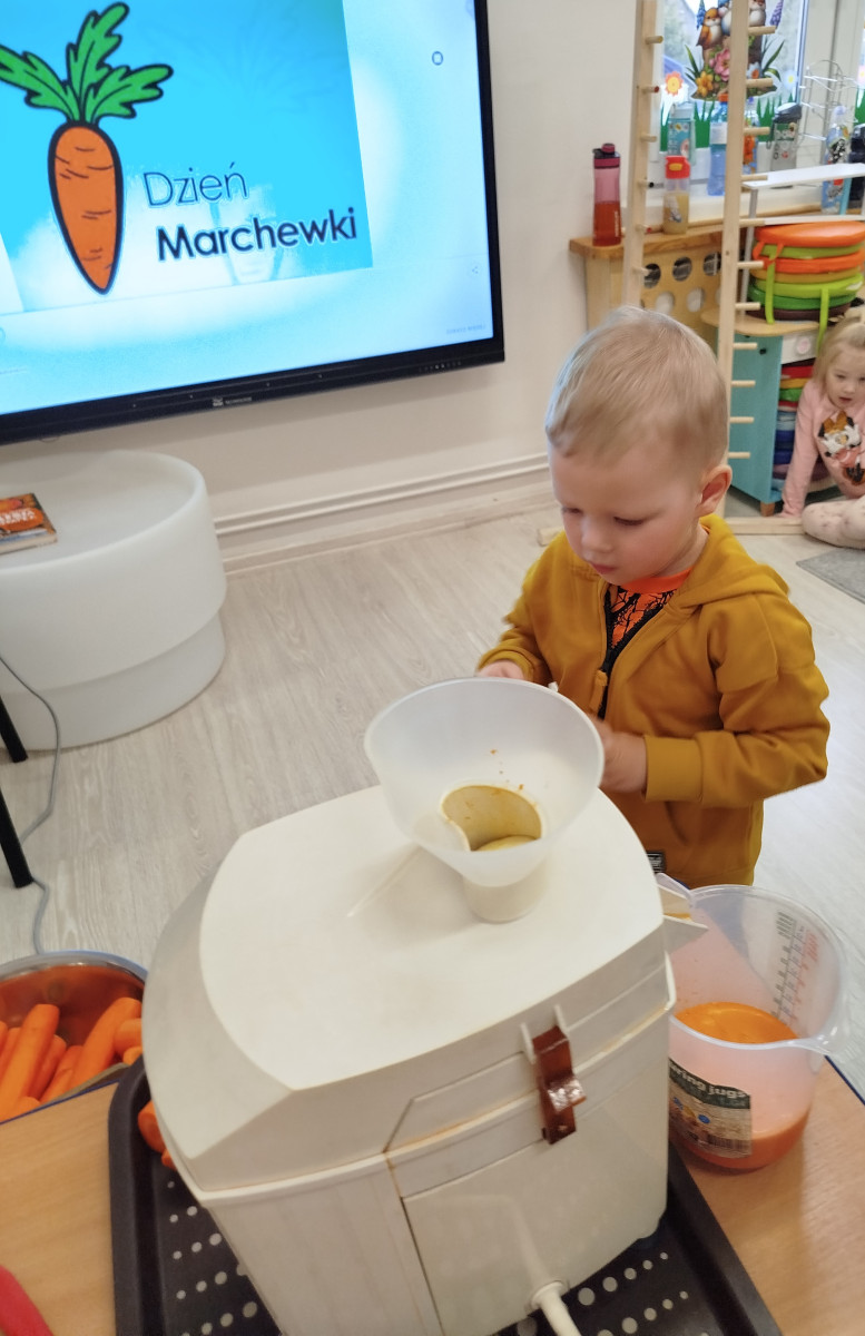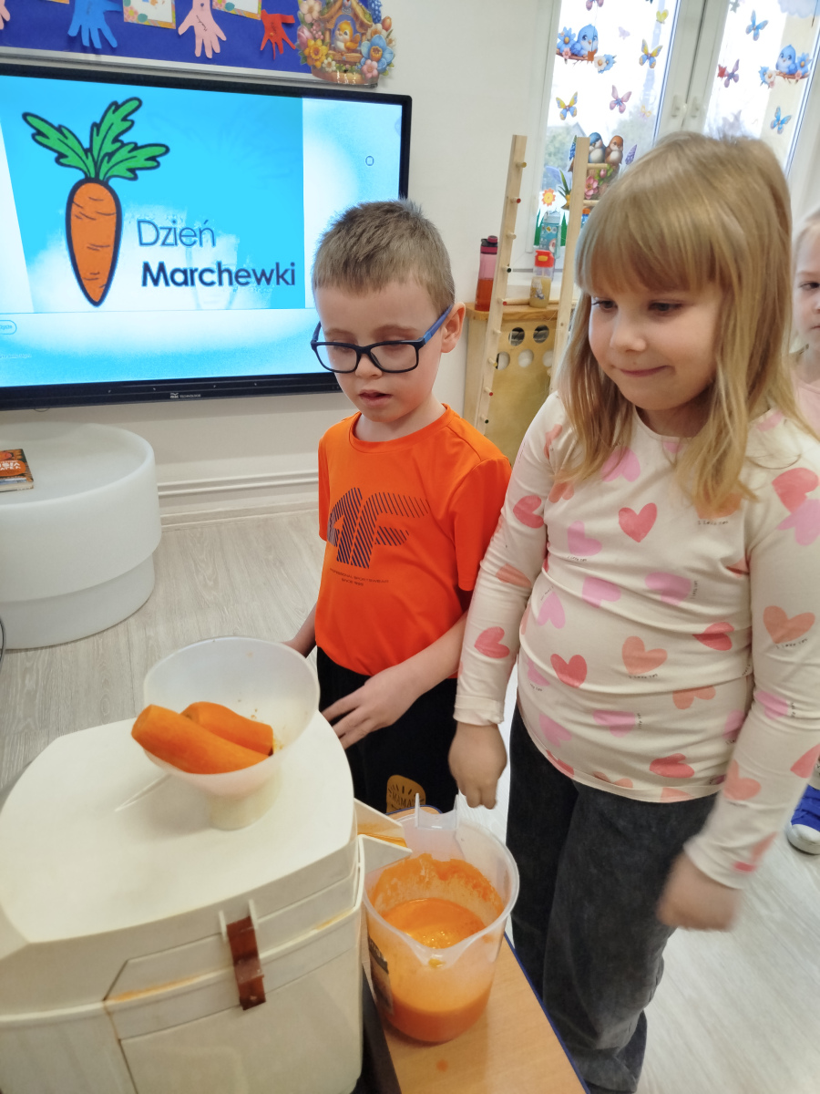 8 kwietnia nasze przedszkolaki obchodziły Dzień Marchewki, który miał na celu uświadomienie dzieciom walorów smakowych i wartości odżywczych jakie zawiera marchewka oraz zachęcenie dzieci do jedzenia tego warzywa. Dzieci w tym dniu przyszły do przedszkola ubrane na pomarańczowo. Przedszkolaki wspólnie robiły sok marchewkowo-jabłkowy, który bardzo dzieciom smakował. Na zajęciach rozwijały sprawność manualną wykonując prace plastyczne, utrwalały umiejętność przeliczania, poznały wartości odżywcze marchewki. Badały marchewkę zmysłem dotyku oraz je degustowały.