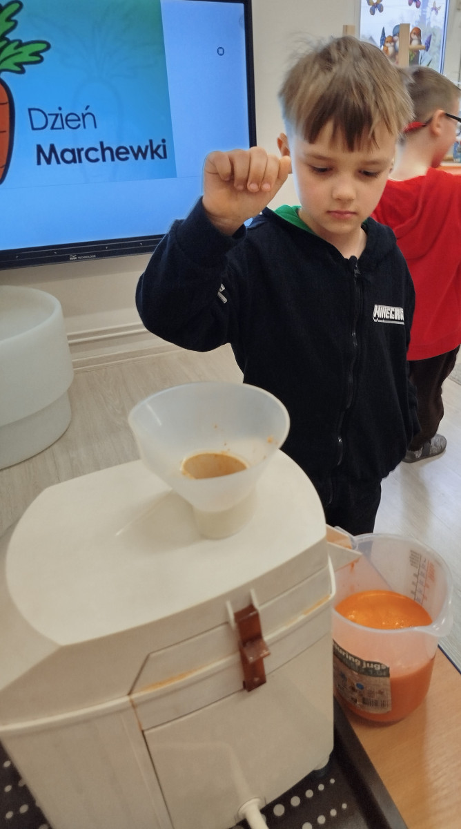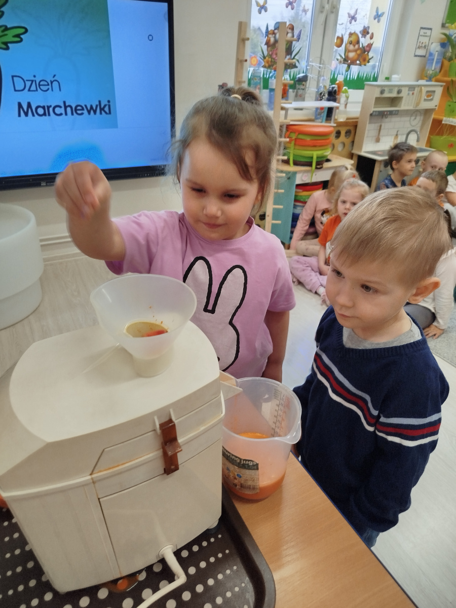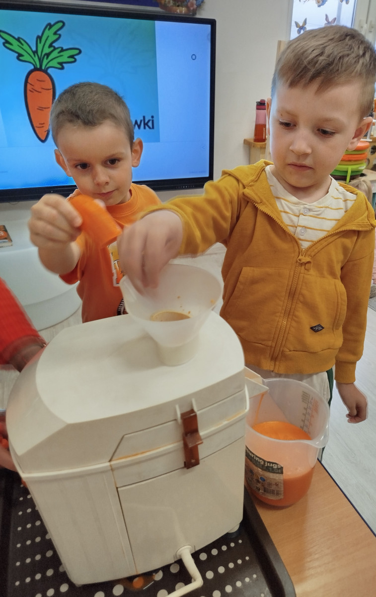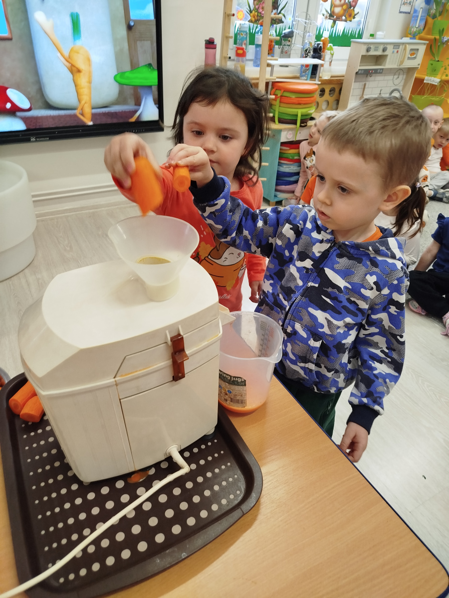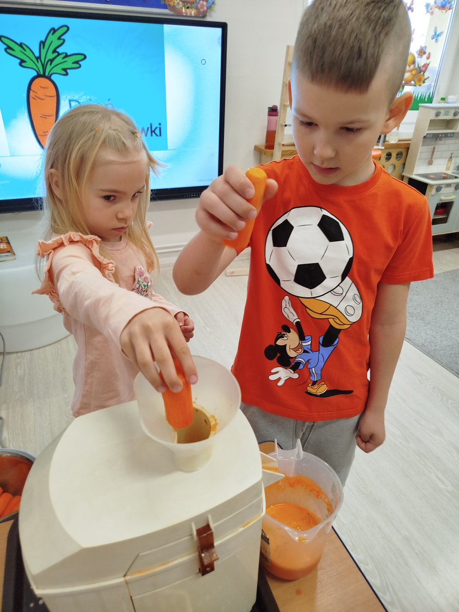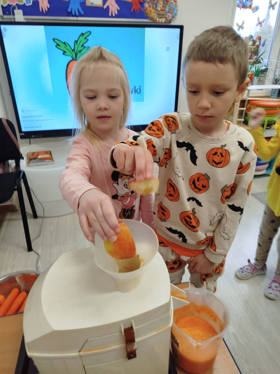 8 kwietnia nasze przedszkolaki obchodziły Dzień Marchewki, który miał na celu uświadomienie dzieciom walorów smakowych i wartości odżywczych jakie zawiera marchewka oraz zachęcenie dzieci do jedzenia tego warzywa. Dzieci w tym dniu przyszły do przedszkola ubrane na pomarańczowo. Przedszkolaki wspólnie robiły sok marchewkowo-jabłkowy, który bardzo dzieciom smakował. Na zajęciach rozwijały sprawność manualną wykonując prace plastyczne, utrwalały umiejętność przeliczania, poznały wartości odżywcze marchewki. Badały marchewkę zmysłem dotyku oraz je degustowały.