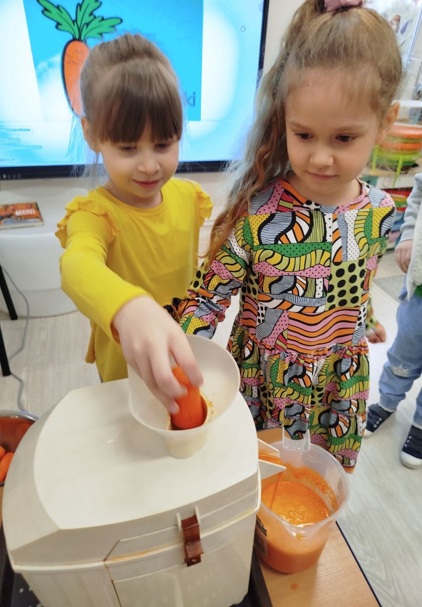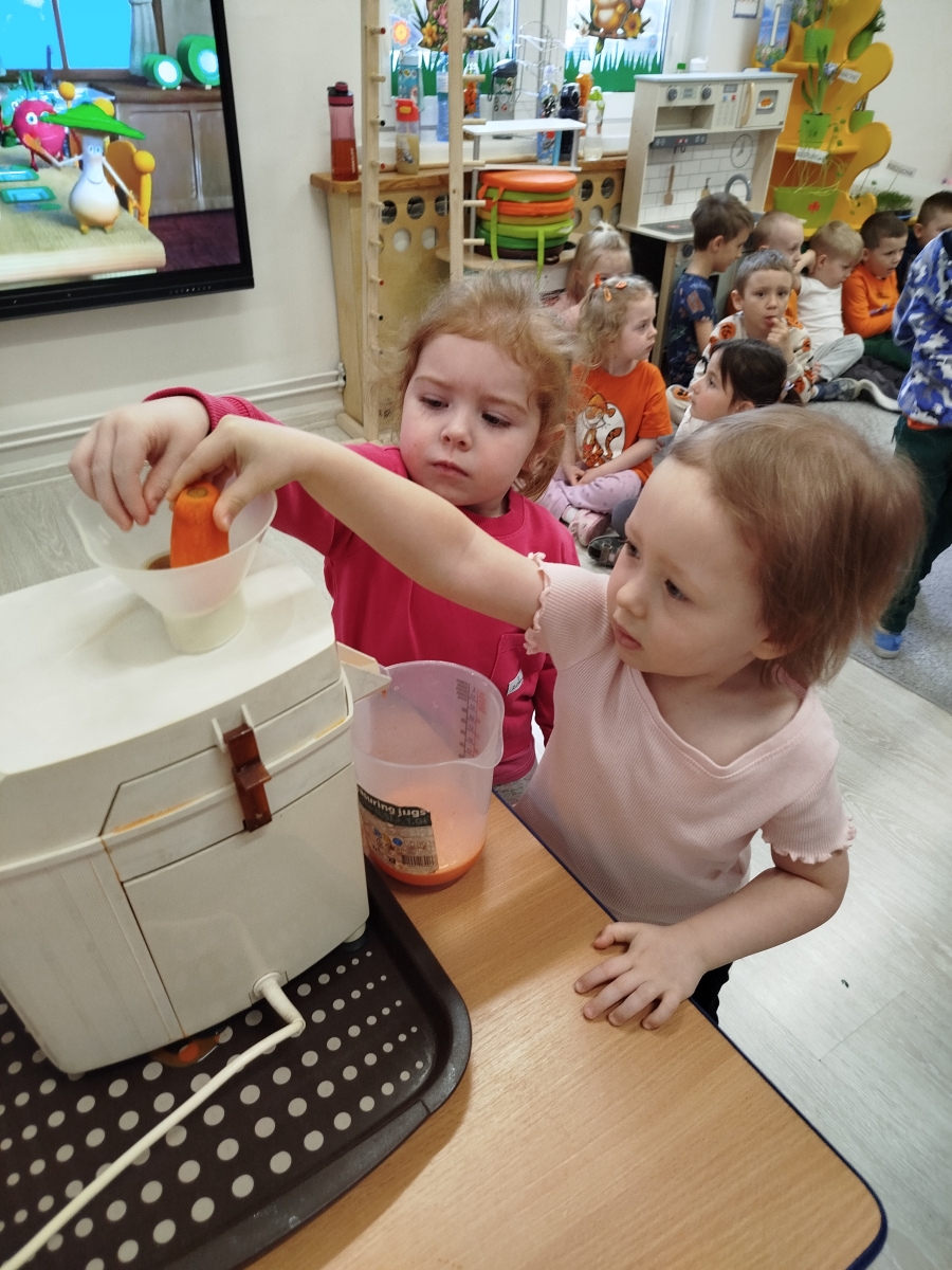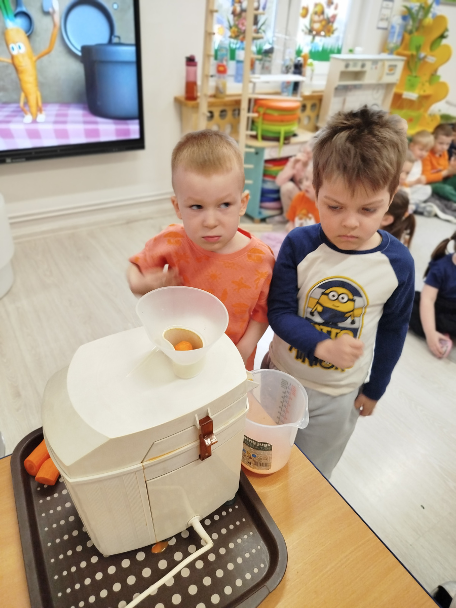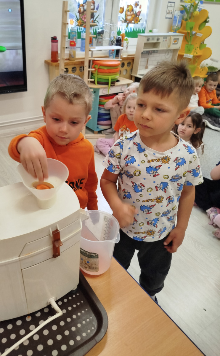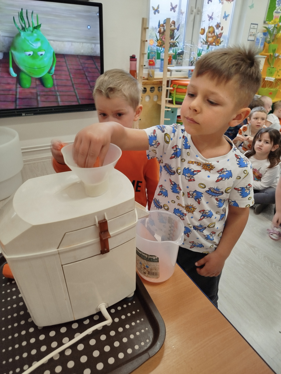 8 kwietnia nasze przedszkolaki obchodziły Dzień Marchewki, który miał na celu uświadomienie dzieciom walorów smakowych i wartości odżywczych jakie zawiera marchewka oraz zachęcenie dzieci do jedzenia tego warzywa. Dzieci w tym dniu przyszły do przedszkola ubrane na pomarańczowo. Przedszkolaki wspólnie robiły sok marchewkowo-jabłkowy, który bardzo dzieciom smakował. Na zajęciach rozwijały sprawność manualną wykonując prace plastyczne, utrwalały umiejętność przeliczania, poznały wartości odżywcze marchewki. Badały marchewkę zmysłem dotyku oraz je degustowały.