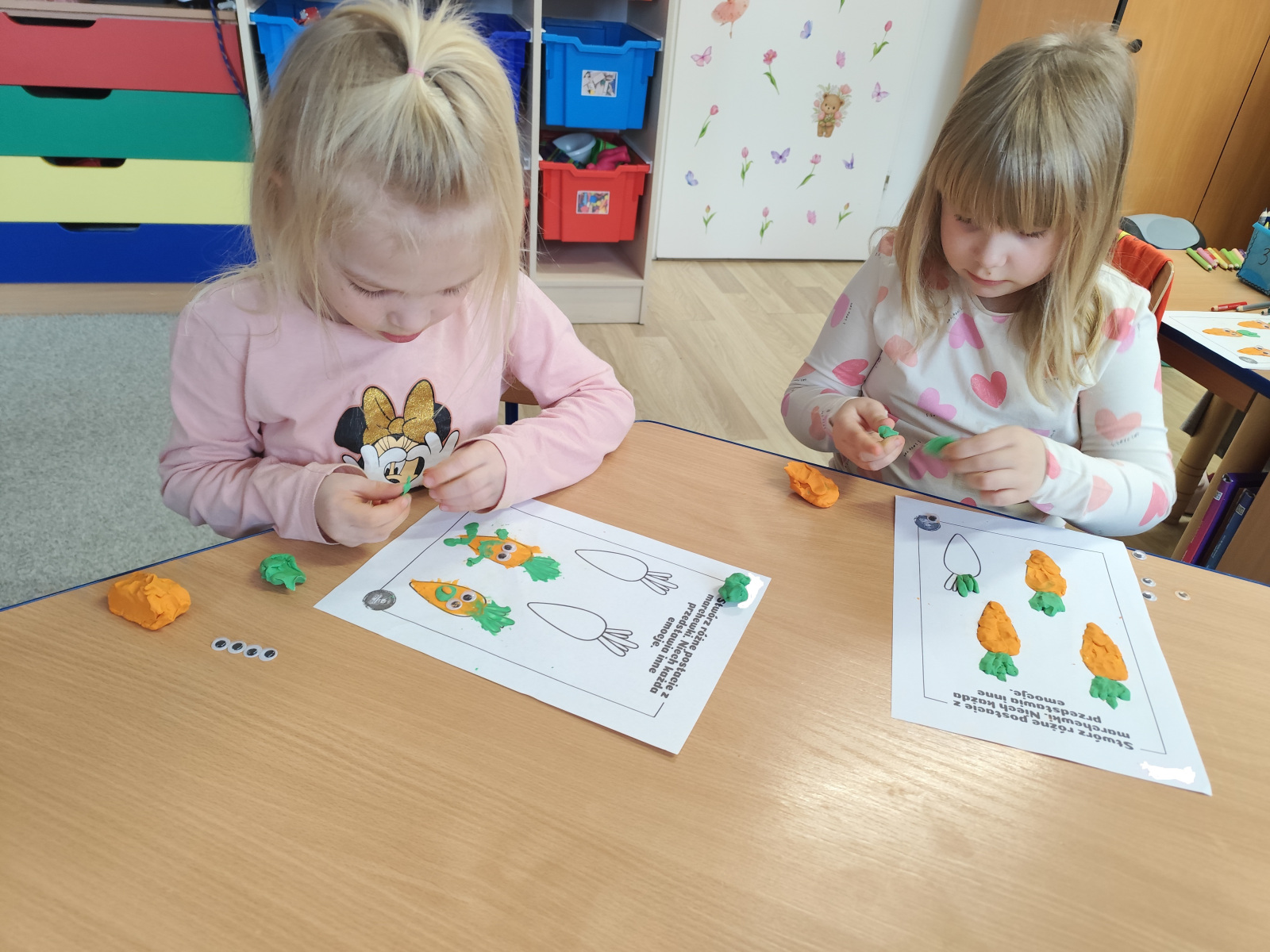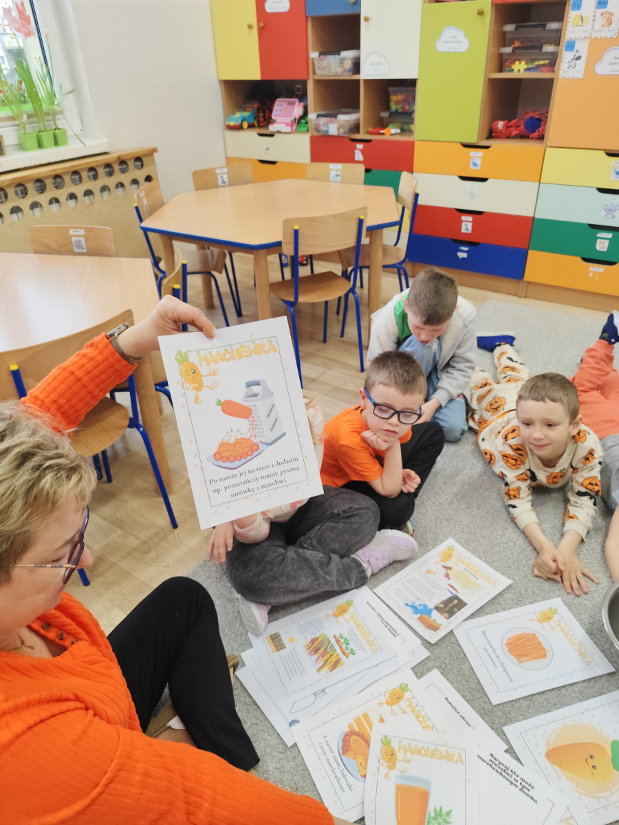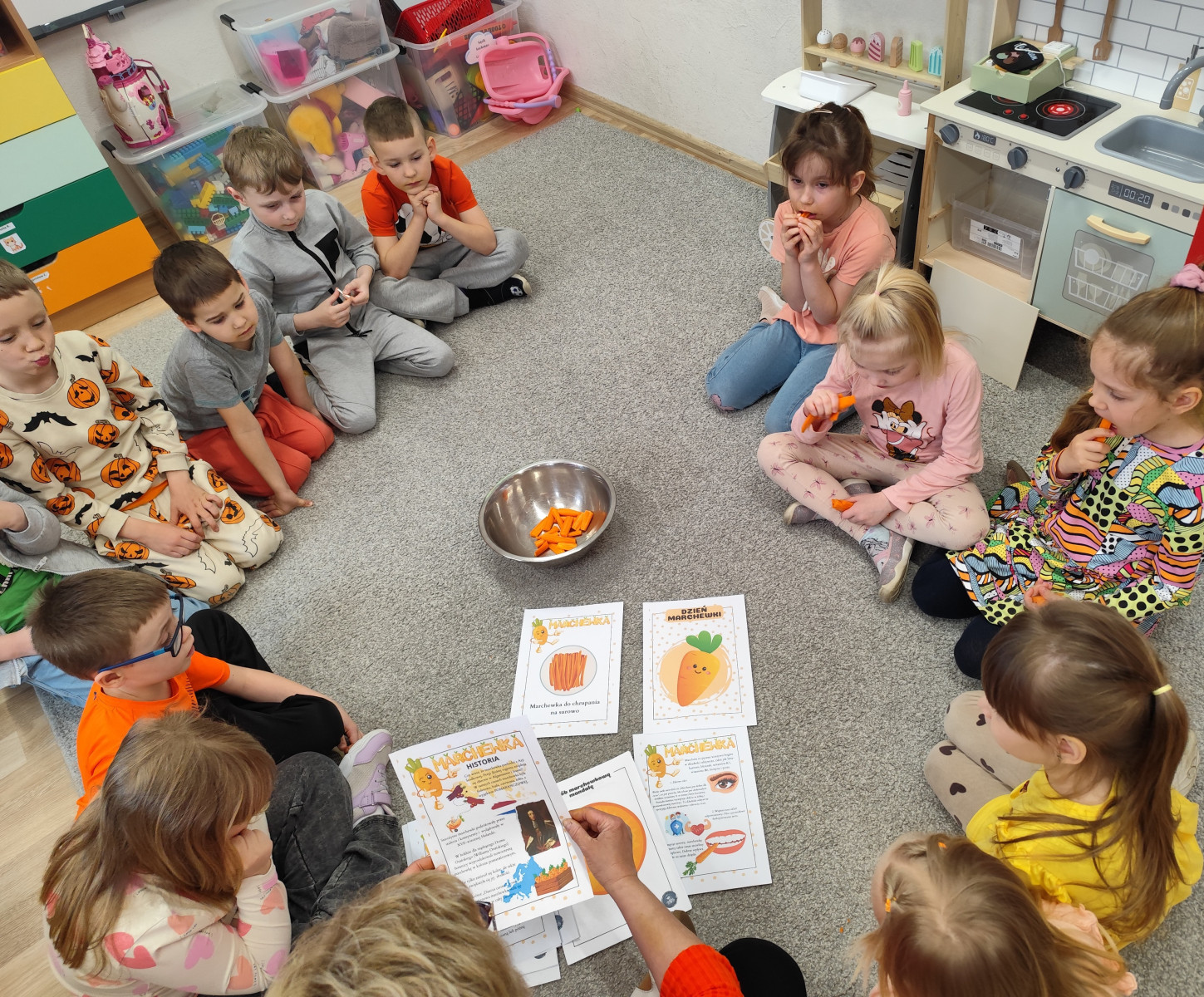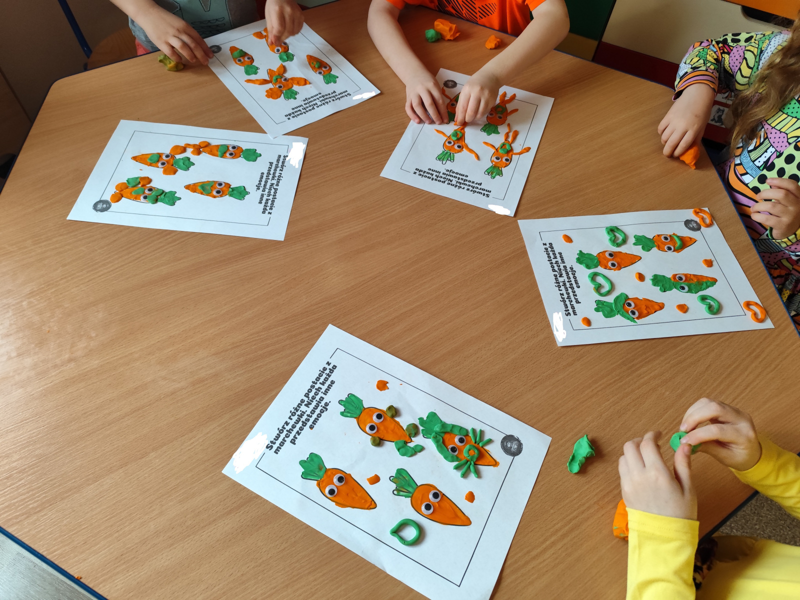 8 kwietnia nasze przedszkolaki obchodziły Dzień Marchewki, który miał  na celu uświadomienie dzieciom walorów smakowych i wartości odżywczych jakie zawiera marchewka oraz zachęcenie dzieci do jedzenia tego warzywa. Dzieci w tym dniu przyszły do przedszkola ubrane na pomarańczowo. Przedszkolaki wspólnie robiły sok marchewkowo-jabłkowy, który bardzo dzieciom smakował. Na zajęciach rozwijały sprawność manualną wykonując prace plastyczne, utrwalały umiejętność przeliczania, poznały wartości odżywcze marchewki. Badały marchewkę zmysłem dotyku oraz je degustowały.