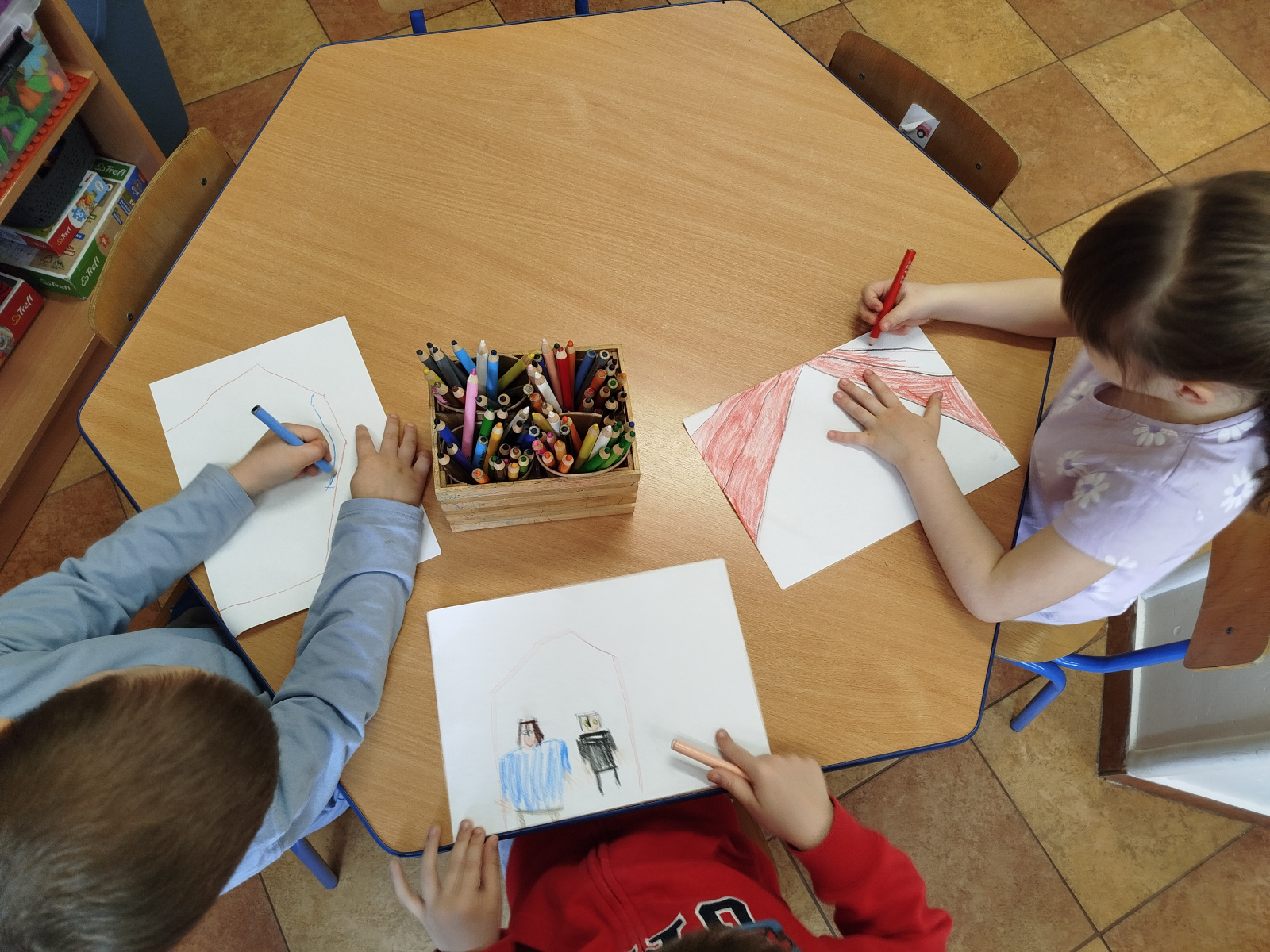 Nasze Pszczółki wykazały się też ogromną kreatywnością – samodzielnie stworzyły ilustrację do wymyślonej przez siebie sztuki teatralnej, której nadały tytuł „Przygody Jasia i Małgosi”. 🌈🎨To był dzień pełen zabawy, emocji i teatralnych wrażeń! 👏🎬