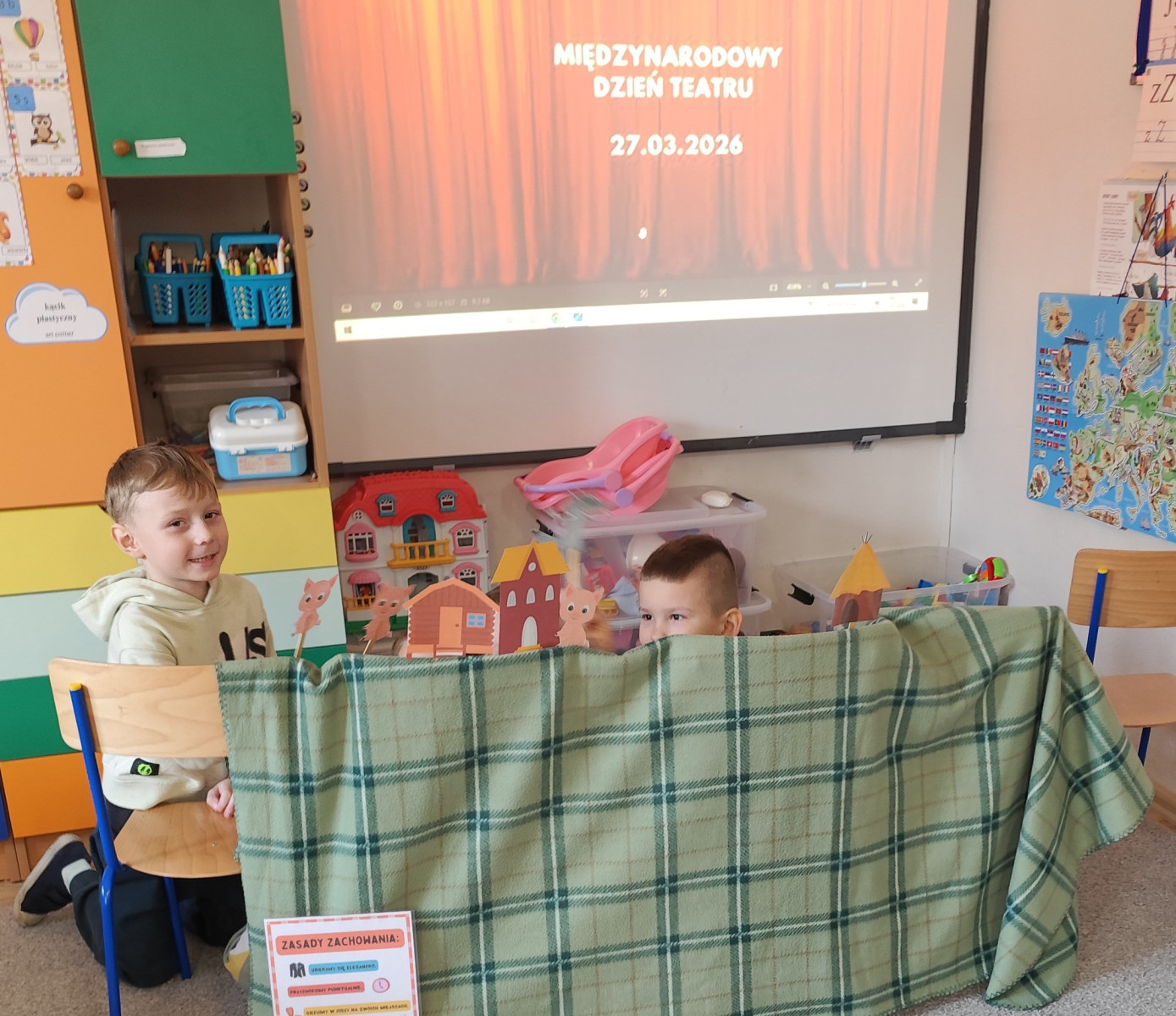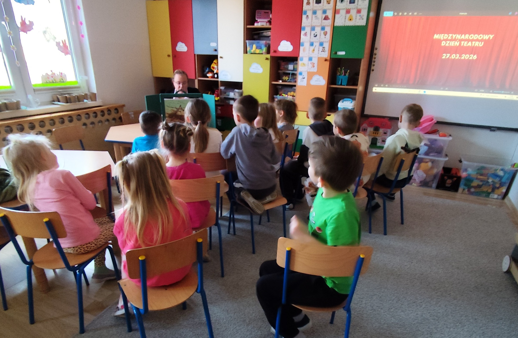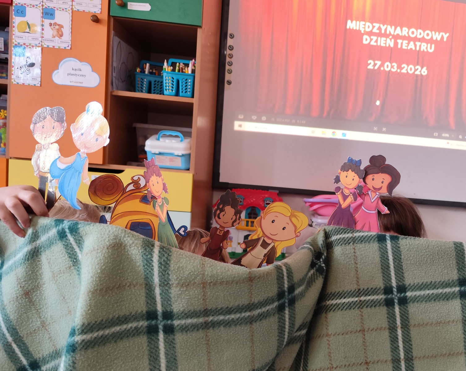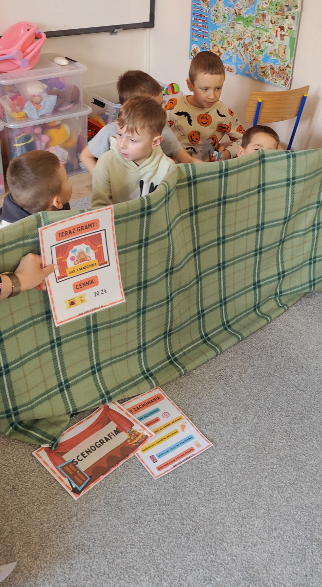 27 marca dzieci przeniosły się w wirtualny świat teatru, poznając jego różne rodzaje i mając możliwość wcielenia się w rolę aktorów. Szczególnym zainteresowaniem cieszył się teatrzyk kamishibai z bajkami „Panach Palcach” oraz „Brzydkie Kaczątko”. 📖✨