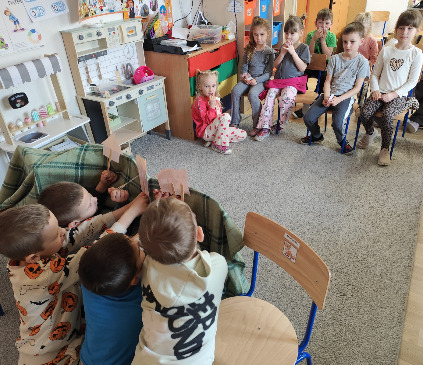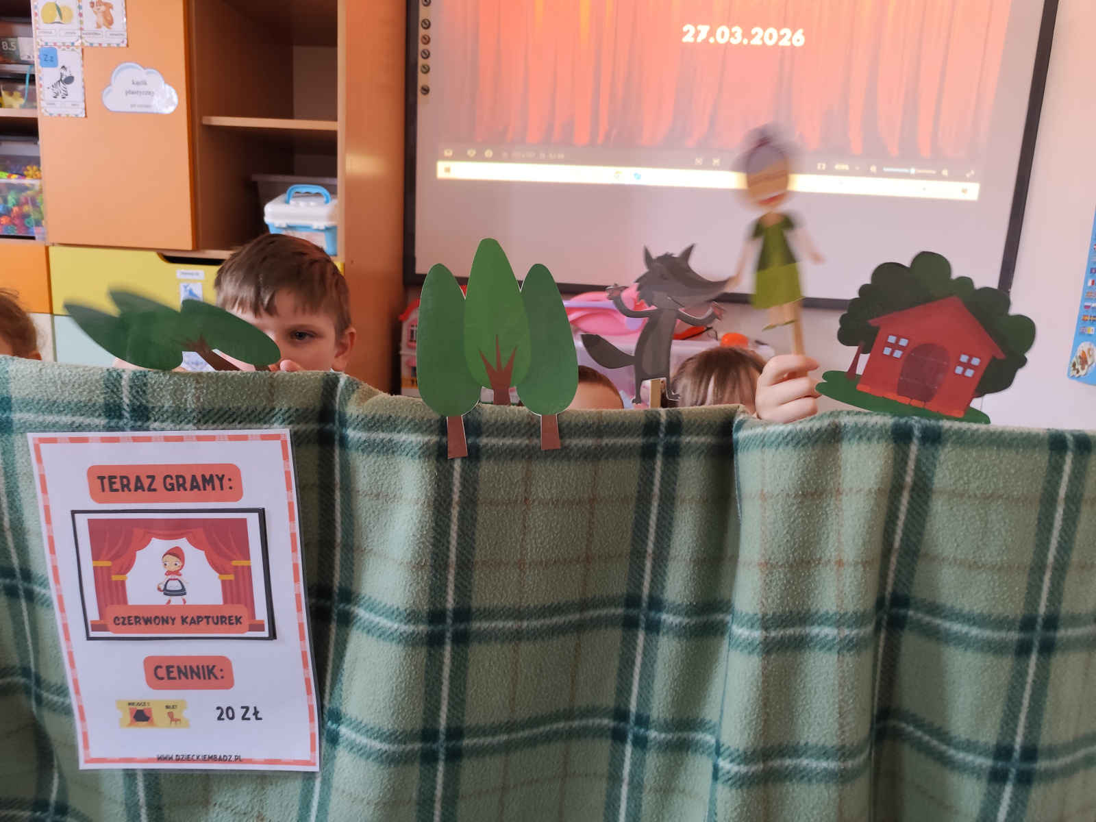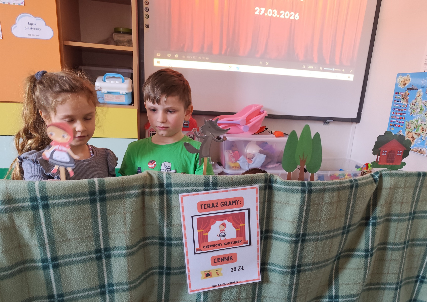 27 marca dzieci przeniosły się w wirtualny świat teatru, poznając jego różne rodzaje i mając możliwość wcielenia się w rolę aktorów. Szczególnym zainteresowaniem cieszył się teatrzyk kamishibai z bajkami „Panach Palcach” oraz „Brzydkie Kaczątko”. 📖✨