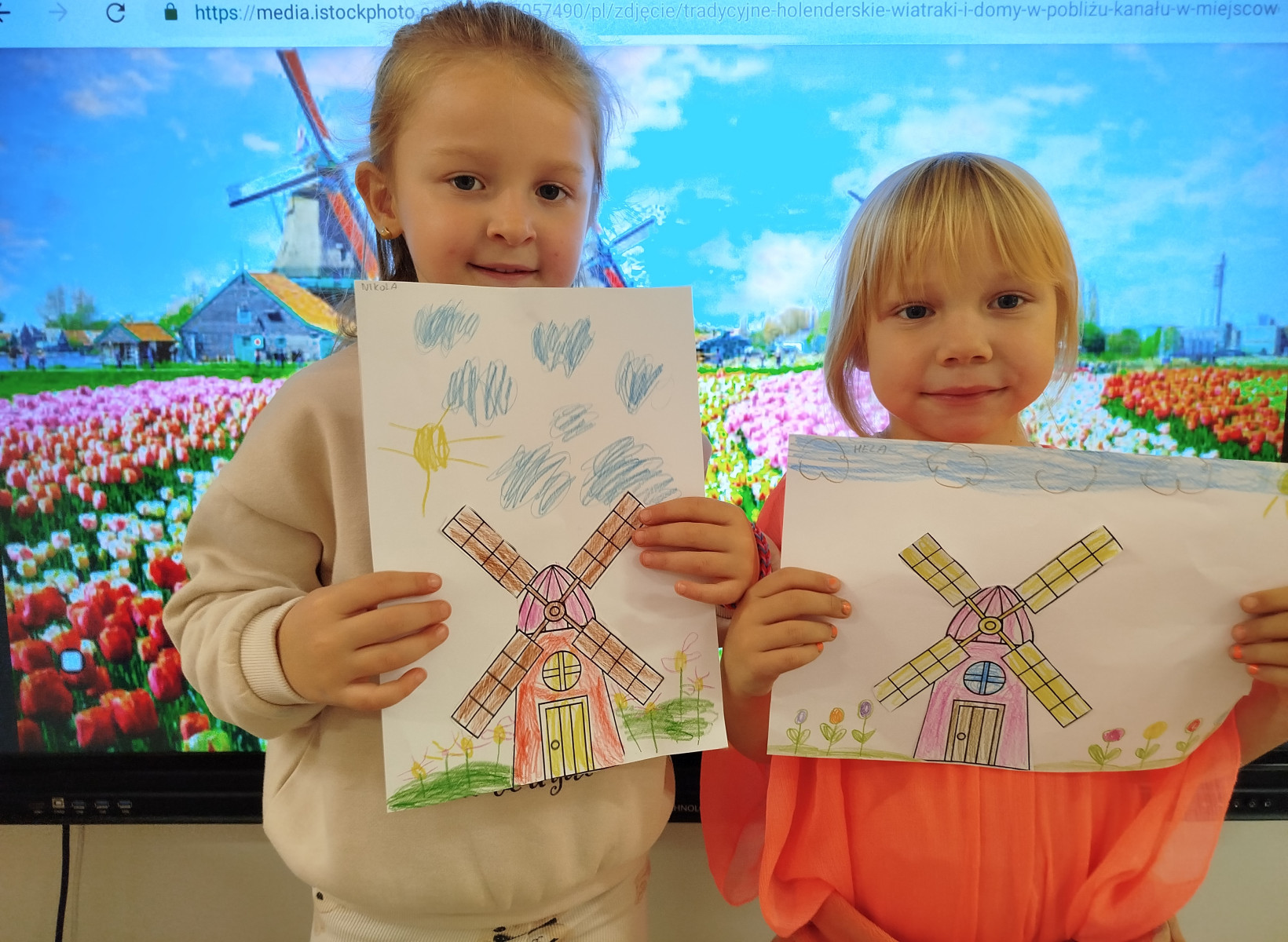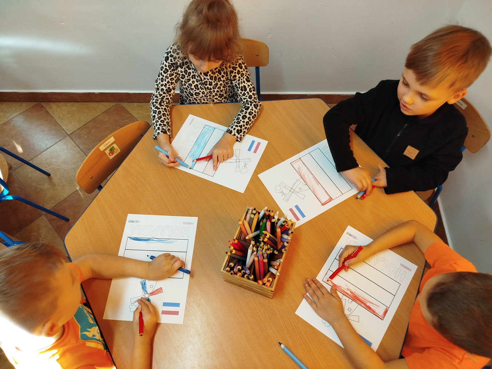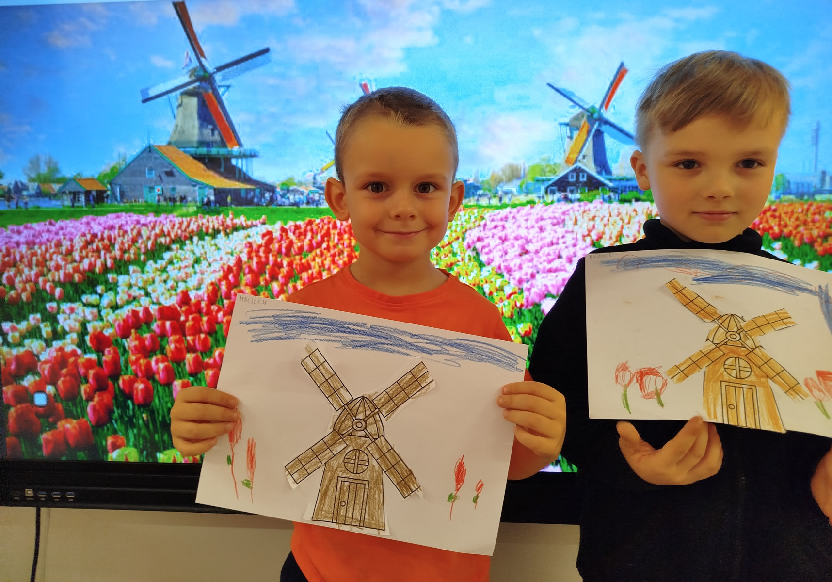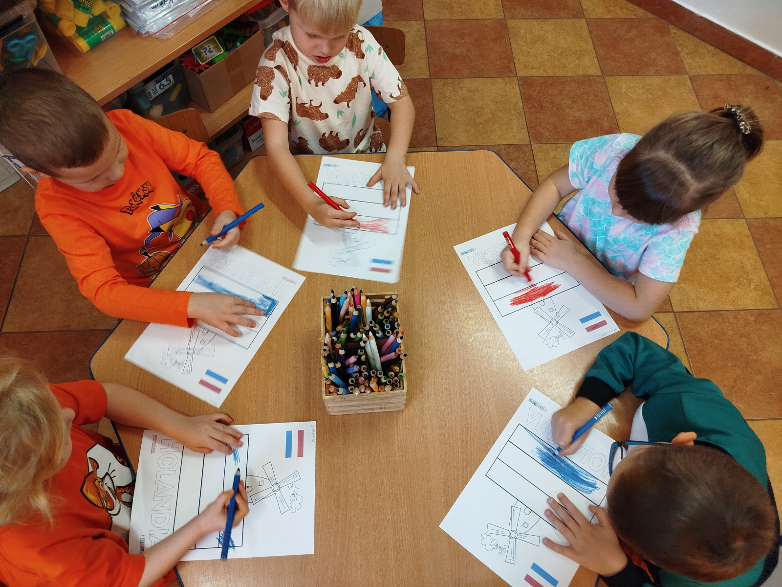 Dzieci starannie wykonały swoje prace, ćwicząc jednocześnie motorykę małą, koncentrację i dokładność. Efekty? Piękne, kolorowe flagi oraz wiatraki, z których każde dziecko było bardzo dumne! 🖍️✨ Nie zabrakło też zabaw ruchowych i rozmów o tym, co wyróżnia Holandię na mapie Europy. Dziękujemy za przygotowanie pomarańczowych strojów — stworzyliśmy prawdziwie holenderski klimat!