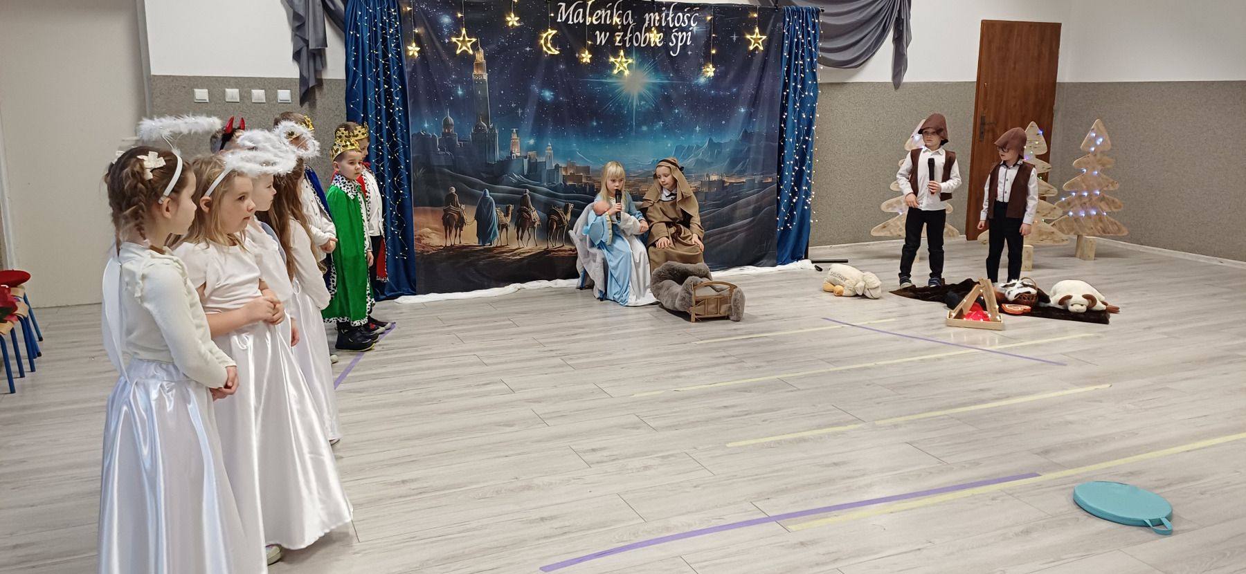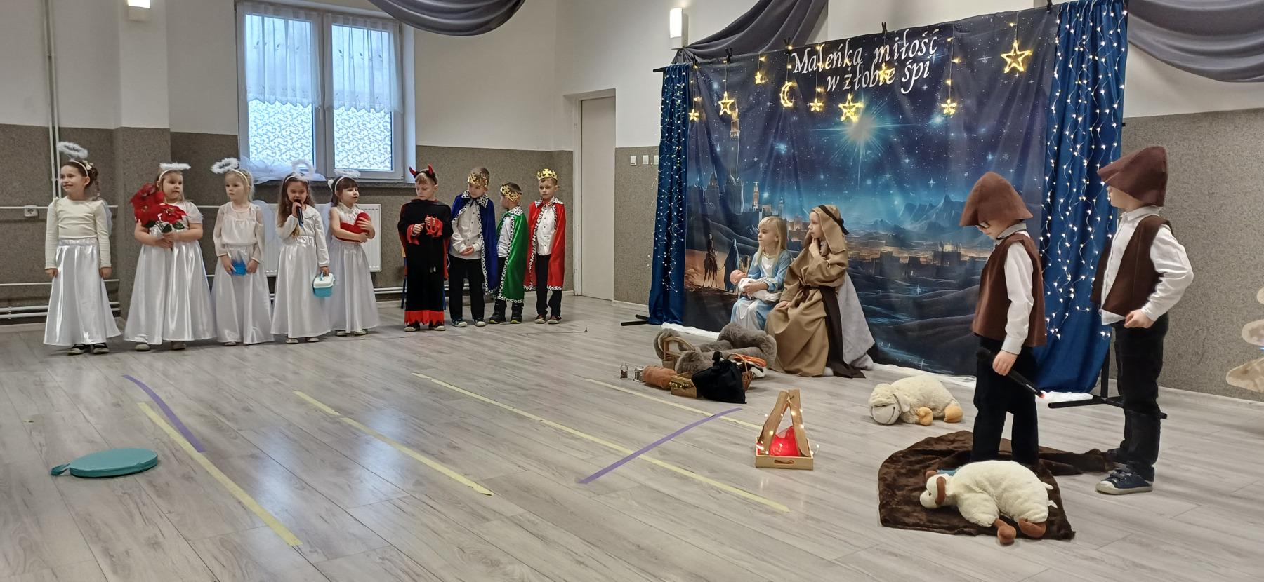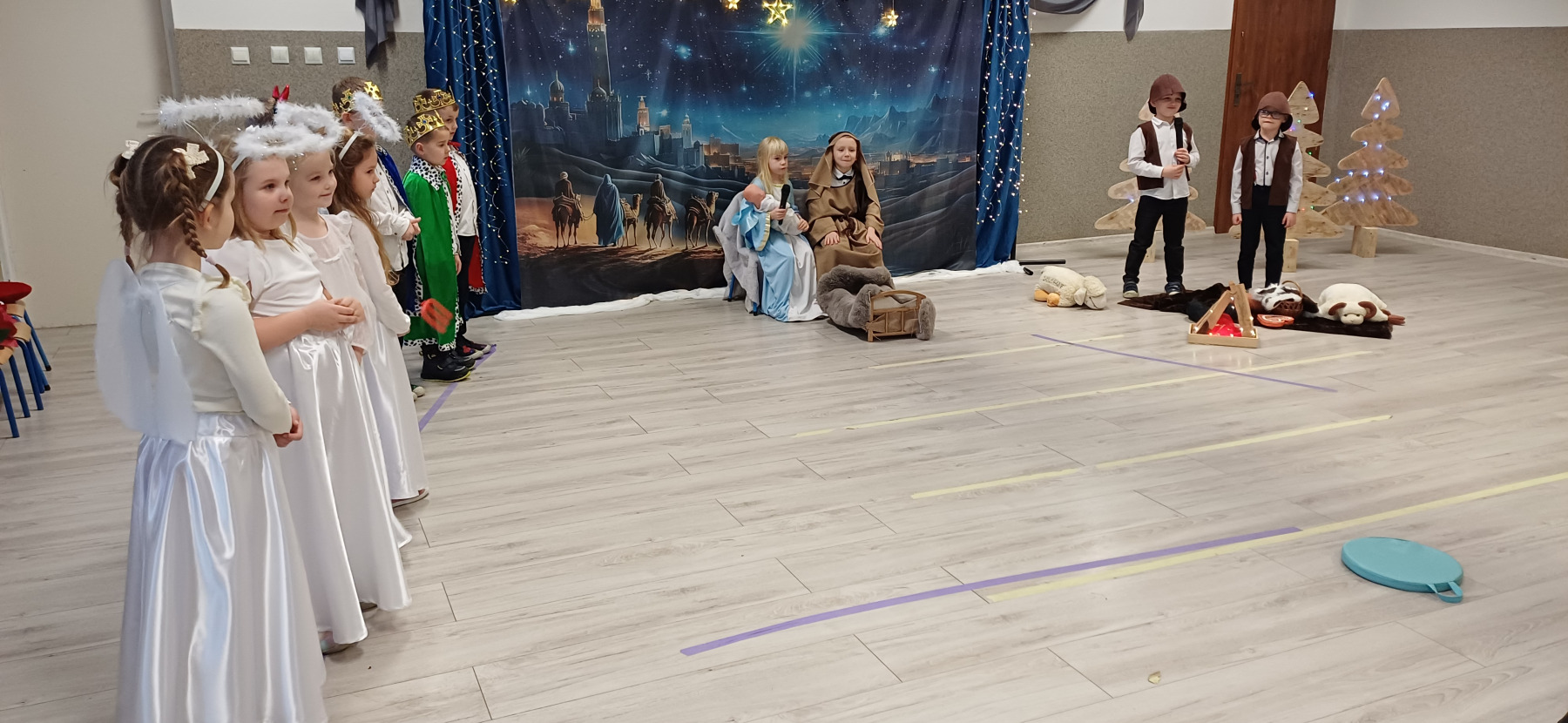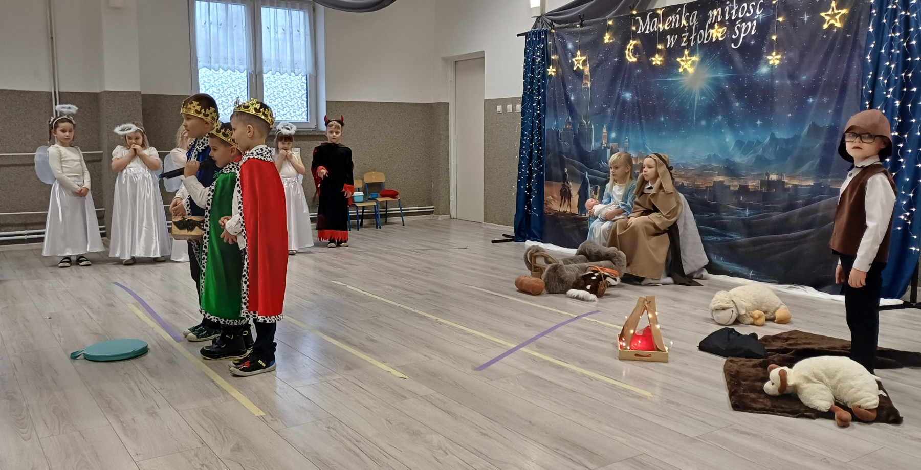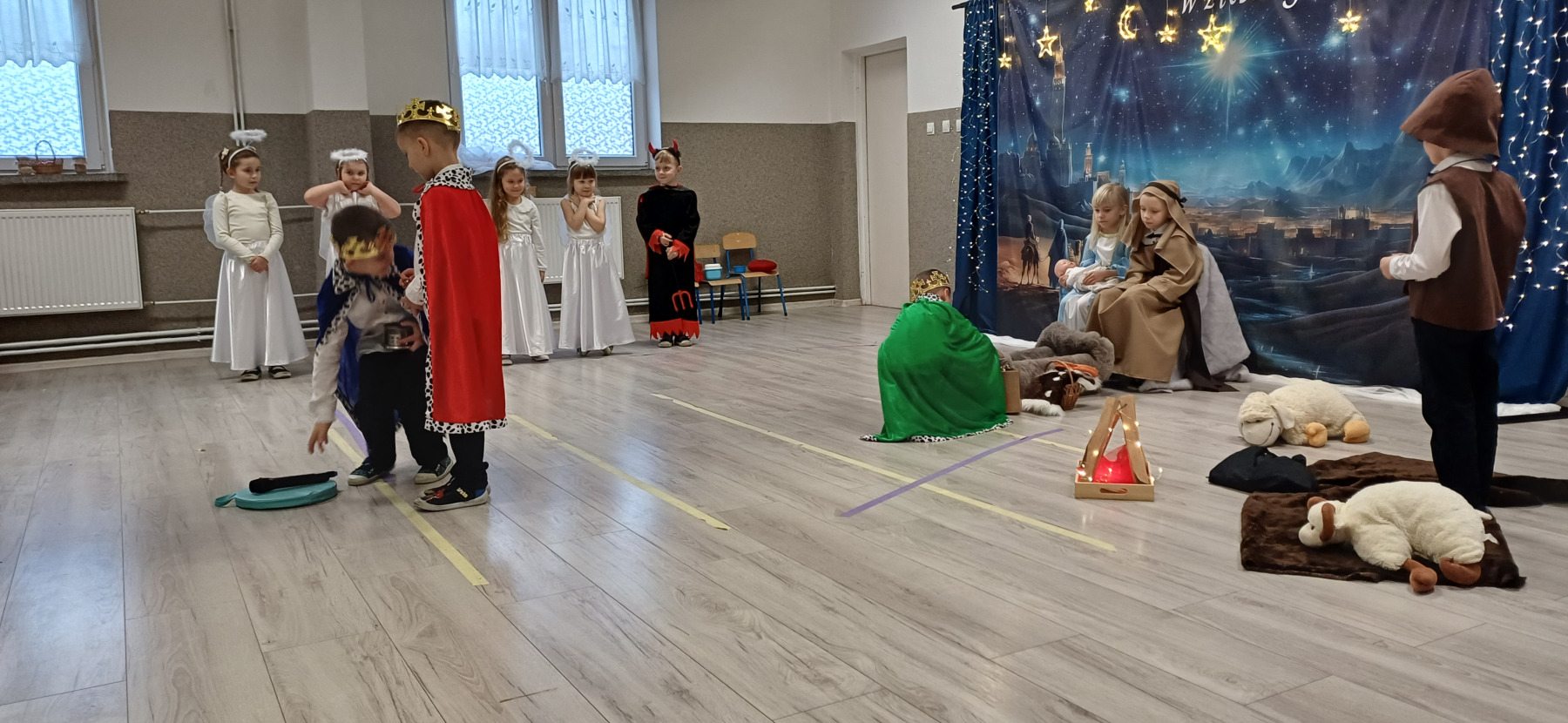 19 grudnia również w naszym przedszkolu odbyła się Uroczystość Jasełek, która od wielu lat wpisana jest do kalendarza uroczystości organizowanych w naszym przedszkolu. Wszyscy czekamy na Boże Narodzenie, domowa krzątanina, zakupy, porządki, zapach pierników i świerkowych gałązek, błyszczące kolorami tęczy świecidełka towarzyszą grudniowym nastrojom. Okres ten uwielbiają dzieci , które przygotowują ozdoby choinkowe, dekoracje świąteczne i uczą się kolęd, pastorałek, wierszy. Atmosferę Świąt dodatkowo oddały przedstawienia Jasełkowe w wykonaniu dzieci z wszystkich grup. W specjalnie przygotowanych kostiumach oraz w pięknej scenografii nawiązującej do Betlejem przedstawili sceny narodzin Chrystusa. Mali aktorzy z dużym przejęciem i poświęceniem wiernie odtworzyli swoje role.