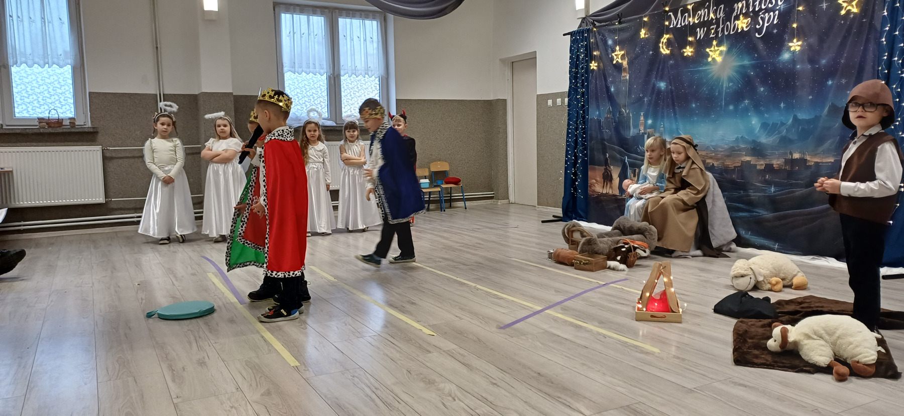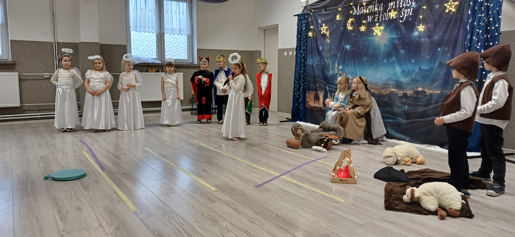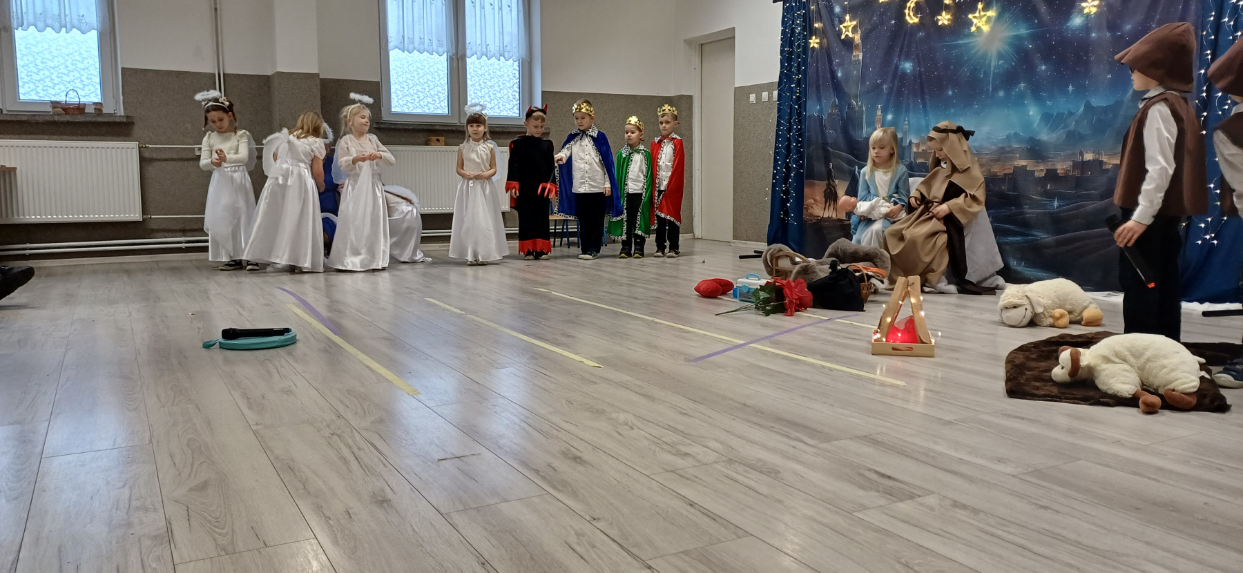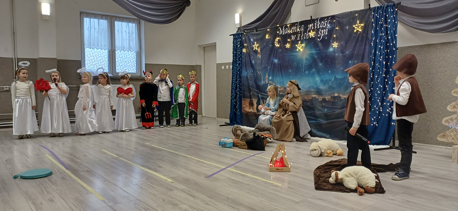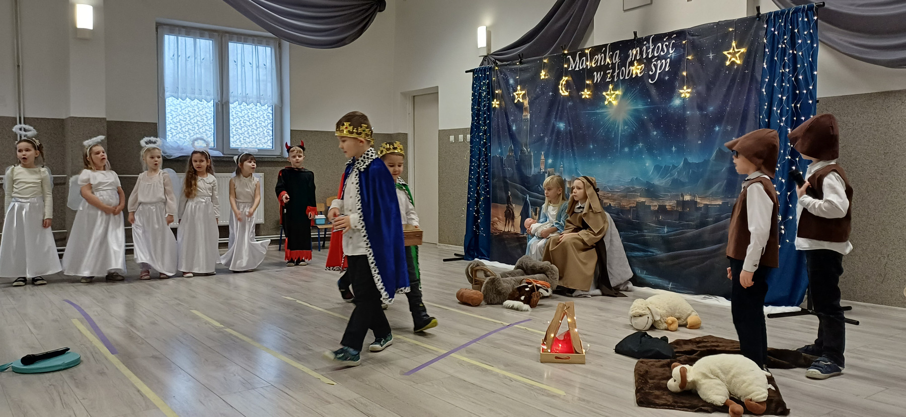 19 grudnia również w naszym przedszkolu odbyła się Uroczystość Jasełek, która od wielu lat wpisana jest do kalendarza uroczystości organizowanych w naszym przedszkolu. Wszyscy czekamy na Boże Narodzenie, domowa krzątanina, zakupy, porządki, zapach pierników i świerkowych gałązek, błyszczące kolorami tęczy świecidełka towarzyszą grudniowym nastrojom. Okres ten uwielbiają dzieci , które przygotowują ozdoby choinkowe, dekoracje świąteczne i uczą się kolęd, pastorałek, wierszy. Atmosferę Świąt dodatkowo oddały przedstawienia Jasełkowe w wykonaniu dzieci z wszystkich grup. W specjalnie przygotowanych kostiumach oraz w pięknej scenografii nawiązującej do Betlejem przedstawili sceny narodzin Chrystusa. Mali aktorzy z dużym przejęciem i poświęceniem wiernie odtworzyli swoje role.
