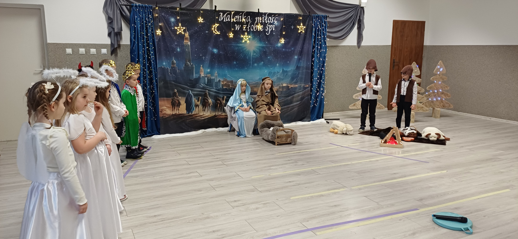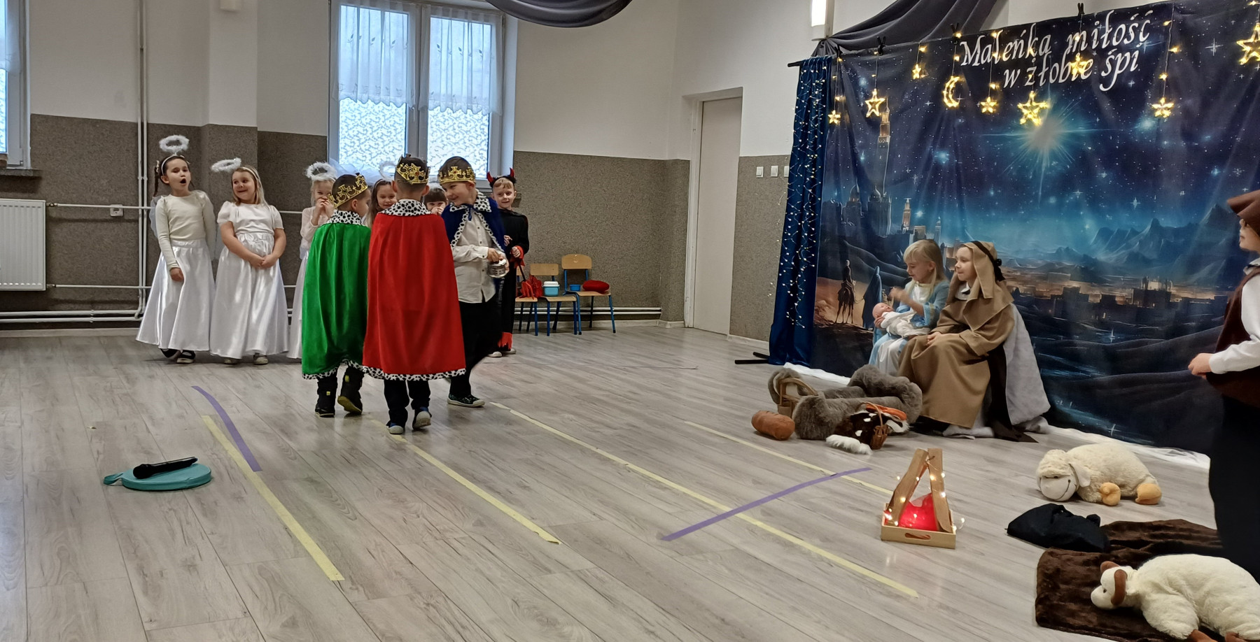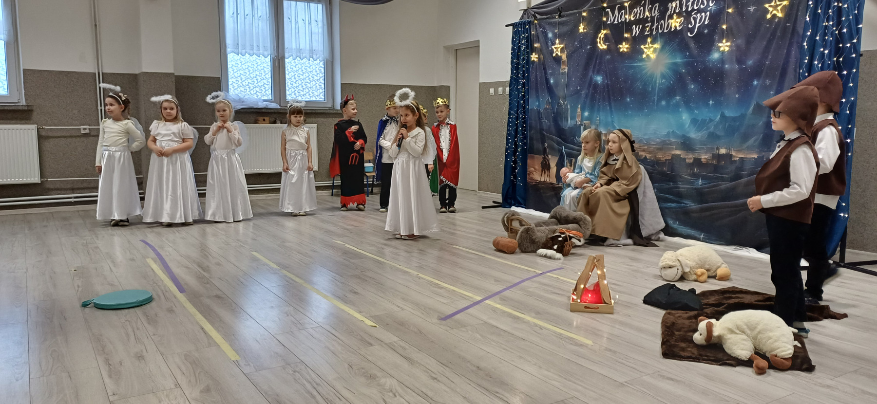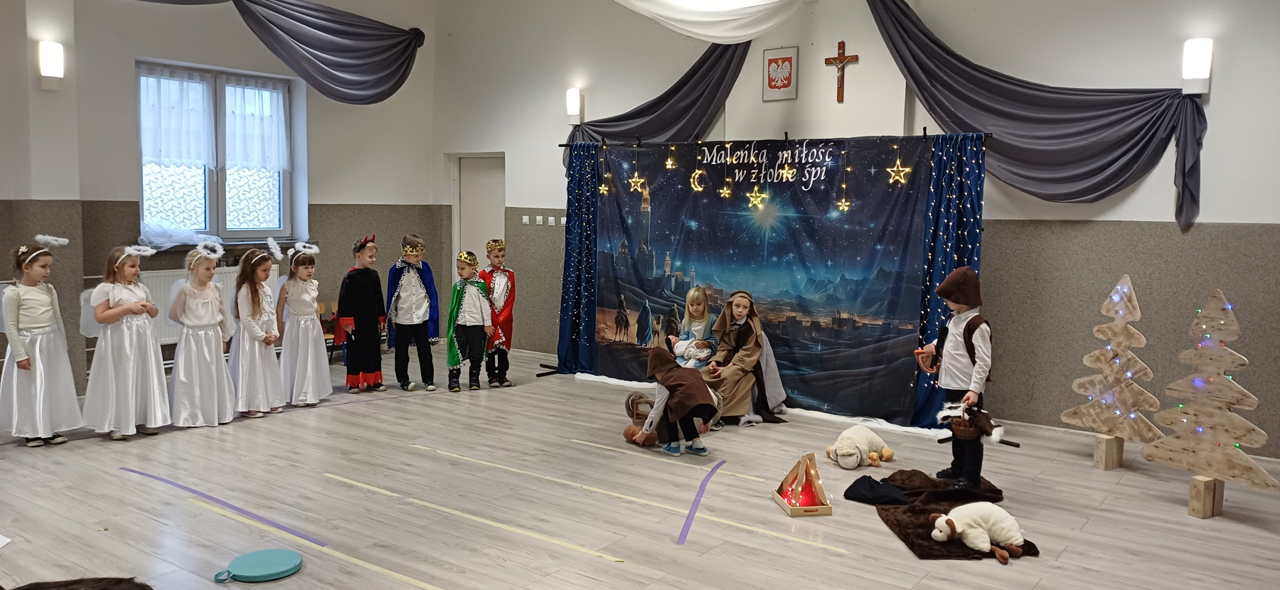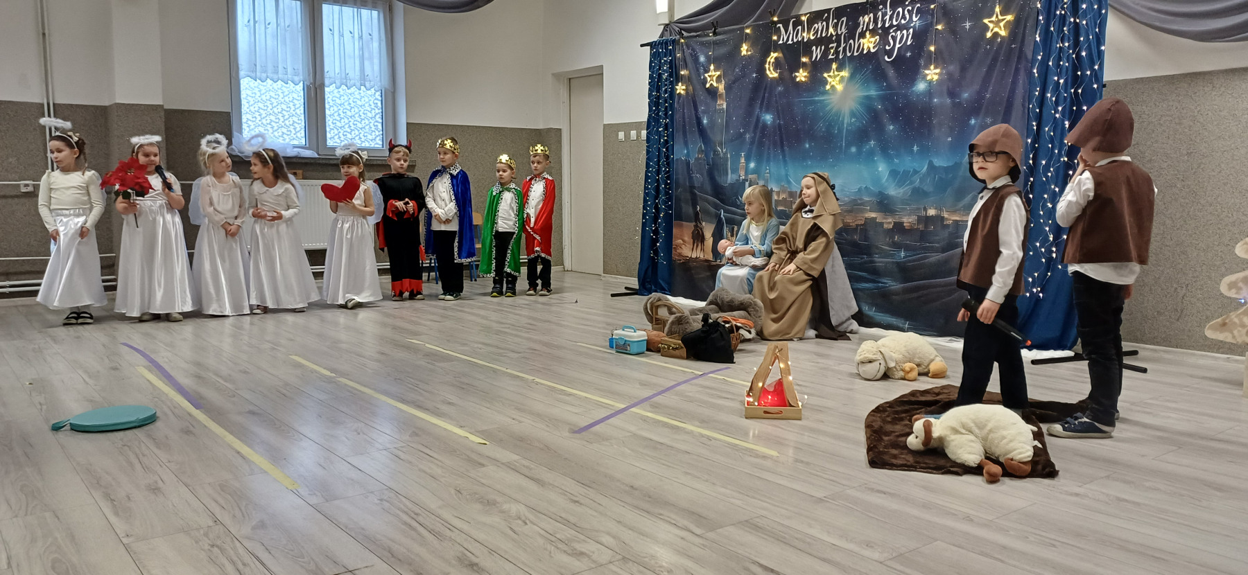 19 grudnia również w naszym przedszkolu odbyła się Uroczystość Jasełek, która od wielu lat wpisana jest do kalendarza uroczystości organizowanych w naszym przedszkolu. Wszyscy czekamy na Boże Narodzenie, domowa krzątanina, zakupy, porządki, zapach pierników i świerkowych gałązek, błyszczące kolorami tęczy świecidełka towarzyszą grudniowym nastrojom. Okres ten uwielbiają dzieci , które przygotowują ozdoby choinkowe, dekoracje świąteczne i uczą się kolęd, pastorałek, wierszy. Atmosferę Świąt dodatkowo oddały przedstawienia Jasełkowe w wykonaniu dzieci z wszystkich grup. W specjalnie przygotowanych kostiumach oraz w pięknej scenografii nawiązującej do Betlejem przedstawili sceny narodzin Chrystusa. Mali aktorzy z dużym przejęciem i poświęceniem wiernie odtworzyli swoje role.