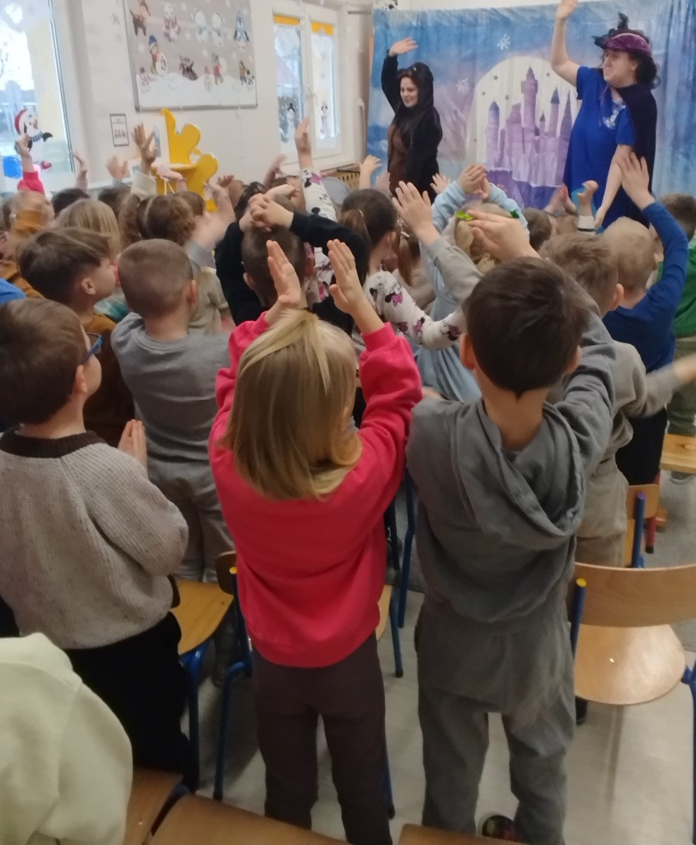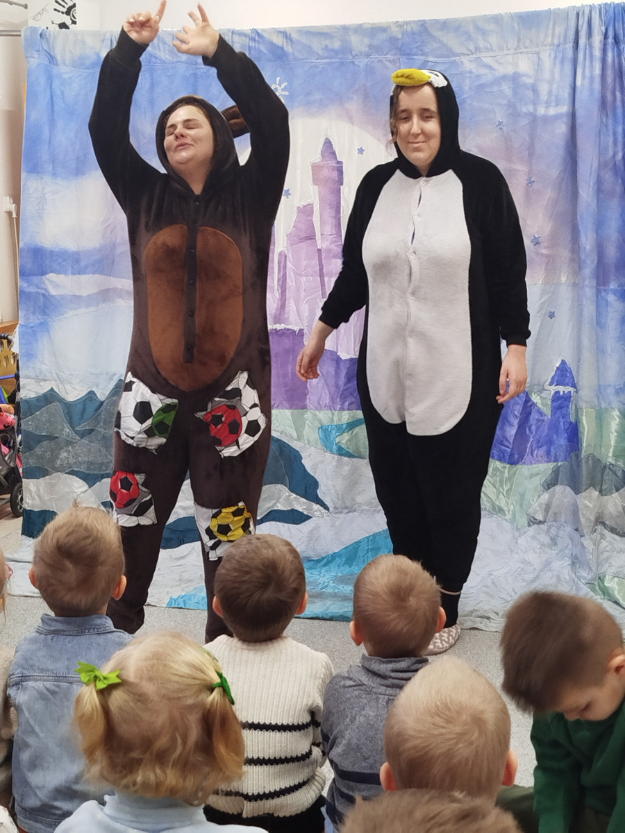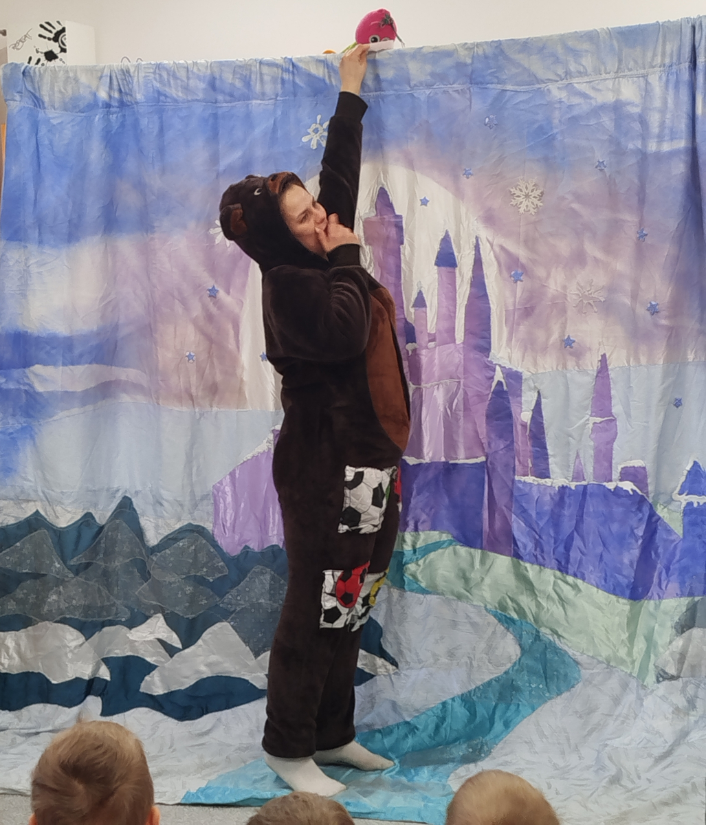 Dzieci z ogromnym zaangażowaniem śledziły przygody bohaterów, którzy pokazali nam, że zima wcale nie jest straszna – wystarczy ciepła czapka, dobry humor i odrobina odwagi! Było dużo śmiechu, wspólnego śpiewania i radosnych emocji 🎶😊 Spektakl przypomniał nam także, jak ważne jest odpowiednie ubieranie się zimą oraz aktywne spędzanie czasu na świeżym powietrzu. Dziękujemy artystom za wspaniałe przedstawienie i już nie możemy się doczekać kolejnych spotkań z teatrem! 🎭✨