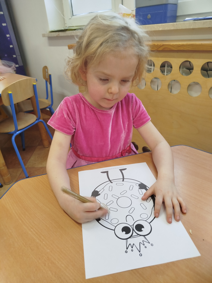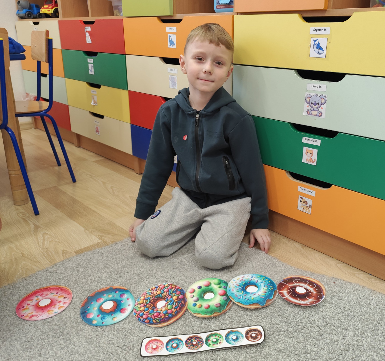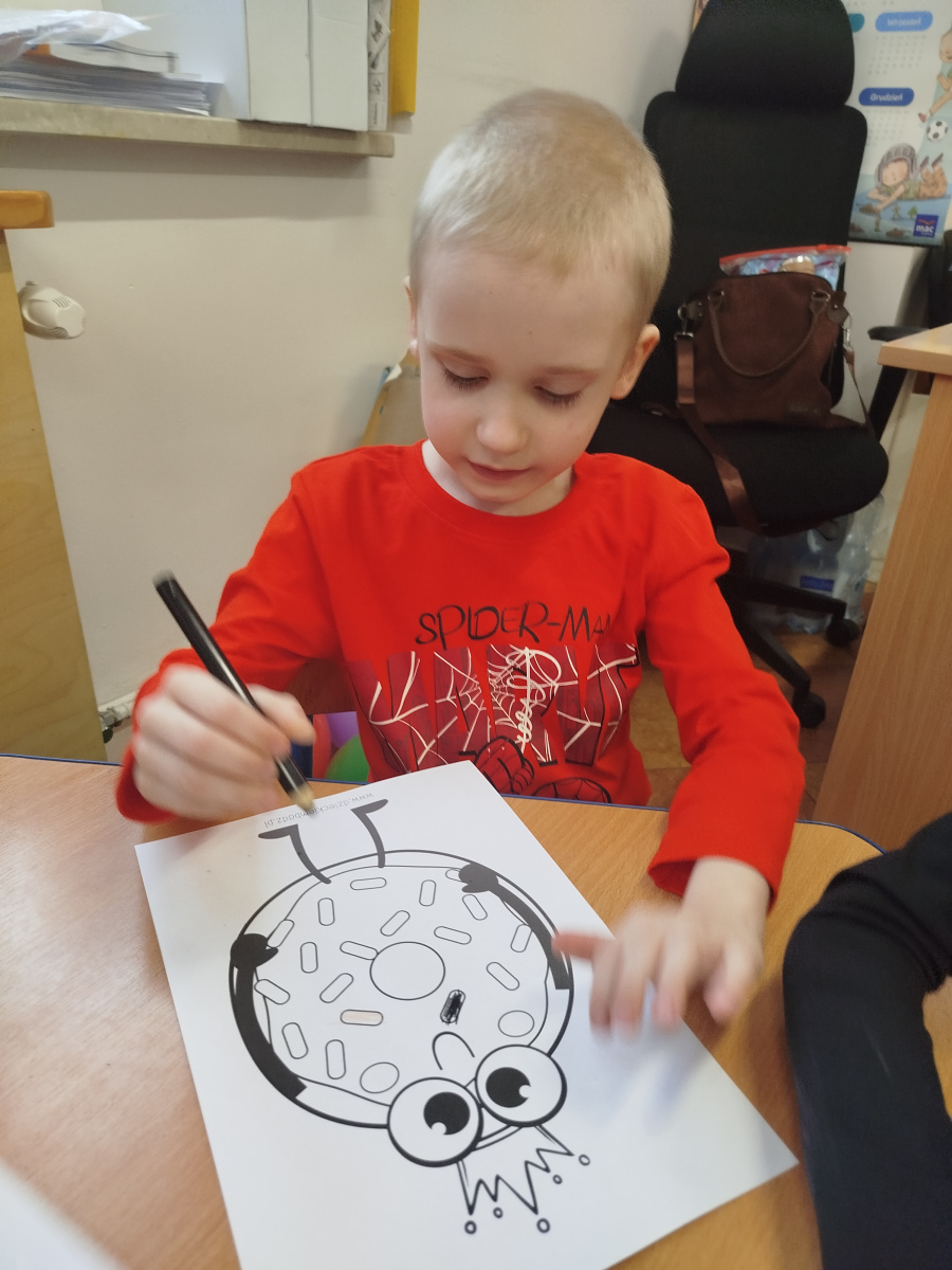 Nasze Przedszkolaki wyruszyły na poszukiwania pączków 🕵️♀️🕵️♂️ – odnajdywały je zgodnie z opisem, ćwicząc uważne słuchanie i logiczne myślenie. Następnie układały pączki według podanych sekwencji – było kolorowo, słodko i bardzo matematycznie! 🎨🔢 Na koniec czekało na nas nie lada wyzwanie ruchowe – dzieci naśladowały „pozycje pączka” z kart, świetnie się przy tym bawiąc i rozwijając koordynację ruchową 🤸♀️🤸♂️