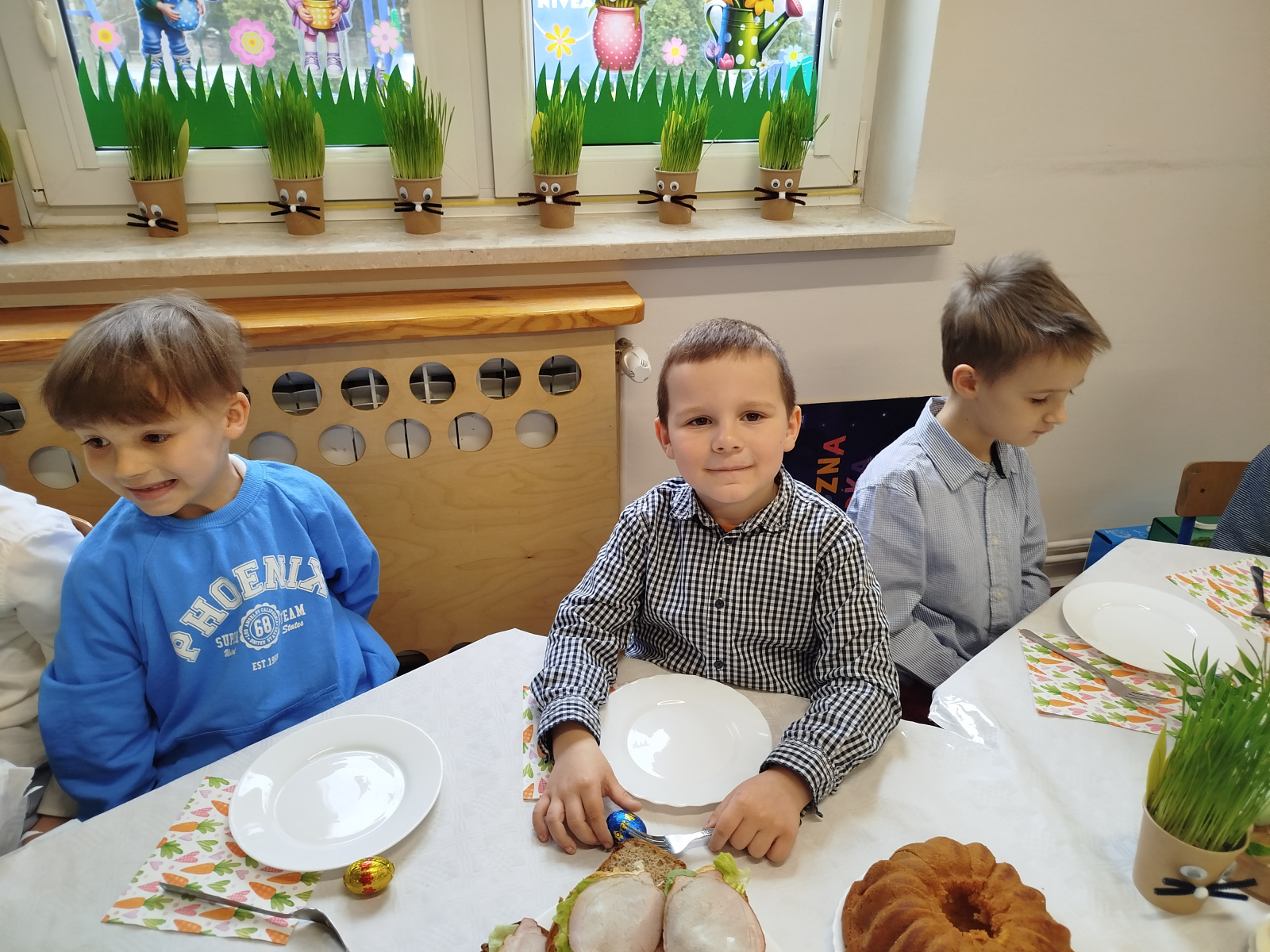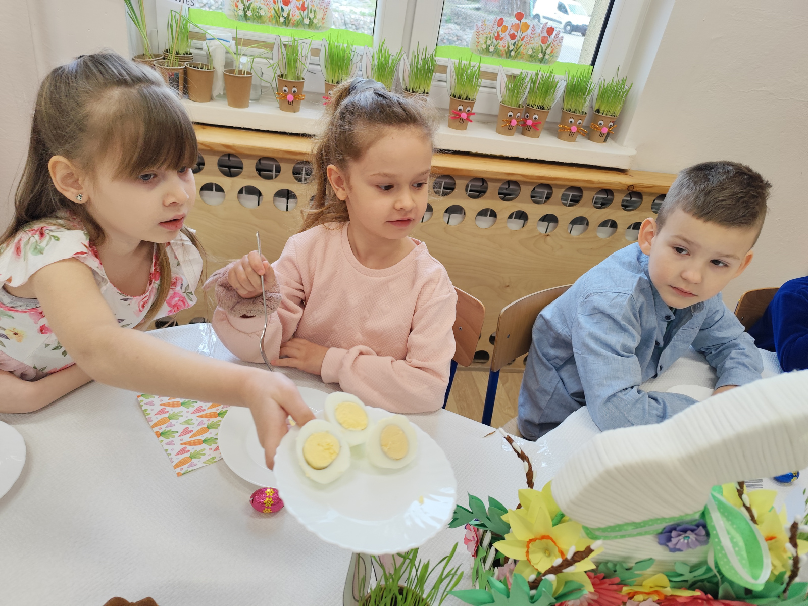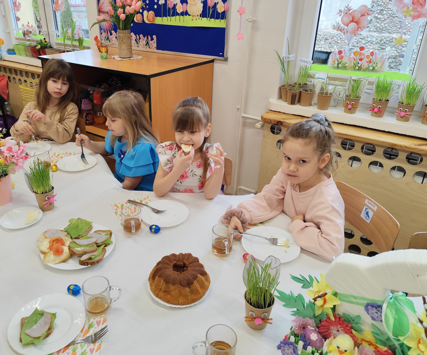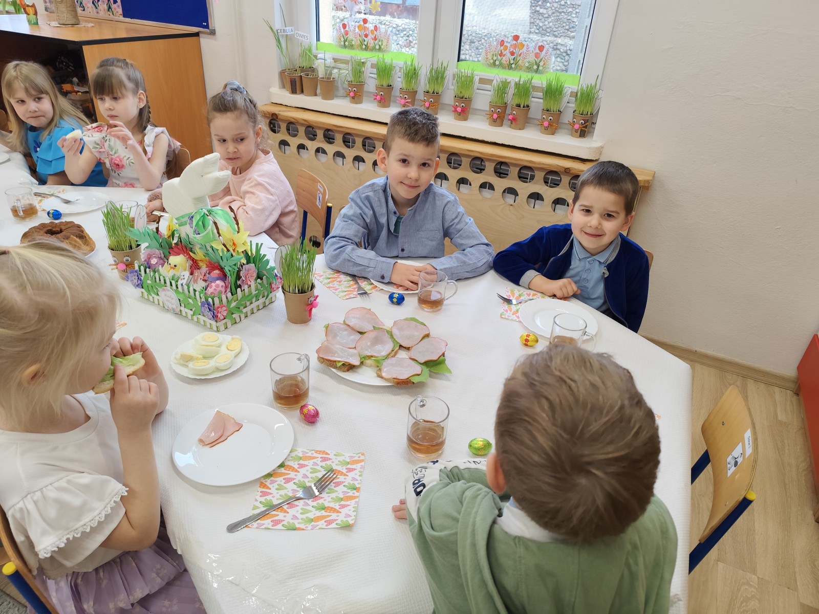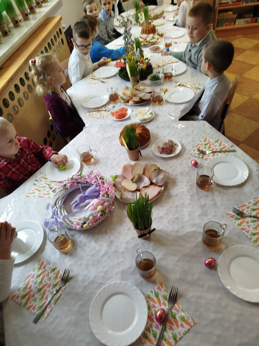 1 kwietnia w naszym przedszkolu odbyło się uroczyste śniadanie wielkanocne. Na świątecznym stole nie mogło zabraknąć jajka, szyneczki, babki wielkanocnej oraz pięknych stroików . Śniadanie zostało rozpoczęte wspólnym składaniem sobie życzeń świątecznych następnie zasiedliśmy do stołu. Spotkanie przy wspólnym świątecznym stole sprawiło dzieciom wiele radości.