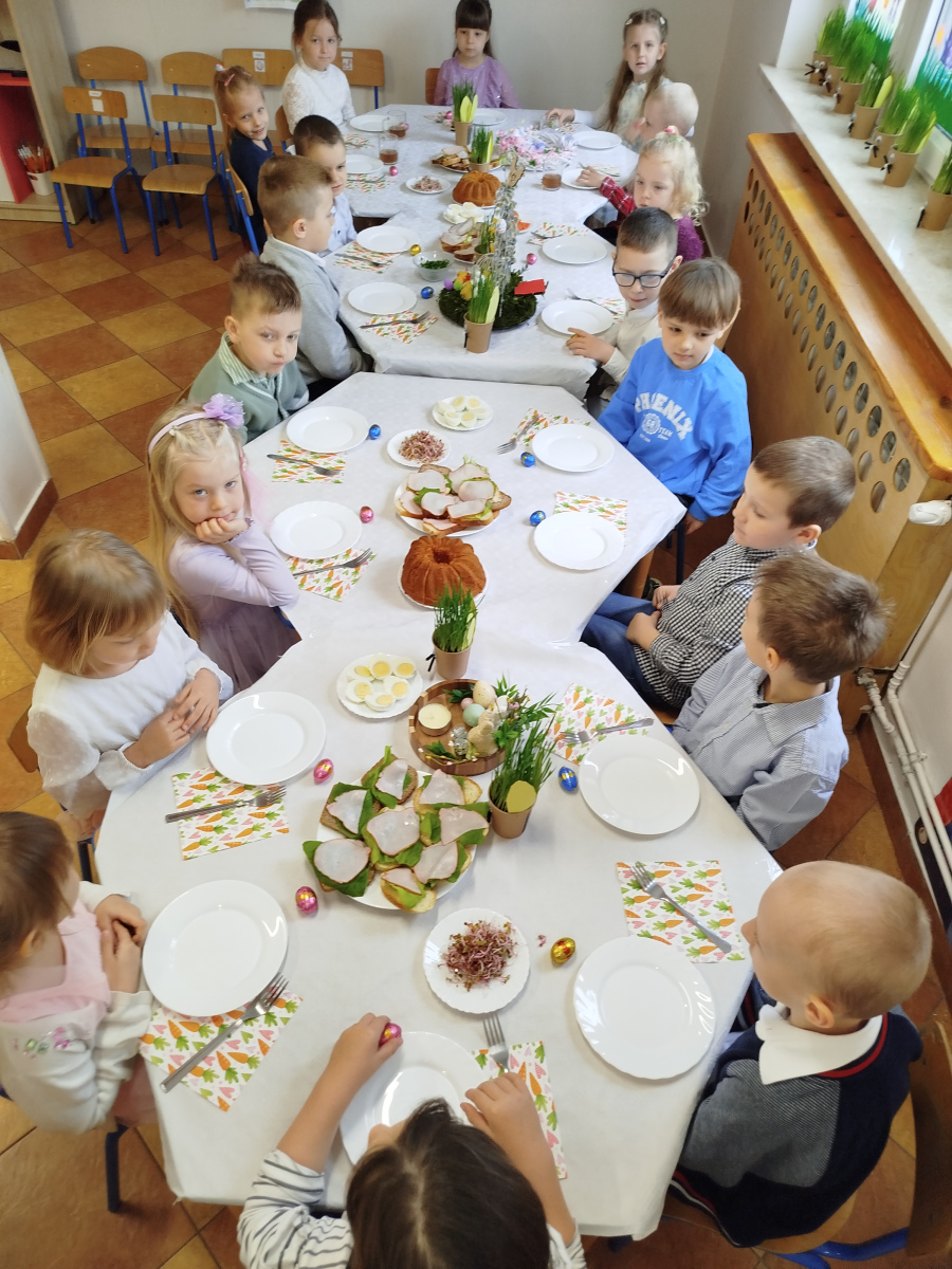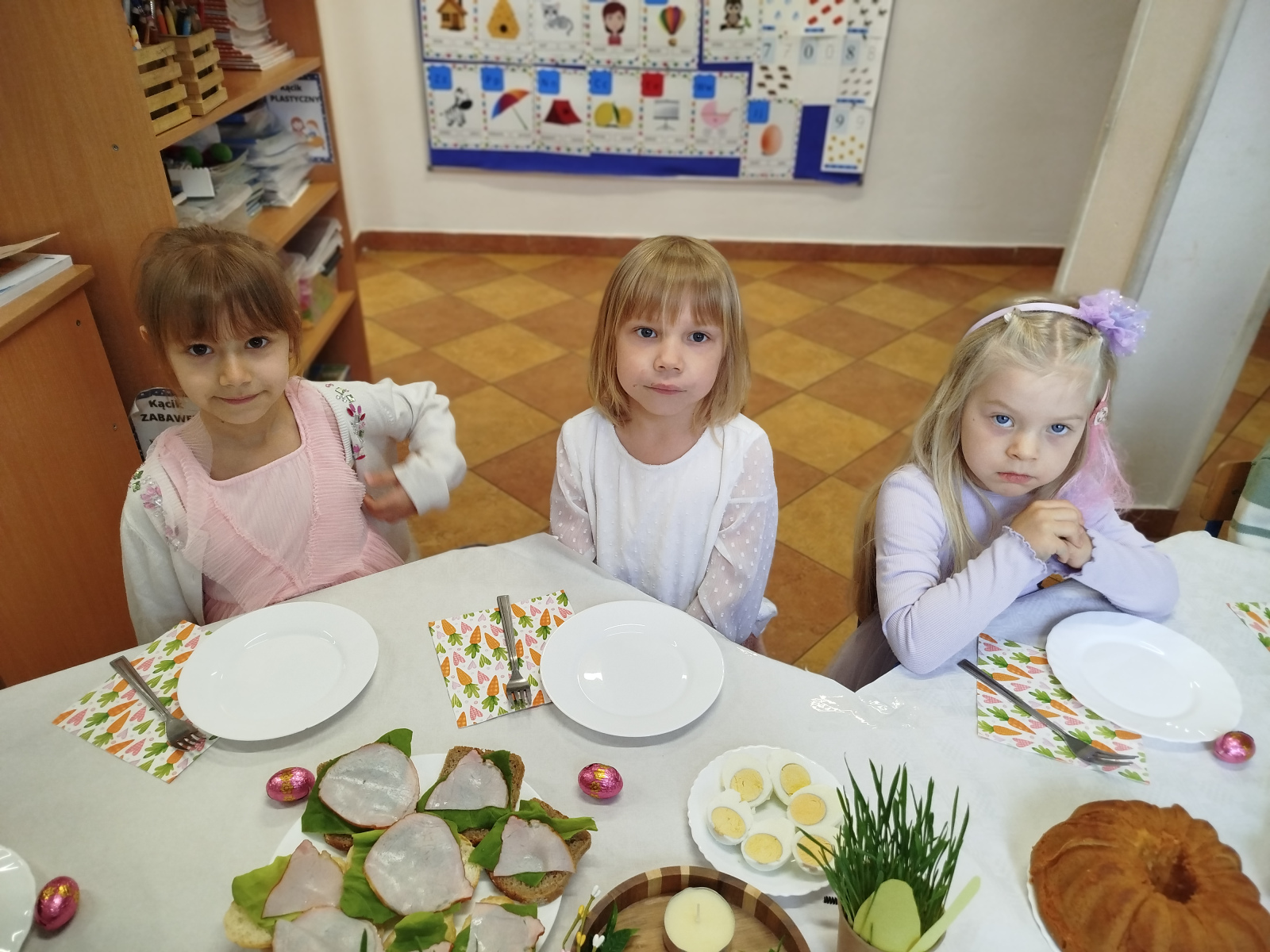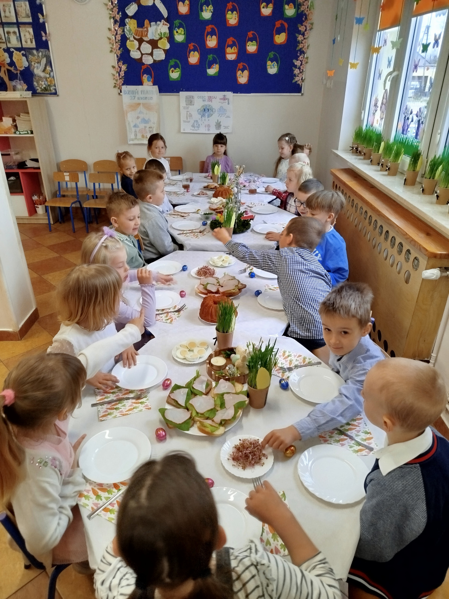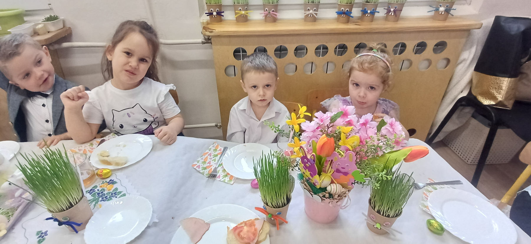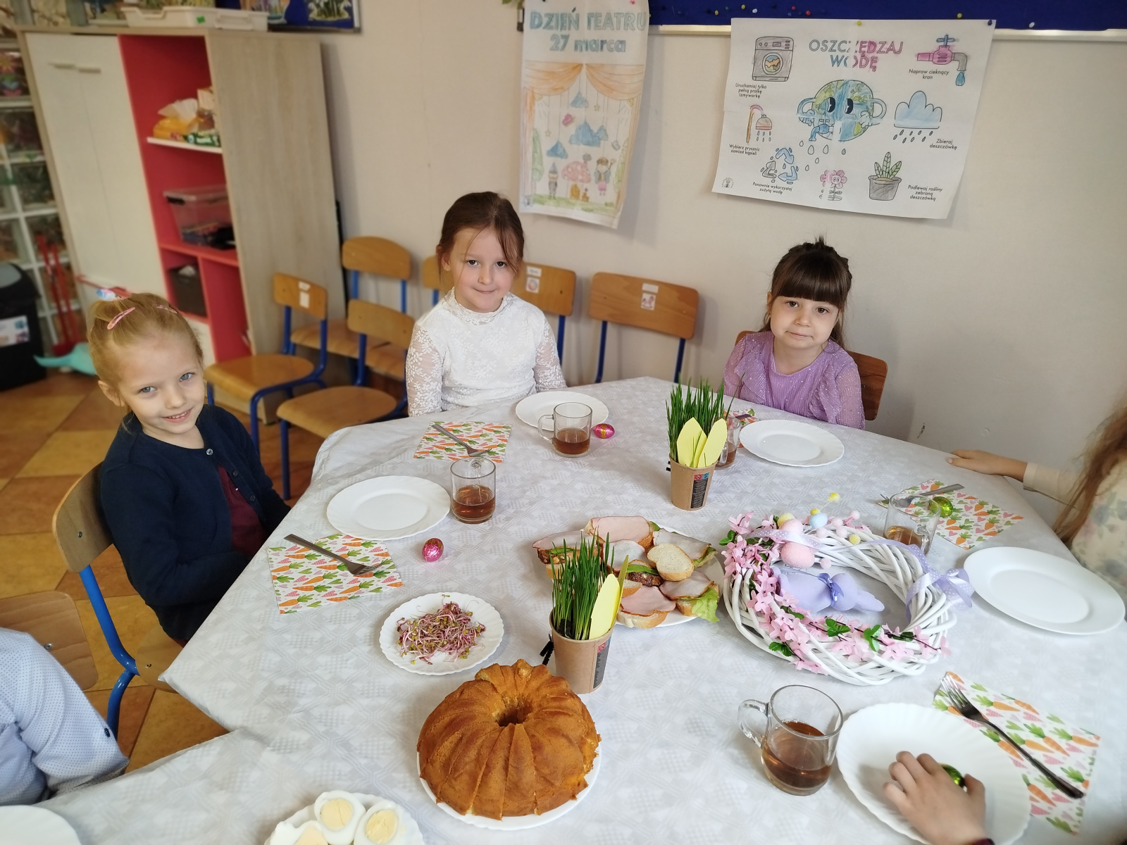 1 kwietnia w naszym przedszkolu odbyło się uroczyste śniadanie wielkanocne. Na świątecznym stole nie mogło zabraknąć jajka, szyneczki, babki wielkanocnej oraz pięknych stroików . Śniadanie zostało rozpoczęte wspólnym składaniem sobie życzeń świątecznych następnie zasiedliśmy do stołu. Spotkanie przy wspólnym świątecznym stole sprawiło dzieciom wiele radości.