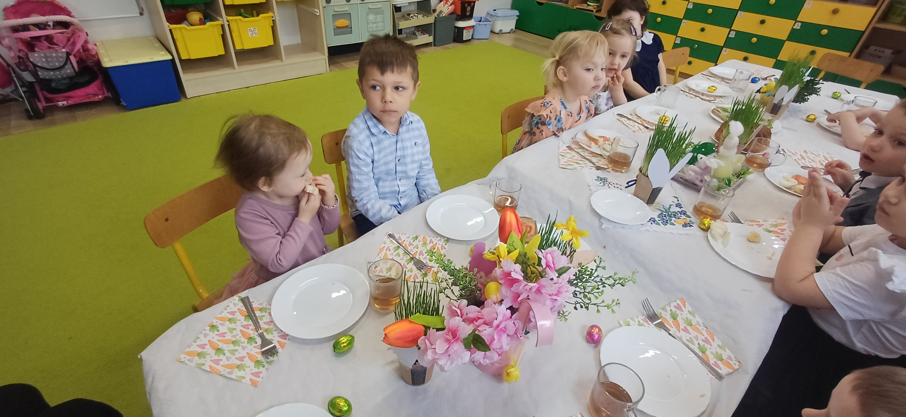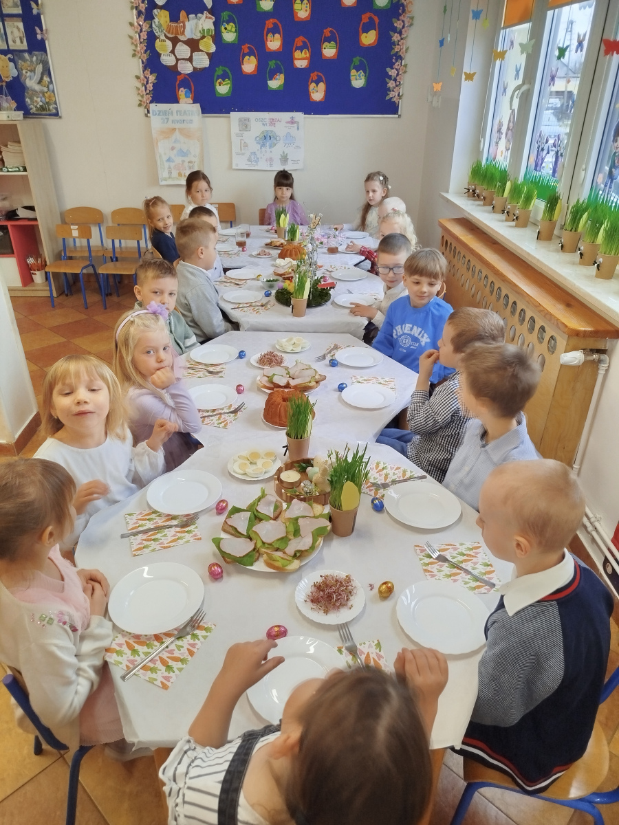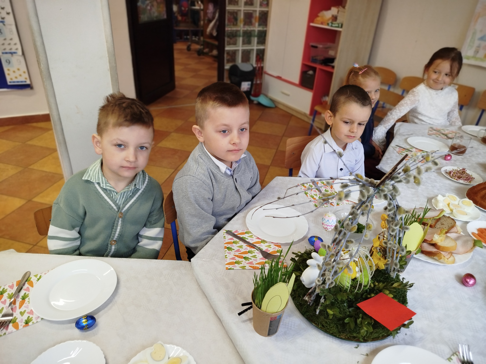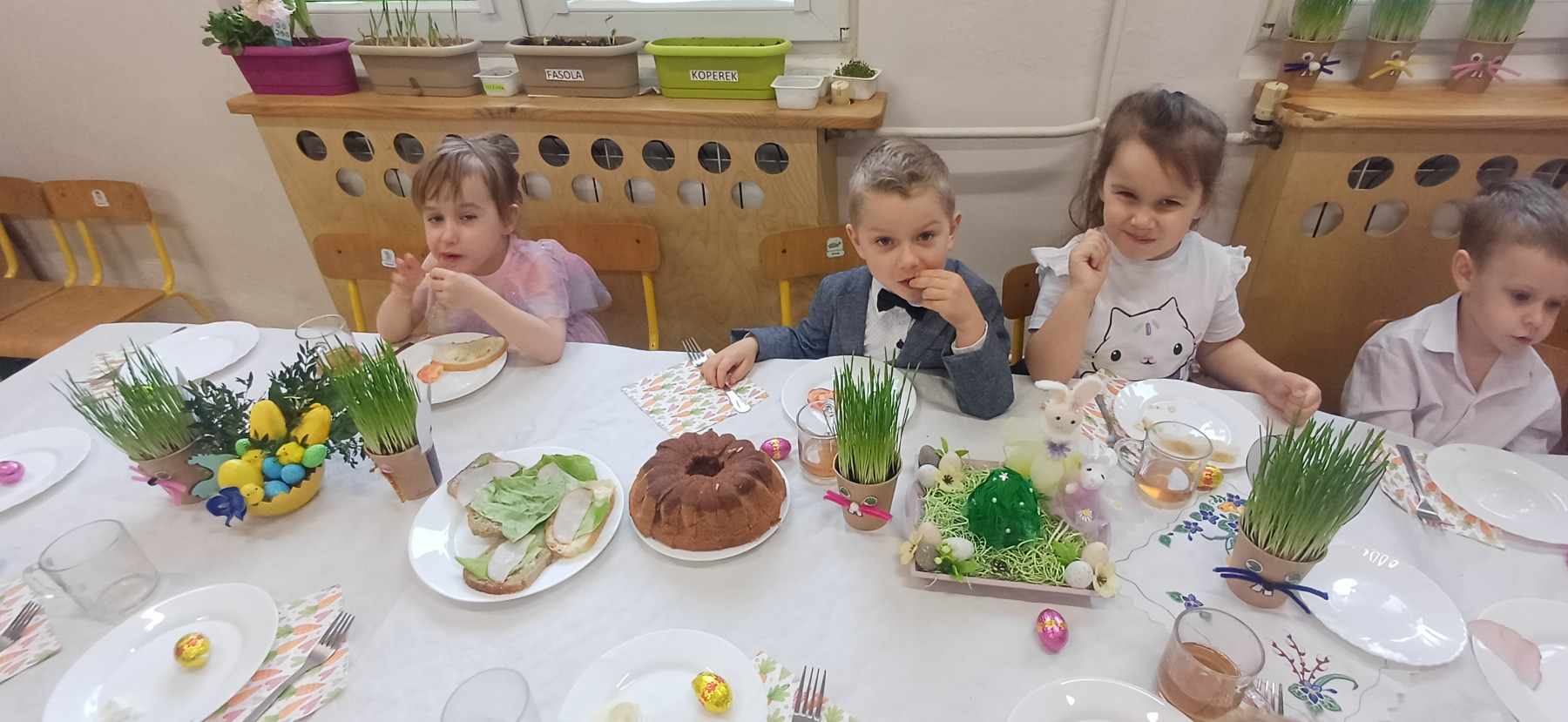 1 kwietnia w naszym przedszkolu odbyło się uroczyste śniadanie wielkanocne. Na świątecznym stole nie mogło zabraknąć jajka, szyneczki, babki wielkanocnej oraz pięknych stroików . Śniadanie zostało rozpoczęte wspólnym składaniem sobie życzeń świątecznych następnie zasiedliśmy do stołu. Spotkanie przy wspólnym świątecznym stole sprawiło dzieciom wiele radości.