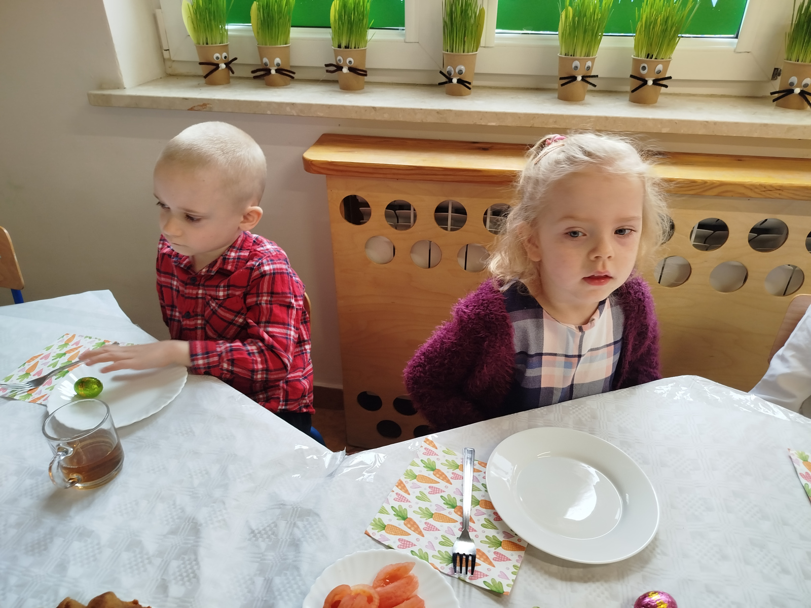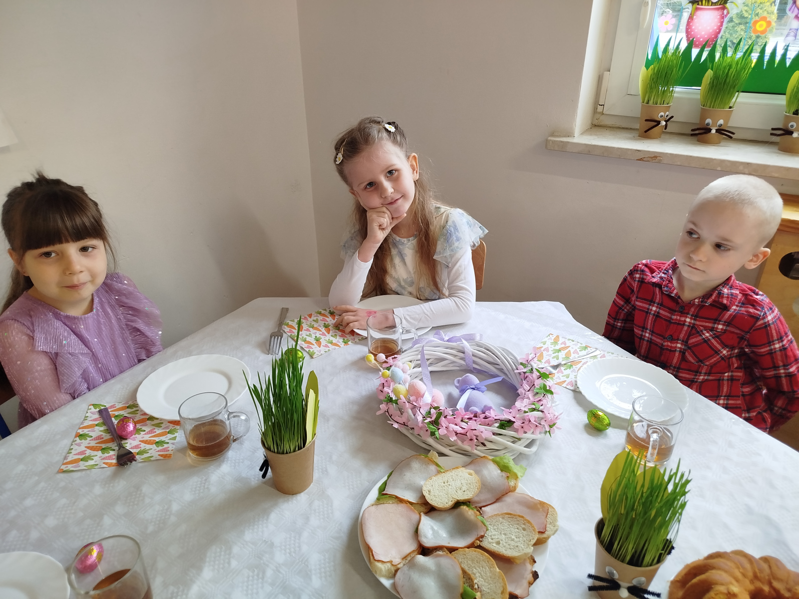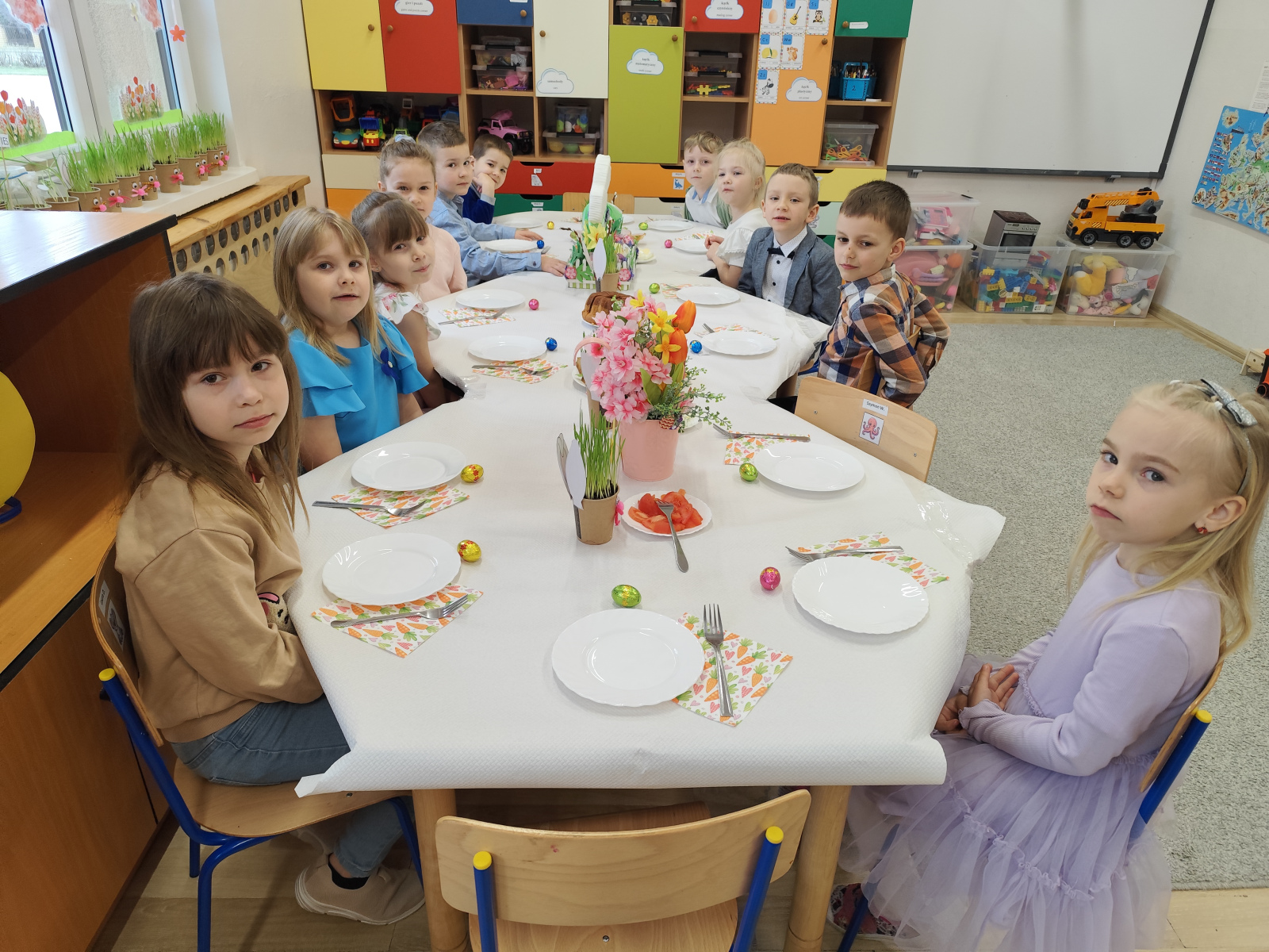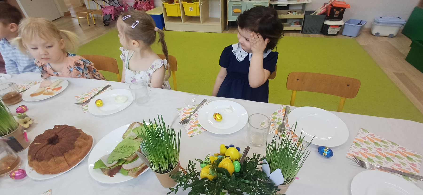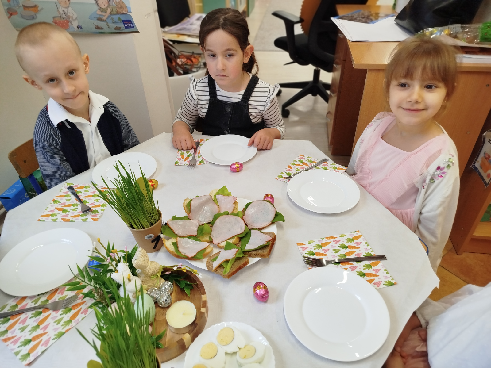 1 kwietnia w naszym przedszkolu odbyło się uroczyste śniadanie wielkanocne. Na świątecznym stole nie mogło zabraknąć jajka, szyneczki, babki wielkanocnej oraz pięknych stroików . Śniadanie zostało rozpoczęte wspólnym składaniem sobie życzeń świątecznych następnie zasiedliśmy do stołu. Spotkanie przy wspólnym świątecznym stole sprawiło dzieciom wiele radości.