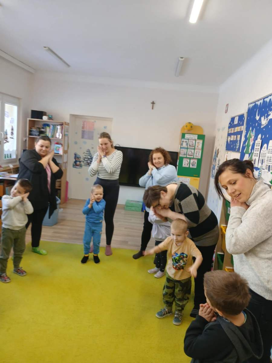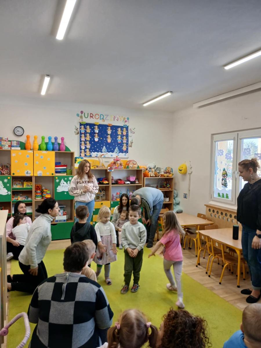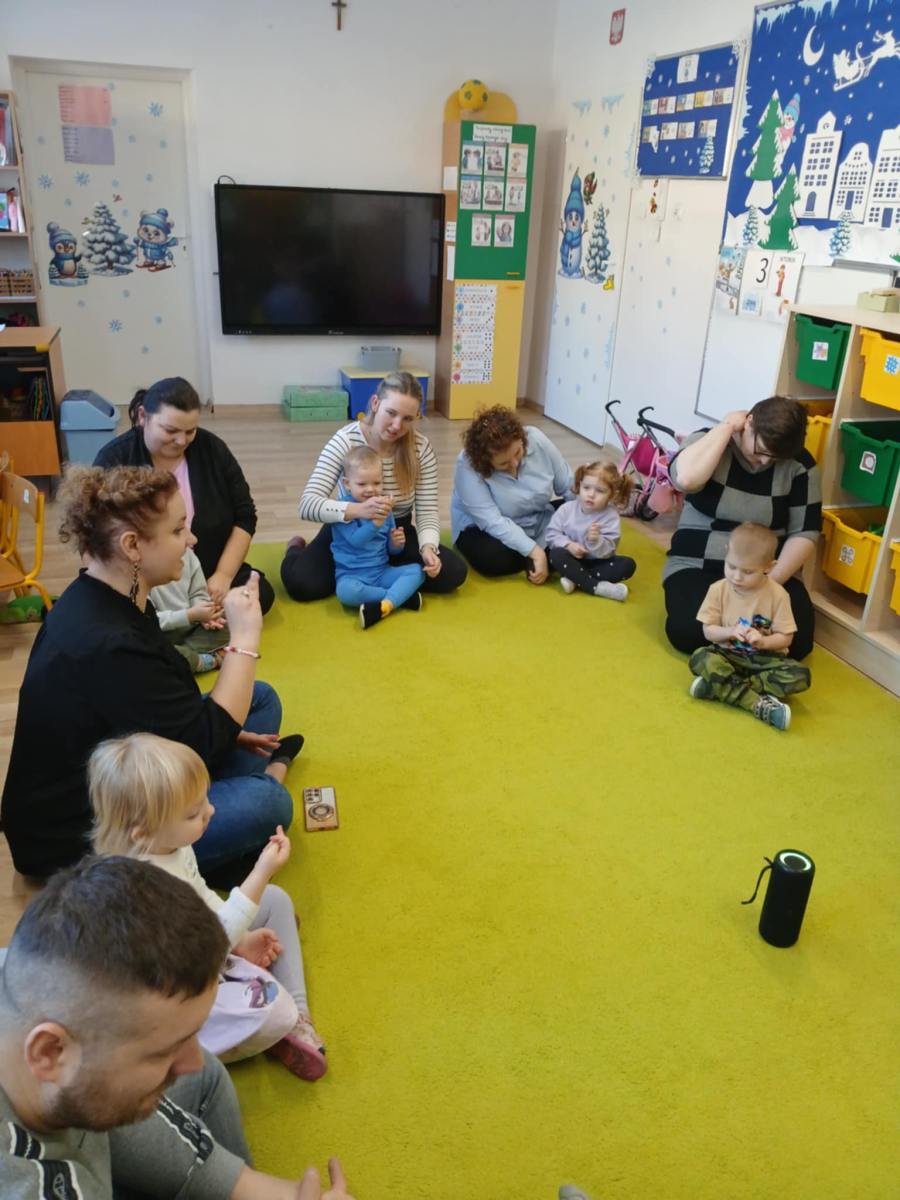 Dzieci wspólnie z Rodzicami brały udział w zabawach ruchowych z pokazywaniem przy muzyce